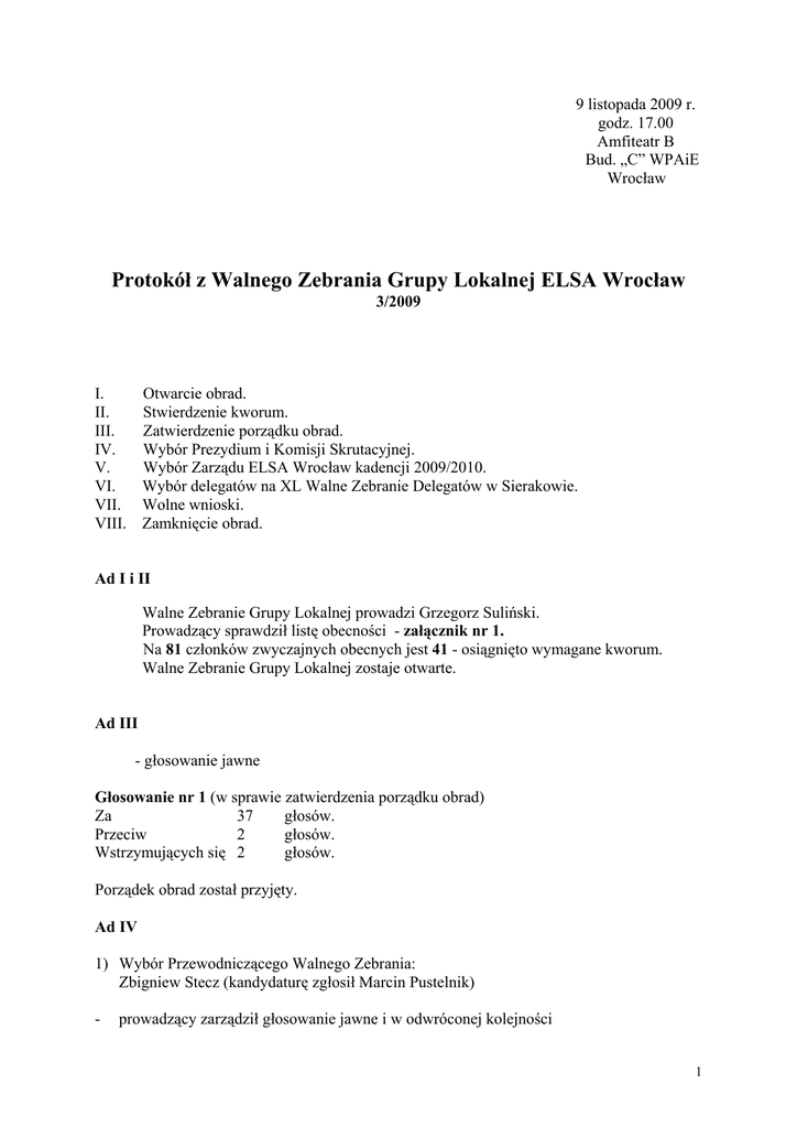 9 listopada 2009 r. godz. 17.00 Amfiteatr B Bud. „C” WPAiE Wrocław Protokół z Walnego Zebrania Grupy Lokalnej ELSA Wrocław 3/2009 I. Otwarcie obrad. II. Stwierdzenie kworum. III. Zatwierdzenie porządku obrad. IV. Wybór Prezydium i Komisji Skrutacyjnej. V. Wybór Zarządu ELSA Wrocław kadencji 2009/2010. VI. Wybór delegatów na XL Walne Zebranie Delegatów w Sierakowie. VII. Wolne wnioski. VIII. Zamknięcie obrad. Ad I i II Walne Zebranie Grupy Lokalnej prowadzi Grzegorz Suliński. Prowadzący sprawdził listę obecności - załącznik nr 1. Na 81 członków zwyczajnych obecnych jest 41 - osiągnięto wymagane kworum. Walne Zebranie Grupy Lokalnej zostaje otwarte. Ad III - głosowanie jawne Głosowanie nr 1 (w sprawie zatwierdzenia porządku obrad) Za 37 głosów. Przeciw 2 głosów. Wstrzymujących się 2 głosów. Porządek obrad został przyjęty. Ad IV 1) Wybór Przewodniczącego Walnego Zebrania: Zbigniew Stecz (kandydaturę zgłosił Marcin Pustelnik) - prowadzący zarządził głosowanie jawne i w odwróconej kolejności 1 Głosowanie nr 2 (dotyczące Zbigniewa Stecza) Przeciw Wstrzymujących się Za 5 6 30 głosów. głosów. głosów. Przewodniczącym Walnego Zebrania został Zbigniew Stecz. 2) Wybór Wiceprzewodniczącego: Marcin Pustelnik (kandydaturę zgłosił Maciej Siedlecki) - Przewodniczący zarządził głosowanie jawne i w odwróconej kolejności Głosowania nr 3 (dotyczące Marcina Pustelnika) Przeciw 13 głosów. Wstrzymujących się 2 głos. Za 26 głosów. Wiceprzewodniczącym został Marcin Pustelnik. 17.20 Przychodzą Kamil Biernat, Agnieszka Sobecka i Joanna Wajdzik. 3) Wybór sekretarzy: 1. Ernest Szydelski (kandydaturę zgłosił Grzegorz Suliński) – nie wyraził zgody na kandydowanie. 2. Joanna Stępień (kandydaturę zgłosił Grzegorz Suliński) – nie wyraziła zgody na kandydowanie. 3. Daria Zawada (kandydaturę zgłosił Piotr Kaczmarzyk). 4. Katarzyna Kaseja (kandydaturę zgłosił Grzegorz Suliński). − Przewodniczący zarządził głosowanie jawne i w odwróconej kolejności Głosowanie nr 4 (dotyczące Darii Zawady) Przeciw 6 głosów. Wstrzymujących się 2 głosy. Za 36 głosów. Głosowanie nr 5 (dotyczące Katarzyny Kaseji) Przeciw 3 głosy. Wstrzymujących się 1 głos. Za 40 głosów. Sekretarzami zostały Daria Zawada i Katarzyna Kaseja. 17.35 Przychodzi Paulina Stefaniuk. 4) Do Komisji Skrutacyjnej: 2 1. Piotr Lubowski (kandydaturę zgłosił Piotr Kaczmarzyk). 2. Piotr Kaczmarzyk (kandydaturę zgłosił Zbigniew Stecz). 3. Michał Walek (kandydaturę zgłosił Zbigniew Stecz). - głosowania tajne Głosowanie nr 6 (dotyczące Piotra Lubowskiego) Oddano 42 głosy. Za 36 głosów. Przeciw 4 głosy. Wstrzymujących się 2 głosy. Głosowanie nr 7 (dotyczące Piotra Kaczmarzyka) Oddano 43 głosy. Za 40 głosów. Przeciw 2 głosy. Wstrzymujących się 1 głos. Głosowanie nr 8 (dotyczące Michała Walka) Oddano 40 głosów. Za 33 głosy. Przeciw 4 głosy. Wstrzymujących się 3 głosy. W skład Komisji Skrutacyjnej wchodzą: Piotr Lubowski, Piotr Kaczmarzyk i Michał Walek. Ad V Wybór Zarządu ELSA Wrocław 2009/2010 17.50 przychodzi Denis Harders i Kamil Kozłowski. Kandydaci do Zarządu ELSA Wrocław 2009/2010 : 1) na Prezesa ELSA Wrocław: Marek Jankowski - Przedstawienie swojego programu – program w załączniku nr 2. 18.00 przychodzi Katarzyna Woźniak. - Otwarcie listy mówców: 1. Piotr Lubowski, 2. Karolina Kołakowska, 3. Maciej Siedlecki, 4. Zbigniew Stecz. 3 - Zamknięcie list mówców. - Pytania do kandydata: 1. P.L.: Czy planowane jest zorganizowanie WZD we Wrocławiu? Jakie inne projekty mogą być zorganizowane we Wrocławiu? Odp.: WZD jest pomysłem, nie wiemy jednak czy zgłosimy się na jesień, czy na wiosnę. Co do pozostałych projektów konkretów brak. 2. K.K.: Kto mógłby być sponsorem strategicznym ELSA? Czym różni się twój program od programu Piotra Kaczmarzyka? Odp.: Znam już doświadczenia Piotra. Istnieje potencjalna lista kandydatów na sponsorów, zamierzamy podjąć starania w tym kierunku jako cały Zarząd. Głównie będą to kancelarie, które mają w tym swój interes. 3. M.S.: Jak zamierzasz polepszyć PR ELSA wśród studentów? Odp.: Zawsze studenci będą mieli zastrzeżenia do stowarzyszeń. Tego nie da się zlikwidować w stu procentach. 4. Z.S.: Jaki jest twoim zdaniem najważniejszy cel statutowy ELSA ewentualnie sposób jego realizacji? Odp.: Edukacja prawnicza. Za najważniejsze uważam maksymalne wykorzystanie możliwości jakie dają praktyki w kancelariach. Przewodniczący zarządził sprawdzenie kworum: Liczba obecnych osób wynosi: 48 osób - Głosowanie tajne Głosowanie nr 9 (dotyczące Marka Jankowskiego) Za 41 głosów. Przeciw 3 głosy. Wstrzymujących się 4 głosy. Prezesem ELSA Wrocław 2009/2010 został Marek Jankowski. - Powołanie Zarządu przez Prezesa ELSA Wrocław. Kandydaci: 1) na Sekretarza Generalnego Mikołaj Burzec - Przedstawienie programu - program w załączniku nr 3. - Otwarcie listy mówców: 1. Karolina Kołakowska, 2. Piotr Kaczmarzyk, 4 3. Adam Zawada, 4. Roksana Dymnicka, 5. Maciej Siedlecki. - Zamknięcie listy mówców. - Pytania do kandydata: 1. K.K.: Co myślisz na temat proponowanego usunięcia z Regulaminu art. 74 dotyczącego obowiązków dyrektorów ds. HR? Odp.: Cały czas śledzę dyskusję na ten temat na forum, nie mam jeszcze zdania odnośnie tej kwestii. 2. P.K.: Wiem, że brałeś udział w licznych wyjazdach ELSA. Co myślisz na temat implementacji niektórych ciekawych rozwiązań z innych GL do naszej? Odp.: Trafne spostrzeżenie, chcę się skupić na początek na pełnej realizacji naszego statutu, a potem wprowadzić ewentualne zmiany. 3. A.Z.: Co myślisz na temat braków w archiwum? Odp.: Nie miałem do tej pory na to wpływu, te braki zawsze były nasza bolączką, postaram się to zmienić. A.Z.: Czy masz na to jakiś pomysł? Odp.: Chciałbym poznać najpierw problemy poprzednich sekretarzy i naprawiać ich błędy. 