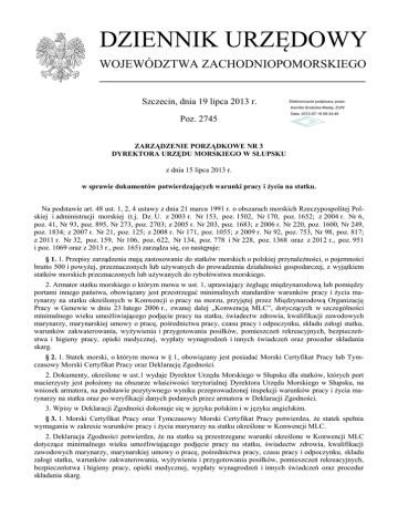 DZIENNIK URZĘDOWY WOJEWÓDZTWA ZACHODNIOPOMORSKIEGO Szczecin, dnia 19 lipca 2013 r. Elektronicznie podpisany przez: Kamilla Grobicka-Madej; ZUW Poz. 2745 Data: 2013-07-19 09:34:49 ZARZĄDZENIE PORZĄDKOWE NR 3 DYREKTORA URZĘDU MORSKIEGO W SŁUPSKU z dnia 15 lipca 2013 r. w sprawie dokumentów potwierdzających warunki pracy i życia na statku. Na podstawie art. 48 ust. 1, 2, 4 ustawy z dnia 21 marca 1991 r. o obszarach morskich Rzeczypospolitej Polskiej i administracji morskiej (t.j. Dz. U. z 2003 r. Nr 153, poz. 1502, Nr 170, poz. 1652; z 2004 r. Nr 6, poz. 41, Nr 93, poz. 895, Nr 273, poz. 2703; z 2005 r. Nr 203, poz. 1683; z 2006 r. Nr 220, poz. 1600, Nr 249, poz. 1834; z 2007 r. Nr 21, poz. 125; z 2008 r. Nr 171, poz. 1055; z 2009 r. Nr 92, poz. 753, Nr 98, poz. 817; z 2011 r. Nr 32, poz. 159, Nr 106, poz. 622, Nr 134, poz. 778 i Nr 228, poz. 1368 oraz z 2012 r., poz. 951 i poz. 1069 oraz z 2013 r., poz. 165) zarządza się, co następuje: § 1. 1. Przepisy zarządzenia mają zastosowanie do statków morskich o polskiej przynależności, o pojemności brutto 500 i powyżej, przeznaczonych lub używanych do prowadzenia działalności gospodarczej, z wyjątkiem statków morskich przeznaczonych lub używanych do rybołówstwa morskiego. 2. Armator statku morskiego o którym mowa w ust. 1, uprawiający żeglugę międzynarodową lub pomiędzy portami innego państwa, obowiązany jest przestrzegać minimalnych standardów warunków pracy i życia marynarzy na statku określonych w Konwencji o pracy na morzu, przyjętej przez Międzynarodową Organizację Pracy w Genewie w dniu 23 lutego 2006 r., zwanej dalej „Konwencją MLC”, dotyczących w szczególności minimalnego wieku umożliwiającego podjęcie pracy na statku, świadectw zdrowia, kwalifikacji zawodowych marynarzy, marynarskiej umowy o pracę, pośrednictwa pracy, czasu pracy i odpoczynku, składu załogi statku, warunków zakwaterowania, wyżywienia i przygotowania posiłków, pomieszczeń rekreacyjnych, bezpieczeństwa i higieny pracy, opieki medycznej, wypłaty wynagrodzeń i innych świadczeń oraz procedur składania skarg. § 2. 1. Statek morski, o którym mowa w § 1, obowiązany jest posiadać Morski Certyfikat Pracy lub Tymczasowy Morski Certyfikat Pracy oraz Deklarację Zgodności. 2. Dokumenty, określone w ust.1 wydaje Dyrektor Urzędu Morskiego w Słupsku dla statków, których port macierzysty jest położony na obszarze właściwości terytorialnej Dyrektora Urzędu Morskiego w Słupsku, na wniosek armatora, na podstawie pozytywnego wyniku przeprowadzonej inspekcji warunków pracy i życia marynarzy na statku oraz po weryfikacji danych podanych przez armatora w Deklaracji Zgodności. 3. Wpisy w Deklaracji Zgodności dokonuje się w języku polskim i w języku angielskim. § 3. 1. Morski Certyfikat Pracy oraz Tymczasowy Morski Certyfikat Pracy potwierdza, że statek spełnia wymagania w zakresie warunków pracy i życia marynarzy na statku określone w Konwencji MLC. 2. Deklaracja Zgodności potwierdza, że na statku są przestrzegane warunki określone w Konwencji MLC dotyczące minimalnego wieku umożliwiającego podjęcie pracy na statku, świadectw zdrowia, kwalifikacji zawodowych marynarzy, marynarskiej umowy o pracę, pośrednictwa pracy, czasu pracy i odpoczynku, składu załogi statku, warunków zakwaterowania, wyżywienia i przygotowania posiłków, pomieszczeń rekreacyjnych, bezpieczeństwa i higieny pracy, opieki medycznej, wypłaty wynagrodzeń i innych świadczeń oraz procedur składania skarg. Dziennik Urzędowy Województwa Zachodniopomorskiego –2– Poz. 2745 § 4. 1. Morski Certyfikat Pracy oraz Deklarację Zgodności wydaje się na okres nieprzekraczający 12 miesięcy, jednak nie dłuższy niż do dnia 20 sierpnia 2014 r. 2. Tymczasowy Morski Certyfikat Pracy wydaje się na okres niezbędny do uzyskania Morskiego Certyfikatu Pracy nie dłuższy niż 6 miesięcy. Okres ten nie może być przedłużony. § 5. Tymczasowy Morski Certyfikat Pracy wydaje się dla statku: 1) nowo zbudowanego, po oddaniu go do eksploatacji; 2) który zmienił przynależność; 3) na którym armator przejął odpowiedzialność za jego eksploatację. § 6. 1. Morski Certyfikat Pracy oraz Tymczasowy Morski Certyfikat Pracy traci ważność, jeżeli: 1) statek zmienił przynależność; 2) armator przestał być odpowiedzialny za eksploatację statku; 3) zostały dokonane znaczące zmiany w konstrukcji lub wyposażeniu statku. 2. Dyrektor Urzędu Morskiego w Słupsku może unieważnić wydany dla statku Morski Certyfikat Pracy, jeżeli nie spełnia on postanowień Konwencji MLC, a armator nie podjął wymaganych środków naprawczych. § 7. Wzór: 1) Morskiego Certyfikatu Pracy określa załącznik nr 1 do niniejszego zarządzenia porządkowego; 2) Tymczasowego Morskiego Certyfikatu Pracy, określa załącznik nr 2 do niniejszego zarządzenia porządkowego; 3) Deklaracji Zgodności określa załącznik nr 3 do niniejszego zarządzenia porządkowego. § 8. Deklarację Zgodności dołącza się do Morskiego Certyfikatu Pracy. § 9. Dokumenty, określone w § 2 ust.1 armator statku obowiązany jest: 1) przechowywać na statku w oryginale; 2) umieścić ich kopie na statku w widocznym i dostępnym dla marynarzy miejscu. § 10. Zarządzenie wchodzi w życie z dniem 1 sierpnia 2013 roku i podlega ogłoszeniu w Dziennikach Urzędowych: Województwa Pomorskiego i Województwa Zachodniopomorskiego. Dyrektor Urzędu Morskiego w Słupsku Tomasz Bobin Dziennik Urzędowy Województwa Zachodniopomorskiego –3– Poz. 2745 Załącznik Nr 1 do Zarządzenia Porządkowego Nr 3 Dyrektora Urzędu Morskiego w Słupsku z dnia 15 lipca 2013 r. WZÓR RZECZPOSPOLITA POLSKA REPUBLIC OF POLAND MORSKI CERTYFIKAT PRACY MARITIME LABOUR CERTIFICATE Nr / No.: Wydany na podstawie przepisów zawartych w Artykule V i Tytule 5 Konwencji o pracy na morzu z 2006 roku (zwanej dalej Konwencją) Issued under the provisions of Article V and Title 5 of the M