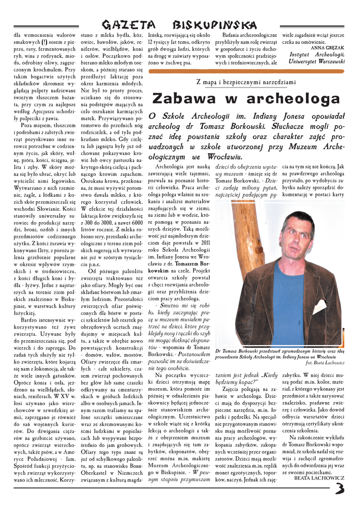 dla wzmocnienia walorów smakowych (!) sosem z pieprzu, ruty, fermentowanych ryb, wina z rodzynek, miodu, odrobiny oliwy, zagęszczonym krochmalem. Przy takim bogactwie użytych składników skromnie wyglądają pulpety nadziewane świeżym tłuszczem bażanta, przy czym za najlepsze według Apicjusza uchodziły pulpeciki z pawia. Poza mięsem, tłuszczem i podrobami z zabitych zwierząt pozyskiwano inne surowce potrzebne w codziennym życiu, jak skóry, wełnę, pióra, kości, ścięgna, jelita i zęby. W skóry można się było ubrać, okryć lub wyścielić nimi legowisko. Wytwarzano z nich rzemienie, żagle, a łódkami z kozich skór przemieszczali się wschodni Słowianie. Kości stanowiły uniwersalny surowiec do produkcji narzędzi, broni, ozdób i innych przedmiotów codziennego użytku. Z kości żurawia wykonywano flety, z poroża jelenia grzebienie popularne w okresie wpływów rzymskich i w średniowieczu, z kości długich koni i bydła - łyżwy. Jedne z najstarszych na terenie ziem polskich znaleziono w Biskupinie, w warstwach kultury łużyckiej. Bardzo intensywnie wykorzystywano też żywe zwierzęta. Używane były do przemieszczania się, pod wierzch i do zaprzęgu. Do zadań tych służyły nie tylko zwierzęta, które kojarzą się nam z lokomocją, ale także wiele innych gatunków. Oprócz konia i osła, jeżdżono na wielbłądach, słoniach, reniferach. W XV w. łosi używano jako wierzchowców w szwedzkiej armii, zaprzęgano je również do sań wojennych kurierów. Do dźwigania ciężarów na grzbiecie używano, oprócz zwierząt wierzchowych, także psów, a w Ameryce Południowej - lam. Spośród funkcji przyżyciowych zwierząt wykorzystywano ich mleczność. Korzy- stano z mleka bydła, kóz, owiec, bawołów, jaków, reniferów, wielbłądów, koni i osłów. Początkowo podbierano mleko młodym oseskom, a później starano się przedłużyć laktację poza okres karmienia młodych. Nie był to prosty proces, uciekano się do stosowania podstępów mających na celu oszukanie karmiących matek. Przywiązywano potomstwo do przednich nóg rodzicielek, a od tyłu podkradano mleko. Gdy cielęta lub jagnięta były już odchowane pokazywano krowie lub owcy pastuszka nakrytego skórą cielęcą i pachnącego krowim zapachem. Oszukana krowa, przekonana, że musi wyżywić potomstwo dawała mleko, z którego korzystał człowiek. W efekcie tej działalności laktacja krów zwiększyła się z 300 do 3000, a nawet 6000 litrów rocznie. Z mleka robiono sery, przesłanki archeologiczne z terenu ziem polskich sugerują ich wytwarzanie już w szóstym tysiącleciu p.n.e. Od późnego paleolitu zwierzęta traktowano też jako ofiary. Mogły być one składane bóstwom lub zmarłym ludziom. Pozostałości zwierzęcych ofiar poświęconych dla bóstw w postaci szkieletów lub resztek po obrzędowych ucztach znajdujemy w miejscach kultu, a także w obrębie nowo powstających konstrukcji - domów, wałów, mostów. Ofiary zwierzęce dla zmarłych - całe szkielety, czasem zwierząt pochowanych bez głów lub same czaszki odkrywamy na cmentarzyskach w grobach ludzkich albo w osobnych jamach. Innym razem trafiamy na spalone szczątki umieszczane wraz ze skremowanymi kośćmi ludzkimi w popielnicach lub wsypywane bezpośrednio do jam grobowych. Ofiary tego typu znane są już od schyłkowego paleolitu, np. na stanowisku BonnOberkastel w Niemczech związanym z kulturą magda- leńską, rozwijającą się około 12 tysięcy lat temu, odkryto grób dwojga ludzi, których na drogę w zaświaty wyposażono w żuchwę psa. Badania archezoologiczne wiele zagadnień wciąż jeszcze przybliżyły nam rolę zwierząt czeka na omówienie. ANNA GRĘZAK w gospodarce i życiu duchoInstytut Archeologii, wym społeczności pradziejoUniwersytet Warszawski wych i średniowiecznych, ale Z mapą i bezpiecznymi narzędziami Zabawa w archeologa O Szkole Archeologii im. Indiany Jonesa opowiadał archeolog dr Tomasz Borkowski. Słuchacze mogli poznać ideę powstania szkoły oraz charakter zajęć prowadzonych w szkole utworzonej przy Muzeum Archeologicznym we Wrocławiu. Archeologia jest nauką zawierającą wiele tajemnic, pozwala na poznanie historii człowieka. Praca archeologa polega właśnie na szukaniu i analizie materiałów znajdujących się w ziemi, na ziemi lub w wodzie, które pomogą w poznaniu naszych dziejów. Taką możliwość już najmłodszym dzieciom daje powstała w 2011 roku Szkoła Archeologii im. Indiany Jonesa we Wrocławiu z dr. Tomaszem Borkowskim na czele. Projekt otwarcia szkoły powstał z chęci rozwijania archeologii oraz przybliżenia dzieciom pracy archeologa. - Smutno mi się robiło, kiedy zaczynając pracę w muzeum musiałem patrzeć na dzieci, które przyklejały nosy i rączki do szyb nie mogąc dotknąć eksponatów - wspomina dr Tomasz Borkowski. - Postanowiłem pozwolić im na doświadczenie tego osobiście. Na początku wycieczki dzieci otrzymują mapę muzeum, która pomoże im później w odnalezieniu piaskownicy będącej jednocześnie stanowiskiem archeologicznym. Uczestnictwo w szkole wiąże się z krótką lekcją o archeologii a także z obejrzeniem muzeum i znajdujących się tam zabytków, eksponatów, obejrzeć można m.in. makietę Muzeum Archeologicznego w Biskupinie. - W pewnym stopniu przymuszam dzieci do obejrzenia wystawy muzeum - śmieje się dr Tomasz Borkowski. - Dzieci zadają miliony pytań, najczęściej padającym py- cia na tym się nie kończą. Jak na prawdziwego archeologa przystało, po wydobyciu zabytku należy sporządzić dokumentację w postaci karty Dr Tomasz Borkowski przedstawił zgromadzonym historię oraz ideę prowadzenia Szkoły Archeologii im. Indiany Jonesa we Wrocławiu fot. Beata Lachowicz taniem jest jednak „Kiedy będziemy kopać?” Zajęcia polegają na zabawie w archeologa. Dzieci mają do dyspozycji bezpieczne narzędzia, m.in. łopatki i pędzelki. Na specjalnie przygotowanym stanowisku mają możl