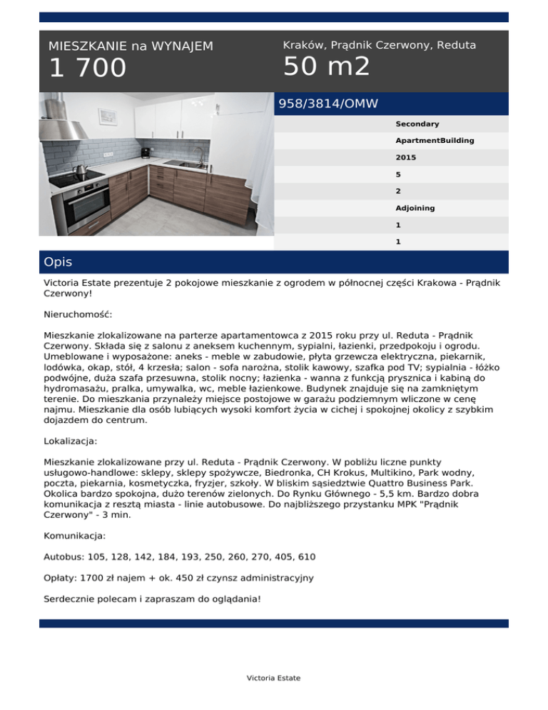 Kraków, Prądnik Czerwony, Reduta MIESZKANIE na WYNAJEM 50 m2 1 700 958/3814/OMW Secondary ApartmentBuilding 2015 5 2 Adjoining 1 1 Opis Victoria Estate prezentuje 2 pokojowe mieszkanie z ogrodem w północnej części Krakowa - Prądnik Czerwony! Nieruchomość: Mieszkanie zlokalizowane na parterze apartamentowca z 2015 roku przy ul. Reduta - Prądnik Czerwony. Składa się z salonu z aneksem kuchennym, sypialni, łazienki, przedpokoju i ogrodu. Umeblowane i wyposażone: aneks - meble w zabudowie, płyta grzewcza elektryczna, piekarnik, lodówka, okap, stół, 4 krzesła; salon - sofa narożna, stolik kawowy, szafka pod TV; sypialnia - łóżko podwójne, duża szafa przesuwna, stolik nocny; łazienka - wanna z funkcją prysznica i kabiną do hydromasażu, pralka, umywalka, wc, meble łazienkowe. Budynek znajduje się na zamkniętym terenie. Do mieszkania przynależy miejsce postojowe w garażu podziemnym wliczone w cenę najmu. Mieszkanie dla osób lubiących wysoki komfort życia w cichej i spokojnej okolicy z szybkim dojazdem do centrum. Lokalizacja: Mieszkanie zlokalizowane przy ul. Reduta - Prądnik Czerwony. W pobliżu liczne punkty usługowo-handlowe: sklepy, sklepy spożywcze, Biedronka, CH Krokus, Multikino, Park wodny, poczta, piekarnia, kosmetyczka, fryzjer, szkoły. W bliskim sąsiedztwie Quattro Business Park. Okolica bardzo spokojna, dużo terenów zielonych. Do Rynku Głównego - 5,5 km. Bardzo dobra komunikacja z resztą miasta - linie autobusowe. Do najbliższego przystanku MPK "Prądnik Czerwony" - 3 min. Komunikacja: Autobus: 105, 128, 142, 184, 193, 250, 260, 270, 405, 610 Opłaty: 1700 zł najem + ok. 450 zł czynsz administracyjny Serdecznie polecam i zapraszam do oglądania! Victoria Estate Natalia Sujdak tel. +48 516 547 102 email: [email protected] Victoria Estate Powered by TCPDF (www.tcpdf.org)