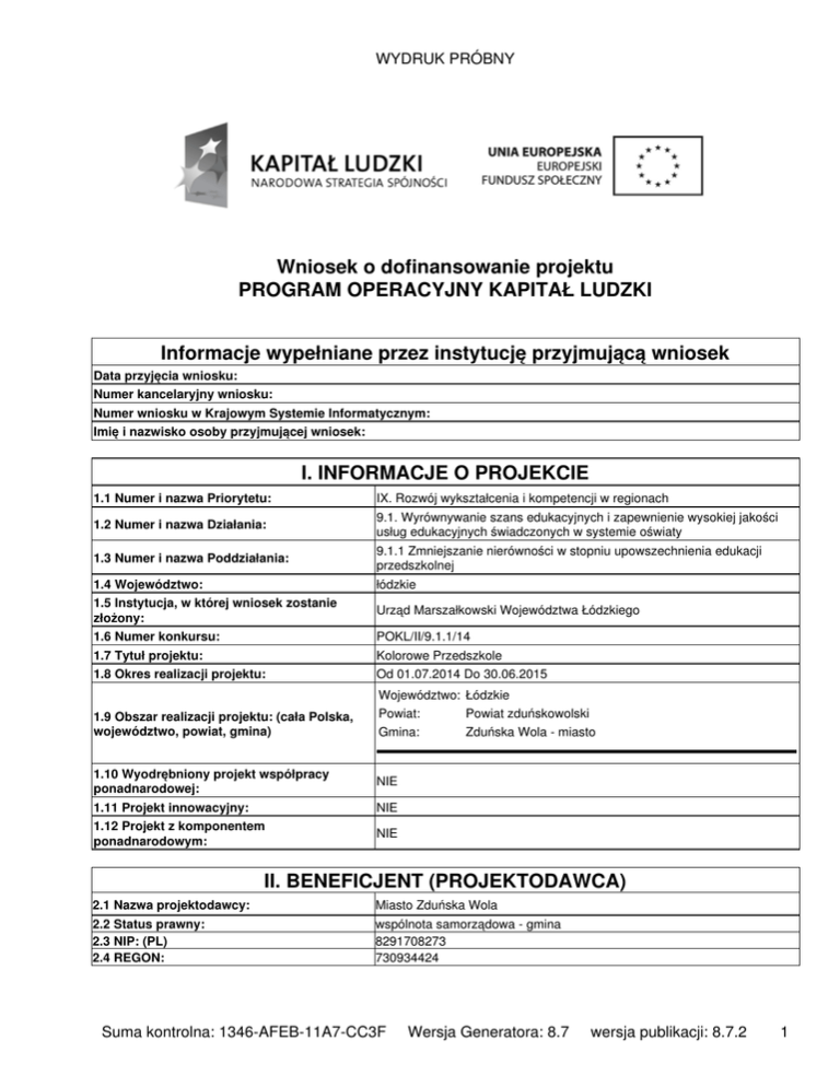 WYDRUK PRÓBNY Wniosek o dofinansowanie projektu PROGRAM OPERACYJNY KAPITAŁ LUDZKI Informacje wypełniane przez instytucję przyjmującą wniosek Data przyjęcia wniosku: Numer kancelaryjny wniosku: Numer wniosku w Krajowym Systemie Informatycznym: Imię i nazwisko osoby przyjmującej wniosek: I. INFORMACJE O PROJEKCIE 1.1 Numer i nazwa Priorytetu: IX. Rozwój wykształcenia i kompetencji w regionach 1.2 Numer i nazwa Działania: 9.1. Wyrównywanie szans edukacyjnych i zapewnienie wysokiej jakości usług edukacyjnych świadczonych w systemie oświaty 1.3 Numer i nazwa Poddziałania: 9.1.1 Zmniejszanie nierówności w stopniu upowszechnienia edukacji przedszkolnej 1.4 Województwo: łódzkie 1.5 Instytucja, w której wniosek zostanie złożony: Urząd Marszałkowski Województwa Łódzkiego 1.6 Numer konkursu: POKL/II/9.1.1/14 1.7 Tytuł projektu: Kolorowe Przedszkole 1.8 Okres realizacji projektu: Od 01.07.2014 Do 30.06.2015 Województwo: Łódzkie 1.9 Obszar realizacji projektu: (cała Polska, województwo, powiat, gmina) Powiat: Powiat zduńskowolski Gmina: Zduńska Wola - miasto 1.10 Wyodrębniony projekt współpracy ponadnarodowej: NIE 1.11 Projekt innowacyjny: NIE 1.12 Projekt z komponentem ponadnarodowym: NIE II. BENEFICJENT (PROJEKTODAWCA) 2.1 Nazwa projektodawcy: Miasto Zduńska Wola 2.2 Status prawny: 2.3 NIP: (PL) 2.4 REGON: wspólnota samorządowa - gmina 8291708273 730934424 Suma kontrolna: 1346-AFEB-11A7-CC3F Wersja Generatora: 8.7 wersja publikacji: 8.7.2 1 WYDRUK PRÓBNY 2.5 Adres siedziby: 2.6 Osoba/y uprawniona/e do podejmowania decyzji wiążących w imieniu projektodawcy: 2.7 Osoba do kontaktów roboczych: 2.7.1 Numer telefonu: 2.7.2 Adres poczty elektronicznej: 2.7.3 Numer faksu: 2.7.4 Adres: 2.8 Partnerzy: Ulica: Złotnickiego Nr domu: 12 Nr lokalu: - Miejscowość: Zduńska Wola Kod pocztowy: 98-220 Telefon: 438250201 Fax: 438250202 Prezydent Miasta Zduńska Wola, Pan Piotr Niedźwiecki (reprezentuje jednoosobowo) Violetta Bryl-Szlagowska 506223282 [email protected] 438250202 Złotnickiego 12 NIE Suma kontrolna: 1346-AFEB-11A7-CC3F Wersja Generatora: 8.7 wersja publikacji: 8.7.2 2 WYDRUK PRÓBNY III. CHARAKTERYSTYKA PROJEKTU (maksymalnie 20 000 znaków) 3.1 Uzasadnienie potrzeby realizacji i cele projektu 1. Uzasadnij potrzebę realizacji projektu 2. Wskaż cel główny oraz cele szczegółowe projektu 3. Określ, w jaki sposób mierzona będzie realizacja celów (ustal wskaźniki pomiaru celów) 4. Określ wartość obecną wskaźnika (stan wyjściowy projektu) i wartość docelową wskaźnika (której osiągnięcie będzie uznane za zrealizowanie danego celu) 5. Określ, w jaki sposób i na jakiej podstawie mierzone będą wskaźniki realizacji poszczególnych celów (ustal źrodło weryfikacji/pozyskania danych do pomiaru wskaźnika oraz częstotliwość pomiaru) 3.1.1 Uzasadnienie potrzeby realizacji projektu 1. Wskaż problem, na ktory odpowiedź stanowi cel główny projektu 2. Przedstaw opis sytuacji problemowej, do której odnosi się projekt (z uwzględnieniem sytuacji kobiet i mężczyzn), uwzględniając dane statystyczne odnoszące się do obszaru realizacji projektu 3. Przedstaw dostępne dane statystyczne uzasadniające cel główny projektu 4. Opisz wpływ, jaki realizacja projektu może mieć na podmioty inne niż grupa docelowa Eduk. przedszk. ma ogromne znaczenie dla perspektyw dalszego kształcenia społ-a. Istnieje wyraźny związek między doświadcz. edukac. zdobytym w przedszkolu, a osiągnięciami szkolnymi. Dzieci objęte wczesną edukacją przedszk. znacznie częściej odnoszą sukcesy w toku dalszej edukacji, a później na rynku pracy /bad.ORE/. Zatem, edukacja przedszk. ma fundament. znaczenie dla jakości kapitału ludzk. kraju i każde dziecko powinno mieć do niej dostęp Projekt wspierający Publ.Przedszk. nr 9 w zakresie wygenerowania dodatk. miejsc przedszk. skierow. jest do gr. docel. z obszaru woj. łódzkiego. Wg danych GUS w roku szk. 2012/2013 wskaźnik upowszechniania edukacji przedszkj wśród dzieci 3-5-letnich w woj. łódzkim kształtował się na poziomie 70,92%, a w Zd.Woli – na poziomie 71,94%. Natomiast, w roku szk. 2013/14 do przedszkoli w mieście uczęszczało 922dz. (461dz/461ch) w wieku 3-5 lat, przy populacji 1491dz.(721dz/770ch)-dane z UM Zd-Wola/, wskaźnik upowszechnienia eduk. przedszk. wynosił 64%. Brak miejsc w przedszk. powoduje, ze dzieci pozbawione są edukacji przedszk, a tym samym - równego startu do szkoły z rówieśnikami, którzy uczęszczają do przedszk. W r. szk. 2014/15 w mieście będzie 1437 (698dz/739ch) dzieci w wieku 3-5 lat: 3-latków – 428(198dz/230ch), 4-ów 522(273dz/249ch) i 5-ów 487(227dz/260ch); w r.szk. 2015/16 będzie 1407(707dz/700ch)dzieci: 3-ów – 457(236dz/221ch), 4-ów 428(198dz/230ch), 5-ów 522(273dz/249ch), a miejsc w przedszkolach jest tylko 1183, dlatego miasto tworzy dodatkowe miejsca w PP nr 9, które w roku 2014 utworzy ze Szkołą Podst. nr 6, Zespół /ZSP nr 1/. Dotychczas PP nr 9 mieściło się w bloku, były tam dwa oddziały przedszkolne po 18 dz, razem 36 dz. Postanowiono do SP nr 6 dobudować 3 sale i adoptować jedną salę SP nr 6 na potrzeby PP nr 9 i uzyskać 100 miejsc przedszk., czyli dodatkowo 64 miejsca dla dzieci w wieku 3-5 lat (dwa nowe oddziały po 25 miejsc i ilościowe powiększenie dotychczas. oddz. z 18 do 25 miejsc). Zespół ma swój rejon, w rejonie ZSP nr 1 mamy następ. sytuac. demograf:w r. szk. 2014/15 będzie 256(110dz/74ch)dzieci, w tym 3-latków 72(32dz/40ch), 4-ów 105(55dz/50ch), 5-ów 79dz(34dz/45ch), a w r. 2015/16: 263 (128/135)dz., w tym 3-latków 86(41dz/45ch), 4-ów 72(32dz/40ch), 5-ów 105(55dz/50ch). jak widzimy w rejonie ZSP nr 1 bardzo dużo dzieci czeka na przedszkole. W tym roku w marcu i maju były nabory do przedszkoli, do SP nr 9 wpłynęły 102 (46dz/56ch) zgłoszenia (na 36 miejsc, bo nie ogłoszono jeszcze naboru do nowych oddziałów),w tym dzieci 3-5 let. - 94 (40dz/54ch), przyjęto 28(15dz/13ch), p
