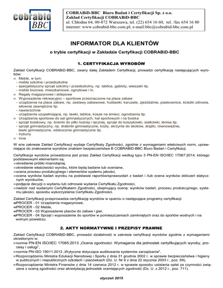 COBRABiD-BBC Biuro Badań i Certyfikacji Sp. z o.o. Zakład Certyfikacji COBRABiD-BBC ul. Chłodna 64, 00-872 Warszawa, tel. (22) 654 16 60, tel. /fax 654 16 80 internet: www.cobrabid-bbc.com.pl; e-mail:[email protected] INFORMATOR DLA KLIENTÓW o trybie certyfikacji w Zakładzie Certyfikacji COBRABiD-BBC 1. CERTYFIKACJA WYROBÓW Zakład Certyfikacji COBRABiD-BBC, zwany dalej Zakładem Certyfikacji, prowadzi certyfikację następujących wyrobów: • Meble, w tym: - meble szkolne i przedszkolne - specjalistyczny sprzęt szkolny i przedszkolny, np. tablice, gabloty, wieszaki itp. - meble biurowe, mieszkaniowe, ogrodowe i in. • Regały magazynowe i sklepowe • Wyposażenie rekreacyjno – sportowe przeznaczone na place zabaw - urządzenia na place zabaw, np. zestawy zabawowe, huśtawki, karuzele, zjeżdżalnie, piaskownice, ścieżki zdrowia, siłownie zewnętrzne itp. - nawierzchnie - urządzenia uzupełniające, np. ławki, tablice, kosze na śmieci, ogrodzenia itp. • Urządzenia sportowe do sal gimnastycznych, hal sportowych i na boiska - sprzęt boiskowy, np. bramki do piłki nożnej i ręcznej, sprzęt do koszykówki, siatkówki, tenisa itp. - sprzęt gimnastyczny, np. drabinki gimnastyczne, kozły, skrzynie do skoków, drążki, równoważnie, ławki gimnastyczne, odskocznie gimnastyczne itp. - trybuny • Inne W w/w zakresie Zakład Certyfikacji wydaje Certyfikaty Zgodności, zgodnie z wymaganiami właściwych norm, uprawniające do znakowania wyrobów znakiem bezpieczeństwa B COBRABiD-BBC Biuro Badań i Certyfikacji. Certyfikacja wyrobów prowadzona jest przez Zakład Certyfikacji według typu 3 PN-EN ISO/IEC 17067:2014, którego podstawowymi elementami są: • określenie próbki miarodajnej, • określenie właściwości wyrobu, które będą badane lub oceniane, • ocena procesu produkcyjnego i elementów systemu jakości, • ocena wyników badań wyrobu na podstawie raportów/sprawozdań z badań i /lub ocena wyników obliczeń statycznych wyrobu/ów, • podjęcie decyzji o wydaniu lub odmowie wydania Certyfikatu Zgodności, • nadzór nad wydanymi Certyfikatami Zgodności, obejmujący ocenę: wyników badań, procesu produkcyjnego, systemu jakości, sposobu wykorzystania Certyfikatu Zgodności. Zakład Certyfikacji przeprowadza certyfikację wyrobów w oparciu o następujące programy certyfikacji: • PROCER - 01 Urządzenia magazynowe, • PROCER - 02 Meble, • PROCER - 03 Wyposażenie placów do zabaw i gier, • PROCER - 04 Sprzęt i wyposażenie do sportów w pomieszczeniach zamkniętych oraz do sportów wodnych i na wolnym powietrzu. 2. AKTY NORMATYWNE I PRZEPISY PRAWNE Zakład Certyfikacji COBRABiD-BBC, prowadzi działalność w zakresie certyfikacji wyrobów zgodnie z wymaganiami określonymi w: • normie PN-EN ISO/IEC 17065:2013 „Ocena zgodności. Wymagania dla jednostek certyfikujących wyroby, procesy i usługi”, • normie PN-ISO 19011:2012 „Wytyczne dotyczące auditowania systemów zarządzania", • Rozporządzeniu Ministra Edukacji Narodowej i Sportu z dnia 31 grudnia 2002 r. w sprawie bezpieczeństwa i higieny w publicznych i niepublicznych szkołach i placówkach (Dz. U. Nr 6 z dnia 22 stycznia 2003 r., poz. 69), • Rozporządzenie Ministra Finansów z dnia 14 czerwca 2012 r. w sprawie sposobu ustalania opłat za czynności związane z oceną zgodności oraz akredytacją jednostek oceniających zgodność (Dz. U. z 2012 r., poz. 711). styczeń 2015 3. TRYB CERTYFIKACJI I NADZORU NAD CERTYFIKATEM ZGODNOŚCI 3.1. INFORMACJA O TRYBIE CERTYFIKACJI Informacja na temat trybu certyfikacji wyrobu/ów w Zakładzie Certyfikacji znajduje się na stronie internetowej www.cobrabid-bbc.com.pl. Zamieszczone są tam m.in.: • Informator dla Klientów o trybie certyfikacji w Zakładzie Certyfikacji COBRABiD-BBC, • Formularz Wniosku o przeprowadzenie procesu certyfikacji wyrobu/ów i prowadzenie nadzoru nad Certyfikatem/ami Zgodności (do wypełnienia przez Klienta). w/w dokumenty są dostępne do pobrania z naszej strony internetowej. Klient zainteresowany uzyskaniem Certyfikatu Zgodności może także pobrać wymienione dokumenty osobiście w Zakładzie Certyfikacji, ul. Chłodna 64 w Warszawie lub prosić o przesłanie pocztą. Informacje na temat procesu certyfikacji Klient może również uzyskać poprzez kontakt z Zakładem Certyfikacji [tel.: (22) 654 16 60, tel. /fax: 654 16 80, e-mail: [email protected]]. Klientowi zainteresowanemu procesem certyfikacji wyrobu/ów udzielamy informacji o opłatach za prace certyfikacyjne zgodnie z cennikiem ZC COBRABiD-BBC. 3.2. DOKUMENTY POTRZEBNE DO PRZEPROWADZENIA PROCESU CERTYFIKACJI Klient starający się o uzyskanie Certyfikatu Zgodności przekazuje do Zakładu Certyfikacji 2 egzemplarze wypełnionego formularza Wniosku o przeprowadzenie procesu certyfikacji wyrobu i prowadzenie nadzoru nad Certyfikatem Zgodności wraz z dokumentami wyszczególnionymi we Wniosku. Są to podane niżej dokumenty: • Dokumentacja techniczna umożliwiająca identyfikację wyrobu (katalogi, schematy, rysunki konstrukcyjne, opis techniczny itp.), • Raport/sprawozdanie z badań wyrobu wykonane przez laboratorium badawcze lub obliczenia statyczne wyrobu, wykonane przez osoby z uprawnieniami budowlanymi lub upoważnione do tego firmy, • Instrukcja montażu, użytkowania, konserwacji wyrobu, • Atesty na stosowane materiały i surowce (np. atesty PZH na stosowane lakiery i tworzywa itp.), • Kopia certyfikatu na system zarządzania jakością Producenta (w przypadku jego posiadania), • Upoważnienie do reprezentowania Producenta (jeżeli Klientem nie jest Producent ale Upoważniony Przedstawiciel), • Dokumenty potwierdzające prowadzenie działalności gospodarczej przez Producenta i/lub Upoważnionego Przedstawiciela (wypis z rejestru sądowego). 3.3. PROCES CERTYFIKACJI 3.3.1. Przebieg procesu certyfikacji Po otrzymaniu Wniosku Zakład Certyfikacji: • sprawdza możliwość przeprowadzenia procesu certyfikacji, • rej