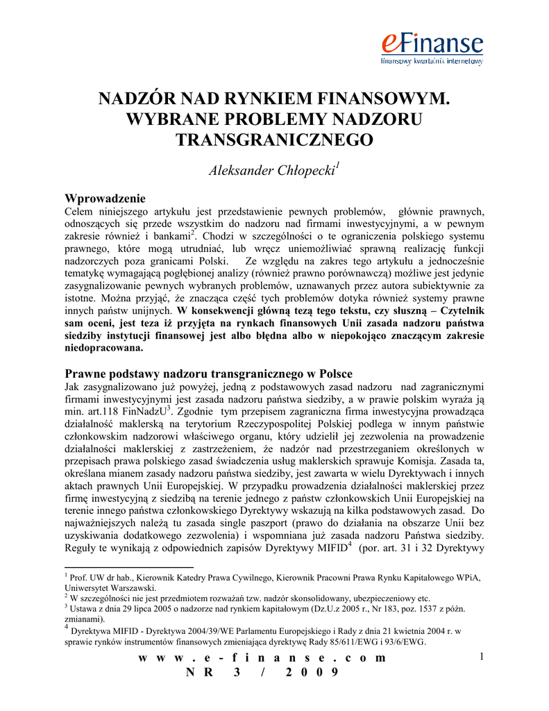 NADZÓR NAD RYNKIEM FINANSOWYM. WYBRANE PROBLEMY NADZORU TRANSGRANICZNEGO Aleksander Chłopecki1 Wprowadzenie Celem niniejszego artykułu jest przedstawienie pewnych problemów, głównie prawnych, odnoszących się przede wszystkim do nadzoru nad firmami inwestycyjnymi, a w pewnym zakresie również i bankami2. Chodzi w szczególności o te ograniczenia polskiego systemu prawnego, które mogą utrudniać, lub wręcz uniemożliwiać sprawną realizację funkcji nadzorczych poza granicami Polski. Ze względu na zakres tego artykułu a jednocześnie tematykę wymagającą pogłębionej analizy (również prawno porównawczą) możliwe jest jedynie zasygnalizowanie pewnych wybranych problemów, uznawanych przez autora subiektywnie za istotne. Można przyjąć, że znacząca część tych problemów dotyka również systemy prawne innych państw unijnych. W konsekwencji główną tezą tego tekstu, czy słuszną – Czytelnik sam oceni, jest teza iż przyjęta na rynkach finansowych Unii zasada nadzoru państwa siedziby instytucji finansowej jest albo błędna albo w niepokojąco znaczącym zakresie niedopracowana. Prawne podstawy nadzoru transgranicznego w Polsce Jak zasygnalizowano już powyżej, jedną z podstawowych zasad nadzoru nad zagranicznymi firmami inwestycyjnymi jest zasada nadzoru państwa siedziby, a w prawie polskim wyraża ją min. art.118 FinNadzU3. Zgodnie tym przepisem zagraniczna firma inwestycyjna prowadząca działalność maklerską na terytorium Rzeczypospolitej Polskiej podlega w innym państwie członkowskim nadzorowi właściwego organu, który udzielił jej zezwolenia na prowadzenie działalności maklerskiej z zastrzeżeniem, że nadzór nad przestrzeganiem określonych w przepisach prawa polskiego zasad świadczenia usług maklerskich sprawuje Komisja. Zasada ta, określana mianem zasady nadzoru państwa siedziby, jest zawarta w wielu Dyrektywach i innych aktach prawnych Unii Europejskiej. W przypadku prowadzenia działalności maklerskiej przez firmę inwestycyjną z siedzibą na terenie jednego z państw członkowskich Unii Europejskiej na terenie innego państwa członkowskiego Dyrektywy wskazują na kilka podstawowych zasad. Do najważniejszych należą tu zasada single paszport (prawo do działania na obszarze Unii bez uzyskiwania dodatkowego zezwolenia) i wspomniana już zasada nadzoru Państwa siedziby. Reguły te wynikają z odpowiednich zapisów Dyrektywy MIFID4 (por. art. 31 i 32 Dyrektywy 1 Prof. UW dr hab., Kierownik Katedry Prawa Cywilnego, Kierownik Pracowni Prawa Rynku Kapitałowego WPiA, Uniwersytet Warszawski. 2 W szczególności nie jest przedmiotem rozważań tzw. nadzór skonsolidowany, ubezpieczeniowy etc. 3 Ustawa z dnia 29 lipca 2005 o nadzorze nad rynkiem kapitałowym (Dz.U.z 2005 r., Nr 183, poz. 1537 z późn. zmianami). 4 Dyrektywa MIFID - Dyrektywa 2004/39/WE Parlamentu Europejskiego i Rady z dnia 21 kwietnia 2004 r. w sprawie rynków instrumentów finansowych zmieniająca dyrektywę Rady 85/611/EWG i 93/6/EWG. w w w . e - f i n a n s e . c o m N R 3 / 2 0 0 9 1 MIFID) jak również z inkorporujących je przepisów prawa lokalnego państwa członkowskiego. Generalnie, chociaż nieco upraszczając, wskazać można, że nadzór realizuje się w trzech podstawowych zakresach – poprzez uzyskiwanie i wymianę informacji o firmie inwestycyjnej/banku, poprzez możliwości kontroli firmy inwestycyjnej/banku (w tym kontroli w miejscu świadczenia usług) i poprzez możliwość stosowania sankcji. Odnosząc się do pierwszej z tych kwestii, przepisy FinNadzU zawierają szereg norm odnoszących się o wymiany informacji między organami nadzoru. Przykładowo zatem, zgodnie z art. 20 FinNadzU Komisja Nadzoru Finansowego (dalej – „Komisja”) lub jej upoważniony przedstawiciel może przekazywać i otrzymywać od zagranicznego organu nadzoru nad rynkiem papierów wartościowych lub rynkiem finansowym informacje niezbędne w celu prawidłowego wykonywania określonych zadań w zakresie nadzoru, w tym zadań określonych ustawą o nadzorze uzupełniającym. Art. 20 ust 2 FinNadzU wskazuje, że zasady i tryb udzielania informacji określają porozumienia zawarte przez Komisję z innymi organami nadzoru. Przepisy wskazują dalej na przesłanki, gdy może nastąpić udzielenie informacji na podstawie tych porozumień. Są to w szczególności przesłanki negatywne. Informacja może być zatem udzielona, o ile jej udzielenie nie spowoduje niekorzystnego wpływu na suwerenność bezpieczeństwo lub interes publiczny Rzeczypospolitej Polskiej jak również przepisy prawa obowiązujące w państwie siedziby zagranicznego organu nadzoru, któremu informacje są przekazywane, zapewniają wykorzystanie takich informacji wyłącznie na potrzeby wykonywania nadzoru lub prowadzenia postępowań administracyjnych lub sądowych w sprawach związanych z wykonywaniem tego nadzoru5. Nieco odmienna sytuacja istnieje na gruncie prawa bankowego 6. Zgodnie z art. 131 ust. 1 ust. 1 PrBankU działalność banków, oddziałów i przedstawicielstw banków zagranicznych, oddziałów i przedstawicielstw instytucji kredytowych podlega nadzorowi bankowemu sprawowanemu przez Komisję Nadzoru Finansowego. Również nadzór nad działalnością oddziału lub przedstawicielstwa banku zagranicznego w kraju oraz oddziału lub przedstawicielstwa banku krajowego za granicą, w tym zakres i tryb dokonywania czynności kontrolnych, może być wykonywany w zakresie uzgodnionym w porozumieniu Komisji Nadzoru Bankowego z właściwymi władzami nadzorczymi. PrBankU zachowuje zasadę nadzoru państwa siedziby, tj. zgodnie z art.141c PrBankU nadzór nad działalnością instytucji kredytowej prowadzącej działalność na terytorium Rzeczypospolitej Polskiej poprzez oddział lub w ramach działalności transgranicznej sprawują, z zastrzeżeniem pewnych kwestii odnoszących się do płynności płatniczej) właściwe władze nadzorcze państwa macierzystego. PrBankU zawiera również, ana