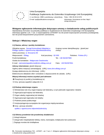 Unia Europejska Publikacja Suplementu do Dziennika Urzędowego Unii Europejskiej 2, rue Mercier, 2985 Luxembourg, Luksemburg Faks: +352 29 29 42 670 E-mail: [email protected] Informacje i formularze on-line: http:// simap.europa.eu Wstępne ogłoszenie informacyjne dotyczące umowy o świadczenie usług publicznych Standardowy formularz na potrzeby publikacji w Suplemencie do Dziennika Urzędowego Unii Europejskiej informacji zgodnie z art. 7 ust. 2 rozporządzenia 1370/2007 na rok przed rozpoczęciem procedury przetargowej lub rok przed bezpośrednim przyznaniem zamówienia. Sekcja I: Właściwy organ I.1) Nazwa, adresy i punkty kontaktowe: Oficjalna nazwa: Zarząd Komunikacji Miejskiej w Elblągu spółka z ograniczoną odpowiedzialnością Krajowy numer identyfikacyjny: (jeżeli jest znany) _____ Adres pocztowy: ul. Browarna 90 Miejscowość: Elbląg Kod pocztowy: 82-300 Punkt kontaktowy: _____ Państwo: Polska (PL) Tel.: +48 552307900 Osoba do kontaktów: Małgorzata Osadowska E-mail: [email protected] Faks: +48 552307901 Adresy internetowe: (jeżeli dotyczy) Ogólny adres instytucji zamawiającej: (URL) www.zkm.elblag.com.pl Dostęp elektroniczny do informacji: (URL) _____ Elektroniczne składanie ofert i wniosków o dopuszczenie do udziału: (URL) _____ Więcej informacji można uzyskać pod adresem Powyższy(-e) punkt(-y) kontaktowy(-e) Inny (proszę wypełnić załącznik A.I) I.2) Rodzaj właściwego organu Ministerstwo lub inny organ krajowy lub federalny, w tym jednostki regionalne i lokalne Agencja/urząd krajowy lub federalny Organ władzy regionalnej lub lokalnej Agencja/urząd regionalny lub lokalny Podmiot prawa publicznego Instytucja/agencja europejska lub organizacja międzynarodowa Inna: (proszę określić) spółka z ograniczona odpowiedzialnością I.3) Główny przedmiot lub przedmioty działalności Usługi kolejowe Usługi kolei miejskiej/kolei lekkiej, metra, tramwajów, trolejbusów lub autobusów Żegluga morska lub śródlądowa PL Formularz standardowy T01 - 1370/07 – art. 7 ust. 2 - Wstępne ogłoszenie informacyjne dotyczące umowy o świadczenie usług publicznych 1 / 11 Inny: (proszę określić) publiczny transport zbiorowy I.4) Udzielenie zamówienia w imieniu innych właściwych organów Właściwy organ dokonuje zakupu w imieniu innych właściwych organów: tak nie (jeżeli tak, więcej informacji o tych właściwych organach można podać w załączniku A.II) PL Formularz standardowy T01 - 1370/07 – art. 7 ust. 2 - Wstępne ogłoszenie informacyjne dotyczące umowy o świadczenie usług publicznych 2 / 11 Sekcja II: Przedmiot zamówienia II.1) Opis: II.1.1) Nazwa nadana zamówieniu: Świadczenie usług przewozu w trakcji tramwajowej II.1.2) Rodzaj zamówienia, dziedzina(-y), której(-ych) dotyczą usługi transportu publicznego: Kategoria usług: nr: T-04 (Zob. kategorie usług w załączniku B) Dziedziny, których dotyczą usługi transportu publicznego: komunikacja miejska Kod NUTS: PL621 II.1.3) Krótki opis zamówienia: Świadczenie usług w zakresie transportu tramwajowego na sieci komunikacyjnej obejmującej obszar Gminy Miasto Elbląg, w ramach komunikacji miejskiej, wykonywane przez podmiot wewnętrzny, w rozumieniu rozporządzenia (WE) nr 1370/2007, powołany do świadczenia usług w zakresie publicznego transportu zbiorowego II.1.4) Wspólny Słownik Zamówień (CPV) Główny przedmiot Słownik główny 60112000 Słownik uzupełniający (jeżeli dotyczy) II.1.5) Informacje na temat podwykonawstwa Przewidywane jest zlecenie podwykonawstwa: tak nie (jeżeli tak) Wartość lub część zamówienia, które prawdopodobnie będzie zlecone stronom trzecim: minimalny procent: _____ (%), maksymalny procent: _____ (%) wartości zamówienia albo Nieznana Krótki opis wartości/części zamówienia, które będzie zlecone podwykonawcom: _____ II.2) Ilość i/lub wartość usług Opis: _____ km usług publicznych w zakresie transportu pasażerskiego: _____ Szacunkowy koszt bez VAT: (proszę podać wyłącznie dane liczbowe) _____ albo Zakres: między _____ i _____ Waluta: Waluta: II.3) Planowana data rozpoczęcia i czas trwania zamówienia lub termin realizacji Rozpoczęcie: 01/09/2017 (dd/mm/rrrr) Okres w miesiącach: 180 albo w dniach: _____ (od udzielenia zamówienia) PL Formularz standardowy T01 - 1370/07 – art. 7 ust. 2 - Wstępne ogłoszenie informacyjne dotyczące umowy o świadczenie usług publicznych 3 / 11 Sekcja III: Informacje o charakterze prawnym, ekonomicznym, finansowym i technicznym III.1) Warunki dotyczące zamówienia: III.1.1) Parametry kosztów w celu obliczenia rekompensaty: _____ III.1.2) Informacje o wyłącznych prawach: Przyznano wyłączne prawa tak nie (jeżeli tak) Wyszczególnienie przyznanych wyłącznych praw: _____ III.1.3) Podział przychodów ze sprzedaży biletów: Odsetek przydzielony podmiotowi świadczącemu usługi publiczne: _____ (%) (uznaje się, że pozostała część jest przyznawana właściwemu organowi) III.1.4) Standardy socjalne: (przejęcie personelu zgodnie z dyrektywą 2001/23/WE) Wykaz wymaganych standardów (w tym lista pracowników, których to dotyczy, szczegółowe informacje na temat umownych praw i zobowiązań pracowników oraz warunków, na jakich pracowników uznaje się za związanych ze świadczonymi usługami): _____ III.1.5) Zobowiązania do świadczenia usług publicznych: Wyszczególnienie: _____ III.1.6) Inne szczególne warunki: Wykonanie zamówienia podlega szczególnym warunkom (jeżeli tak) Opis szczególnych warunków: _____ tak nie III.2) Warunki udziału: III.2.1) Zdolność ekonomiczna i finansowa: Informacje i formalności konieczne do dokonania oceny Minimalny poziom ewentualnie wymaganych spełniania wymogów: standardów: _____ _____ III.2.2) Wymagania techniczne: Informacje i formalności konieczne do dokonania oceny Minimalny poziom ewentualnie wymaganych spełniania wymogów: standardów: _____ _____ III.3) Cele w zakresie jakości dla umów o usługi: Opis: _