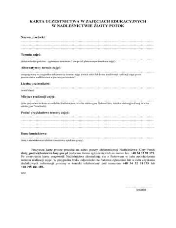KARTA UCZESTNICTWA W ZAJĘCIACH EDUKACYJNYCH W NADLEŚNICTWIE ZŁOTY POTOK Nazwa placówki: ……………………………………………………………………………………………………… ……………………………………………………………………………………………………… ……………………………………………………………………………………………………… Termin zajęć: ………………………………………………………………………………………………………. (dzień/miesiąc/godzina – zgłoszenie minimum 7 dni przed planowanym terminem zajęć) Alternatywny termin zajęć: ………………………………………………………………………………………………………. (rozpatrywany w przypadku nałożenia się terminu zajęć dwóch szkół lub braku możliwości realizacji zajęć przez pracowników nadleśnictwa w pierwszym terminie). Liczba uczestników: ………………………………………………………………………………………………………. (wiek/klasa) Miejsce realizacji zajęć: ………………………………………………………………………………………………………. (izba przyrodniczo-leśna w siedzibie Nadleśnictwa, ścieżka edukacyjna Zielona Góra, ścieżka edukacyjna Poraj, ścieżka edukacyjna Dziadówki) Podać przykładowe tematy zajęć: ……………………………………………………………………………………………………… ……………………………………………………………………………………………………… ……………………………………………………………………………………………………… ………………………………………………………………………………………………………. Dane kontaktowe: ……………………………………………………………………………………………………… (imię i nazwisko oraz telefon kontaktowy opiekuna grupy). Powyższą kartę proszę przesłać na adres poczty elektronicznej Nadleśnictwa Złoty Potok [email protected] (zalecana forma zgłoszenia) lub na numer fax. +48 34 32 91 171. Po otrzymaniu karty pracownik Nadleśnictwa skontaktuje się z Państwem w celu potwierdzenia terminu realizacji zajęć. W przypadku braku odpowiedzi na Państwa zgłoszenie lub w celu uzyskania dodatkowych informacji prosimy o kontakt telefoniczny pod numerem +48 34 32 91 175 lub +48 795 484 189. MSZ ……………………. (podpis)