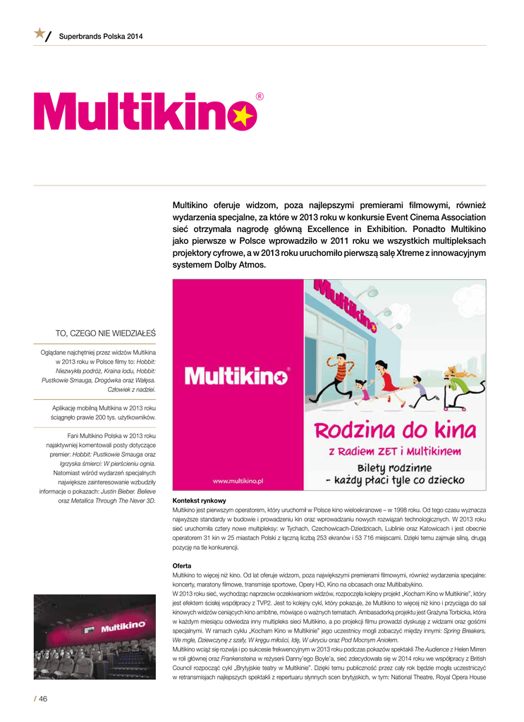 Superbrands Polska 2014 Multikino oferuje widzom, poza najlepszymi premierami filmowymi, również wydarzenia specjalne, za które w 2013 roku w konkursie Event Cinema Association sieć otrzymała nagrodę główną Excellence in Exhibition. Ponadto Multikino jako pierwsze w Polsce wprowadziło w 2011 roku we wszystkich multipleksach projektory cyfrowe, a w 2013 roku uruchomiło pierwszą salę Xtreme z innowacyjnym systemem Dolby Atmos. TO, CZEGO NIE WIEDZIAŁEŚ Oglądane najchętniej przez widzów Multikina w 2013 roku w Polsce filmy to: Hobbit: Niezwykła podróż, Kraina lodu, Hobbit: Pustkowie Smauga, Drogówka oraz Wałęsa. Człowiek z nadziei. Aplikację mobilną Multikina w 2013 roku ściągnęło prawie 200 tys. użytkowników. Fani Multikino Polska w 2013 roku najaktywniej komentowali posty dotyczące premier: Hobbit: Pustkowie Smauga oraz Igrzyska śmierci: W pierścieniu ognia. Natomiast wśród wydarzeń specjalnych największe zainteresowanie wzbudziły informacje o pokazach: Justin Bieber. Believe oraz Metallica Through The Never 3D. Kontekst rynkowy Multikino jest pierwszym operatorem, który uruchomił w Polsce kino wieloekranowe – w 1998 roku. Od tego czasu wyznacza najwyższe standardy w budowie i prowadzeniu kin oraz wprowadzaniu nowych rozwiązań technologicznych. W 2013 roku sieć uruchomiła cztery nowe multipleksy: w Tychach, Czechowicach-Dziedzicach, Lublinie oraz Katowicach i jest obecnie operatorem 31 kin w 25 miastach Polski z łączną liczbą 253 ekranów i 53 716 miejscami. Dzięki temu zajmuje silną, drugą pozycję na tle konkurencji. Oferta Multikino to więcej niż kino. Od lat oferuje widzom, poza największymi premierami filmowymi, również wydarzenia specjalne: koncerty, maratony filmowe, transmisje sportowe, Opery HD, Kino na obcasach oraz Multibabykino. W 2013 roku sieć, wychodząc naprzeciw oczekiwaniom widzów, rozpoczęła kolejny projekt „Kocham Kino w Multikinie”, który jest efektem ścisłej współpracy z TVP2. Jest to kolejny cykl, który pokazuje, że Multikino to więcej niż kino i przyciąga do sal kinowych widzów ceniących kino ambitne, mówiące o ważnych tematach. Ambasadorką projektu jest Grażyna Torbicka, która w każdym miesiącu odwiedza inny multipleks sieci Multikino, a po projekcji filmu prowadzi dyskusję z widzami oraz gośćmi specjalnymi. W ramach cyklu „Kocham Kino w Multikinie” jego uczestnicy mogli zobaczyć między innymi: Spring Breakers, We mgle, Dziewczynę z szafy, W kręgu miłości, Idę, W ukryciu oraz Pod Mocnym Aniołem. Multikino wciąż się rozwija i po sukcesie frekwencyjnym w 2013 roku podczas pokazów spektakli The Audience z Helen Mirren w roli głównej oraz Frankensteina w reżyserii Danny’ego Boyle’a, sieć zdecydowała się w 2014 roku we współpracy z British Council rozpocząć cykl „Brytyjskie teatry w Multikinie”. Dzięki temu publiczność przez cały rok będzie mogła uczestniczyć w retransmisjach najlepszych spektakli z repertuaru słynnych scen brytyjskich, w tym: National Theatre, Royal Opera House / 46 MULTIKINO czy English National Opera. Przedstawienia, które będą prezentowane w ramach cyklu, zostały zarejestrowane na żywo, przy użyciu najnowszych rozwiązań technologicznych. Będą one retransmitowane w oryginalnej wersji z polskimi napisami. Udział w pokazach jest niepowtarzalną okazją, by stać się częścią publiczności londyńskiego teatru oraz doświadczyć aktorstwa w najlepszym wydaniu: Helen Mirren (w roli Królowej Elżbiety II), Benedict Cumberbatch (w roli Frankensteina) czy Tom Hiddleston (w roli Koriolana) trafią prosto ze sceny londyńskiego teatru na ekrany wybranych kin sieci Multikina. Wydarzenia specjalne to jednak tylko część oferty Multikina, które przede wszystkim gwarantuje widzom udział w najlepszych premierach filmowych w najwyższej jakości. Multikino, wyposażając w 2011 roku wszystkie sale kinowe w projektory cyfrowe, zostało pierwszą w 100 proc. cyfrową siecią kin w Polsce. Dzięki temu jest w gronie światowych liderów kinowej cyfryzacji. Idąc o krok dalej, oraz chcąc zapewnić swoim widzom poza niezwykłymi doznaniami wizualnymi również obecnie najwyższą, dostępną na świecie, jakość dźwięku, Multikino uruchomiło w 2013 roku w katowickim multipleksie pierwszą w Polsce salę Xtreme wyposażoną w system Dolby Atmos. Stosuje on technologię obiektową pozwalającą z wielką precyzją umiejscawiać efekty dźwiękowe w przestrzeni sali kinowej. W sali Xtreme znajduje się nie tylko przełomowy Dolby Atmos. W Polsce pierwszą produkcją, którą widzowie mogli zobaczyć w sali Xtreme wyposażonej w system Dolby Atmos, był Hobbit: Pustkowie Smauga – druga część filmowej adaptacja książki J.R.R. Tolkiena, będącej wstępem do słynnego Władcy Pierścieni. Dzięki nowej technologii w 2013 roku film był wyświetlany nie tylko w 3D i w wersji 48 klatek na sekundę jak Hobbit: Niezwykła podróż, lecz także przy użyciu najnowocześniejszego systemu dźwiękowego Dolby Atmos. Blisko 50 głośników rozmieszczonych po bokach oraz na suficie sali Xtreme zapewniło widzom bardzo naturalne doświadczenia dźwiękowe, które podczas seansów otaczały ich z każdej strony. Multikino poza wyjątkowymi wydarzeniami specjalnymi oraz bogatym repertuarem filmowym oferuje widzom również bilety w najlepszych cenach. W ciągu tygodnia we współpracy z partnerami odbywają się akcje specjalne: „Lubię Poniedziałki z CocaCola”, „Ftorki z Lordem” oraz „Bueno Czwartki”. Multikino ma również ofertę dla rodzin z dziećmi czyli akcję „Rodzina do kina”. Dzięki niej od poniedziałku do niedzieli rodzice z dziećmi mogą kupować bilety rodzinne i płacić za bilet tyle, co dziecko. Oferta dotyczy filmów bez ograniczeń wiekowych, wyświetlanych do godziny 17.00. Ponadto Multikino jest partnerem programu PAYBACK, dzięki któremu klienci mogą zbierać punkty za zakupy oraz wy