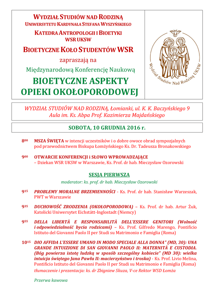 WYDZIAŁ STUDIÓW NAD RODZINĄ UNIWERSYTETU KARDYNAŁA STEFANA WYSZYŃSKIEGO KATEDRA ANTROPOLOGII I BIOETYKI WSR UKSW BIOETYCZNE KOŁO STUDENTÓW WSR zapraszają na Międzynarodową Konferencję Naukową BIOETYCZNE ASPEKTY OPIEKI OKOŁOPORODOWEJ WYDZIAŁ STUDIÓW NAD RODZINĄ, Łomianki, ul. K. K. Baczyńskiego 9 Aula im. Ks. Abpa Prof. Kazimierza Majdańskiego SOBOTA, 10 GRUDNIA 2016 r. 800 MSZA ŚWIĘTA w intencji uczestników i o dobre owoce obrad sympozjalnych pod przewodnictwem Biskupa Łomżyńskiego Ks. Dr. Tadeusza Bronakowskiego 900 OTWARCIE KONFERENCJI i SŁOWO WPROWADZAJĄCE – Dziekan WSR UKSW w Warszawie, Ks. Prof. dr hab. Mieczysław Ozorowski SESJA PIERWSZA moderator: ks. prof. dr hab. Mieczysław Ozorowski 915 PROBLEMY MORALNE BRZEMIENNOŚCI - Ks. Prof. dr hab. Stanisław Warzeszak, PWT w Warszawie 935 DUCHOWOŚĆ ZRODZENIA (OKOŁOPORODOWA) – Ks. Prof. dr hab. Artur Żuk, Katolicki Uniwersytet Eichstätt-Inglostadt (Niemcy) 955 DELLA LIBERTÀ E RESPONSABILITÀ DELL’ESSERE GENITORI (Wolność i odpowiedzialność bycia rodzicami) – Ks. Prof. Gilfredo Marengo, Pontificio Istituto del Giovanni Paolo II per Studi su Matrimonio e Famiglia (Roma) 1015 DIO AFFIDA L’ESSERE UMANO IN MODO SPECIALE ALLA DONNA” (MD, 30): UNA GRANDE INTUIZIONE DI SAN GIOVANNI PAOLO II: MATERNITÀ E CUSTODIA. (Bóg powierza istotę ludzką w sposób szczególny kobiecie” (MD 30): wielka intuicja świętego Jana Pawła II: macierzyństwo i troska) - Ks. Prof. Livio Melina, Pontificio Istituto del Giovanni Paolo II per Studi su Matrimonio e Famiglia (Roma) tłumaczenie i prezentacja: ks. dr Zbigniew Skuza, V-ce Rektor WSD Łomża Przerwa kawowa 1045 KOBIETA VERSUS DZIECKO - Doc. JCDr. Frantiszek Citbaj (PhD), Wydział Teologii Grekokatolickiej, Uniwersytet Preszowski (Słowacja) 1105 NOWONARODZONY Z WIARY, NADZIEI I MIŁOŚCI. OSOBOWY WZORZEC ROZWOJU DZIECKA - Ks. Prof. dr hab. Ireneusz Mroczkowski, WSR UKSW, Kierownik Katedry Antropologii i Bioetyki 1125 KONSEKWENCJE ZAGUBIONEJ KONCEPCJI CZŁOWIEKA W PSYCHOLOGII – Ks. dr Jerzy Szymołon, Katolicki Uniwersytet Lubelski Jana Pawła II 1145 DYSKUSJA 12.15 – 13.00 Przerwa obiadowa SESJA DRUGA moderator: ks. dr hab. Stanisław Biały, prof. UKSW w Warszawie 1300 TROSKA O PRAWO DO ŻYCIA (NIENARODZONEGO) A EUTANAZJA - Ks. dr Marek Leśniak, Katedra Teologii Życia UPJPII (Kraków) 1320 KOBIETA W SYTUACJI NIEPOWODZEŃ POŁOŻNICZYCH. SPECYFIKA PRZEŻYWANYCH TRUDNOŚCI – Mgr lic. Marta Laskowska, doktorantka, Uniwersytet Opolski 1340 OPIEKA LEKARZA OKULISTY NAD KOBIETĄ CIĘŻARNĄ – Dr Agnieszka Kamińska, Katedra Wychowania Zdrowotnego i Odpowiedzialnego Rodzicielstwa WSR UKSW 1400 RODZI SIĘ CZŁOWIEK, CZYLI NARODZINY CAŁEJ RODZINY (DZIECKA, MATKI i OJCA)– Dr Urszula Tataj-Puzyna, położna, Warszawski Uniwersytet Medyczny 1420 UMIERALNOŚĆ OKOŁOPORODOWA W POLSCE – Dr Bożena Bassa, Katedra Wychowania Zdrowotnego i Odpowiedzialnego Rodzicielstwa WSR UKSW 1440 TOWARZYSZENIE RODZICOM DZIECKA TERMINALNIE CHOREGO W OKRESIE PRENATALNYM – S. Prof. Justyna Olha Holubets, Lwowski Uniwersytet Medyczny im. Danyla Galickego (Ukraina) 1500 HOSPICJUM PERINATALNE JAKO NOWA FORMA WALKI Z ABORCJĄ W OPIECE OKOŁOPORODOWEJ – Ks. Dr hab. Stanisław Biały, prof. UKSW w Warszawie, Katedra Antropologii i Bioetyki WSR UKSW 1520 DYSKUSJA, wystąpienia innych zaproszonych Gości 1550 Podsumowanie i zakończenie Konferencji
