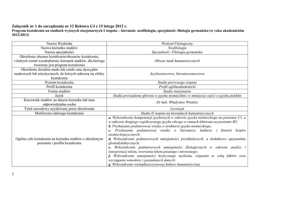 Załącznik nr 1 do zarządzenia nr 12 Rektora UJ z 15 lutego 2012 r. Program kształcenia na studiach wyższych stacjonarnych I stopnia – kierunek: neofilologia, specjalność: filologia germańska (w roku akademickim 2012/2013) Nazwa Wydziału Nazwa kierunku studiów Nazwa specjalności Określenie obszaru kształcenia/obszarów kształcenia, z których został wyodrębniony kierunek studiów, dla którego tworzony jest program kształcenia Określenie dziedzin nauki lub sztuki oraz dyscyplin naukowych lub artystycznych, do których odnoszą się efekty kształcenia Poziom kształcenia Profil kształcenia Forma studiów Język Kierownik studiów na danym kierunku lub inna odpowiedzialna osoba Tytuł zawodowy uzyskiwany przez absolwenta Możliwości dalszego kształcenia Ogólne cele kształcenia na kierunku studiów o określonym poziomie i profilu kształcenia 1 Wydział Filologiczny Neofilologia Specjalność: Filologia germańska Obszar nauk humanistycznych Językoznawstwo, literaturoznawstwo Studia pierwszego stopnia Profil ogólnoakademicki Studia stacjonarne Studia prowadzone głównie w języku niemieckim i w mniejszej części w języku polskim Dr hab. Władysław Witalisz Licencjat Studia II stopnia na kierunkach humanistycznych a. Wykształcenie kompetencji językowych w zakresie języka niemieckiego na poziomie C1, a w zakresie drugiego współczesnego języka obcego w ramach lektoratu na poziomie B2; b. Przekazanie podstawowej wiedzy o strukturze języka niemieckiego; c. Przekazanie podstawowej wiedzy o literaturze, kulturze i historii krajów niemieckojęzycznych; d. Wykształcenie podstawowych umiejętności przekładowych, a dodatkowo opcjonalnie glottodydaktycznych; e. Wykształcenie podstawowych umiejętności filologicznych w zakresie analizy i interpretacji tekstu, tworzenia tekstu pisanego i mówionego; f. Wykształcenie umiejętności krytycznego myślenia, wiązania ze sobą faktów oraz wyciągania wniosków z posiadanych danych; g. Wykształcenie wielopłaszczyznowej kultury humanistycznej. Związek kształcenia na kierunku studiów o określonym poziomie i profilu kształcenia z misją i strategią uczelni Różnice w stosunku do innych programów o podobnie zdefiniowanych celach i efektach kształcenia prowadzonych na uczelni Możliwości zatrudnienia Wymagania wstępne Zasady rekrutacji Liczba punktów ECTS konieczna do uzyskania kwalifikacji Część programu kształcenia realizowana w postaci zajęć dydaktycznych wymagających bezpośredniego udziału nauczycieli akademickich i studentów Łączna liczba punktów ECTS, którą student musi uzyskać na zajęciach wymagających bezpośredniego udziału nauczycieli akademickich i studentów Łączna liczba punktów ECTS, którą student musi uzyskać w ramach zajęć z zakresu nauk podstawowych, do których odnoszą się efekty kształcenia dla określonego kierunku, poziomu i profilu kształcenia Łączna liczba punktów ECTS, którą student musi uzyskać w ramach zajęć o charakterze praktycznym, w tym zajęć laboratoryjnych i projektowych 2 Zob. program kształcenia kierunku neofilologia Nie istnieją podobne programy a. Na stanowiskach wymagających zaawansowanej znajomości niemieckojęzycznego obszaru kulturowego w różnych instytucjach: przede wszystkim kulturalnych, w redakcjach, wydawnictwach i mediach b. Po zdobyciu dodatkowych kwalifikacji na stanowiskach wymagających zaawansowanej znajomości języka niemieckiego w instytucjach o charakterze gospodarczym i politycznym c. jako tłumacz lub asystent językowy w sektorze kultury i mediów oraz innych instytucji i firm, gdzie wymagana jest bardzo dobra znajomość języka niemieckiego d. w przypadku wyboru kształcenia nauczycielskiego jako nauczyciel języka niemieckiego w przedszkolach i szkołach podstawowych oraz innych placówkach oświatowych Świadectwo maturalne i spełnienie warunków rekrutacji https://www.erk.uj.edu.pl/studia/katalog/rok_rekrutacji/12/tryb_ubiegania/s/widocznosc/t 180 ECTS nie mniej niż 50% zgodnie z uchwałą Senatu UJ nr 2/I z dn. 25 stycznia 2012 roku nie mniej niż 90 ECTS zgodnie z uchwałą Senatu UJ nr 2/I z dn. 25 stycznia 2012 roku 108 0 Minimalna liczba punktów ECTS, którą student musi uzyskać realizując moduły kształcenia oferowane na zajęciach ogólnouczelnianych lub na innym kierunku studiów Minimalna liczba punktów ECTS, którą student musi uzyskać na zajęciach z wychowania fizycznego Liczba semestrów Opis zakładanych efektów kształcenia Plan studiów Sylabusy poszczególnych modułów kształcenia uwzględniające metody weryfikacji efektów kształcenia osiąganych przez studentów Wymiar, zasady i forma odbywania praktyk w przypadku, gdy program kształcenia przewiduje praktyki BHP 0 ECTS (ochrona własności intelektualnej 1 ECTS) 0 6 semestrów Zob. zał. Nr 2 Zob. zał. Nr 3: plany studiów filologii germańskiej Zob. zał. Nr 4: sylabusy na dany rok akademicki filologii germańskiej wyłącznie w ramach fakultatywnego kształcenia nauczycielskiego, 30 godzin praktyki ogólnej (opieka Studium Pedagogicznego UJ) + 120 godzin (opieka IFG UJ) - w szkole podstawowej. Praktyka pedagogiczna ciągła polega na hospitacji zajęć nauczyciela oraz samodzielnym prowadzeniu lekcji. Student prowadzi samodzielnie 50 godzin i hospituje 100 godzin (obserwacja nauczyciela- opiekuna). Regulamin praktyk dostępny jest u pani dr Sowy-Babik z IFG. Podstawą praktyki są umowy zawarte między Instytutem Filologii Germańskiej UJ a nauczycielami-opiekunami studenta. 3 Wymogi związane z ukończeniem studiów (praca dyplomowa/egzamin dyplomowy/inne) Praca dyplomowa i egzamin dyplomowy Inne dokumenty a. sposób wykorzystania wzorców międzynarodowych: Brano pod uwagę wzorce zagraniczne, np. http://www.qaa.ac.uk/Publications/ InformationsAndGuidance/Documents/languages07.pdf Wydział uczestniczył w międzynarodowym projekcie dotyczącym standardyzacji programów nauczania języków obcych na wyższych