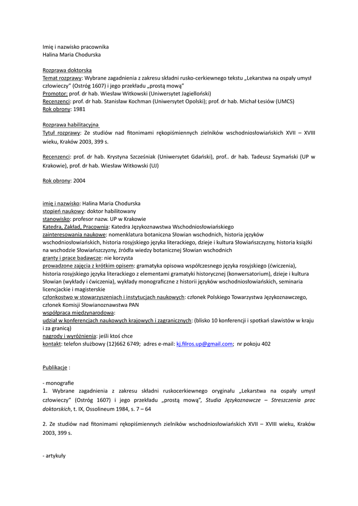 Imię i nazwisko pracownika Halina Maria Chodurska ! Rozprawa doktorska Temat rozprawy: Wybrane zagadnienia z zakresu składni rusko-‐cerkiewnego tekstu „Lekarstwa na ospały umysł człowieczy” (Ostróg 1607) i jego przekładu „prostą mową” Promotor: prof. dr hab. Wiesław Witkowski (Uniwersytet Jagielloński) Recenzenci: prof. dr hab. Stanisław Kochman (Uniwersytet Opolski); prof. dr hab. Michał Łesiów (UMCS) Rok obrony: 1981 ! Rozprawa habilitacyjna Tytuł rozprawy: Ze studiów nad fitonimami rękopiśmiennych zielników wschodniosłowiańskich XVII – XVIII wieku, Kraków 2003, 399 s. Recenzenci: prof. dr hab. Krystyna Szcześniak (Uniwersytet Gdański), prof.. dr hab. Tadeusz Szymański (UP w Krakowie), prof. dr hab. Wiesław Witkowski (UJ) Rok obrony: 2004 ! imię i nazwisko: Halina Maria Chodurska stopień naukowy: doktor habilitowany stanowisko: profesor nazw. UP w Krakowie Katedra, Zakład, Pracownia: Katedra Językoznawstwa Wschodniosłowiańskiego zainteresowania naukowe: nomenklatura botaniczna Słowian wschodnich, historia języków wschodniosłowiańskich, historia rosyjskiego języka literackiego, dzieje i kultura Słowiańszczyzny, historia książki na wschodzie Słowiańszczyzny, źródła wiedzy botanicznej Słowian wschodnich granty i prace badawcze: nie korzysta prowadzone zajęcia z krótkim opisem: gramatyka opisowa współczesnego języka rosyjskiego (ćwiczenia), historia rosyjskiego języka literackiego z elementami gramatyki historycznej (konwersatorium), dzieje i kultura Słowian (wykłady i ćwiczenia), wykłady monograficzne z historii języków wschodniosłowiańskich, seminaria licencjackie i magisterskie członkostwo w stowarzyszeniach i instytucjach naukowych: członek Polskiego Towarzystwa Językoznawczego, członek Komisji Słowianoznawstwa PAN współpraca międzynarodowa: udział w konferencjach naukowych krajowych i zagranicznych: (blisko 10 konferencji i spotkań slawistów w kraju i za granicą) nagrody i wyróżnienia: jeśli ktoś chce kontakt: telefon służbowy (12)662 6749; adres e-‐mail: kj.fi[email protected]; nr pokoju 402 ! ! Publikacje : -‐ monografie 1. Wybrane zagadnienia z zakresu składni ruskocerkiewnego oryginału „Lekarstwa na ospały umysł człowieczy” (Ostróg 1607) i jego przekładu „prostą mową”, Studia Językoznawcze – Streszczenia prac doktorskich, t. IX, Ossolineum 1984, s. 7 – 64 2. Ze studiów nad fitonimami rękopiśmiennych zielników wschodniosłowiańskich XVII – XVIII wieku, Kraków 2003, 399 s. ! -‐ artykuły 1. Uwagi o morfologii czasownika w gwarach Półwyspu Kolskiego, Rocznik Naukowo-‐Dydaktyczny WSP w Krakowie, 1978 Prace Rusycystyczne V, s. 187 -‐196 2. Damian Naliwajko i jego „Lekarstwo na ospały umysł człowieczy”, Rocznik Naukowo-‐Dydaktyczny WSP w Krakowie, z. 74 (1982) Prace Rusycystyczne VI, s. 135 – 142 3. Próba określenia funkcji syntaktycznych prostych imiesłowów czynnych w najstarszych tekstach piśmiennictwa słowiańskiego, Zeszyty Naukowe UJ DCCCI Prace Językoznawcze z. 82 (1986), s. 137 – 143 4. Zapomniane konstrukcje składni słowiańskiej w cerkiewno-‐ukraińskim druku z początku XVII wieku (podwójne przypadki), Rocznik Naukowo-‐Dydaktyczny WSP w Krakowie, z. 116 (1987) Prace Rusycystyczne VII, s. 109 – 120 5. Wschodniosłowiańska fuga daemonum (uwagi o pochodzeniu nazw roślin чертополох, чертогон, чертопугальник), Slavia Orientalis XXXVI (1987), Nr 3-‐4, s. 473 – 479 6. ДЕДОВНИК – fuga daemonum?, Slavia Orientalis XXXVII (1988), Nr 2, s. 259 – 262 7. Kilka uwag o nazwach roślin typu Ааронова борода, Studia z Filologii Polskiej i Słowiańskiej, t. XXVI (1990), s. 123 – 131 8. В кругу старорусских рукописей (травники), Leksikologijas aktuălăs problěmas, Daugawpils 1992, s. 73 – 81 9. Słowo o mikołajku, Rocznik Naukowo-‐Dydaktyczny WSP w Krakowie, z. 149 (1992) Prace Rusycystyczne VIII, s. 103 – 109 10. Przegląd nazw i motywów magicznych w świecie roślin na przykładzie Słowiańszczyzny wschodniej [w:] Historia i teraźniejszość Rosji w świetle faktów językowych, Kraków 1993, s. 59 – 70 11. Ogólna charakterystyka druków Wielkiego Księstwa Litewskiego [w:] Rękopis a druk. Najstarsze druki cerkiewnosłowiańskie i ich stosunek do tradycji rękopiśmiennej, Kraków 1993, s. 191 – 200 12. W kręgu rękopisów średnioruskich (zielniki magiczne), Rocznik Naukowo-‐Dydaktyczny WSP w Krakowie, z. 177 (1995) Prace Rusycystyczne IX, s. 73 – 80 13. Meandry etymologii (na przykładzie nomenklatury botanicznej) [w:] Вопросы лингвистики и лингводидактики. Материалы конференции МАПРЯЛ, Краков 23-‐24.IV.1996, s. 196 – 204 14. Kocha… lubi… szanuje… (rośliny zapewniające dozgonną miłość w „zielniku czarodziejskim” Słowian wschodnich) [w:] Słowianie wschodni. Między językiem a kulturą. Księga jubileuszowa dedykowana Profesorowi Wiesławowi Witkowskiemu w siedemdziesiątą rocznicę urodzin, Kraków 1997, s. 169 – 176 15. Przekłady i oryginalne dzieła medyczno-‐zielarskie w bibliotekach Rosji (próba klasyfikacji) [w:] Z problemów przekładu i stosunków międzyjęzykowych, Kraków 1998, s. 161 – 168 16. Об актуальном состоянии исследований в области славянской (особенно же восточнославянской) фитонимии [w:] Актуальные вопросы изучения русской литературы и культуры, русского языка и методики преподавания в европейском контексте. Материалы международной научной конференции, проходившей в Кракове 25-‐27 сентября 2000 года, Краков 2001, s. 373 – 