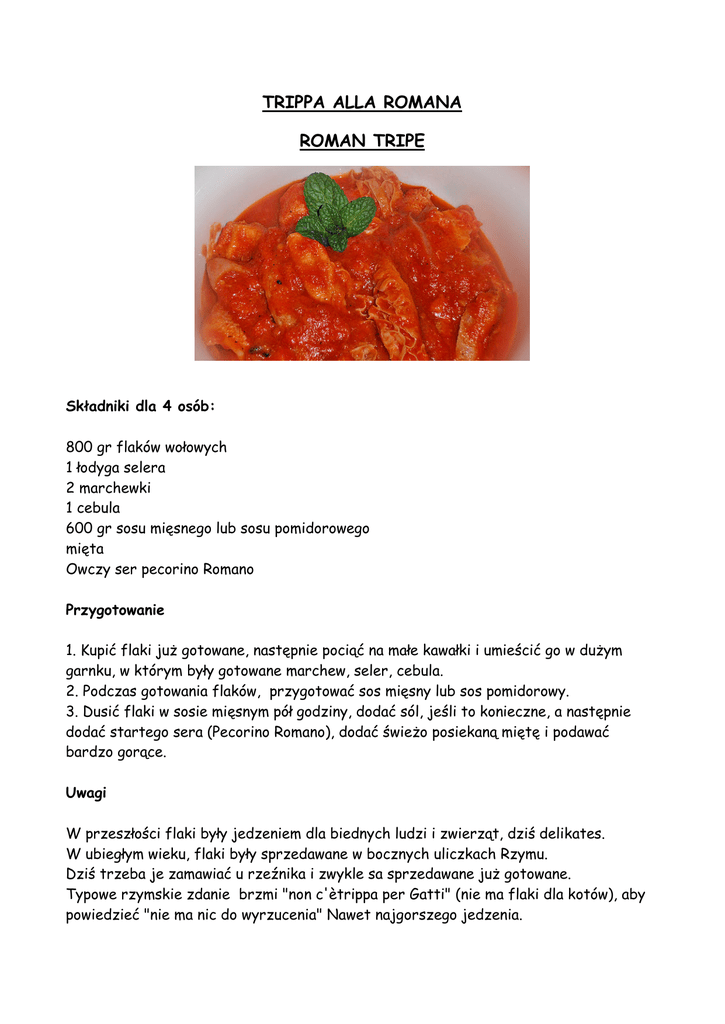 TRIPPA ALLA ROMANA ROMAN TRIPE Składniki dla 4 osób: 800 gr flaków wołowych 1 łodyga selera 2 marchewki 1 cebula 600 gr sosu mięsnego lub sosu pomidorowego mięta Owczy ser pecorino Romano Przygotowanie 1. Kupić flaki już gotowane, następnie pociąć na małe kawałki i umieścić go w dużym garnku, w którym były gotowane marchew, seler, cebula. 2. Podczas gotowania flaków, przygotować sos mięsny lub sos pomidorowy. 3. Dusić flaki w sosie mięsnym pół godziny, dodać sól, jeśli to konieczne, a następnie dodać startego sera (Pecorino Romano), dodać świeżo posiekaną miętę i podawać bardzo gorące. Uwagi W przeszłości flaki były jedzeniem dla biednych ludzi i zwierząt, dziś delikates. W ubiegłym wieku, flaki były sprzedawane w bocznych uliczkach Rzymu. Dziś trzeba je zamawiać u rzeźnika i zwykle sa sprzedawane już gotowane. Typowe rzymskie zdanie brzmi "non c'ètrippa per Gatti" (nie ma flaki dla kotów), aby powiedzieć "nie ma nic do wyrzucenia" Nawet najgorszego jedzenia.
