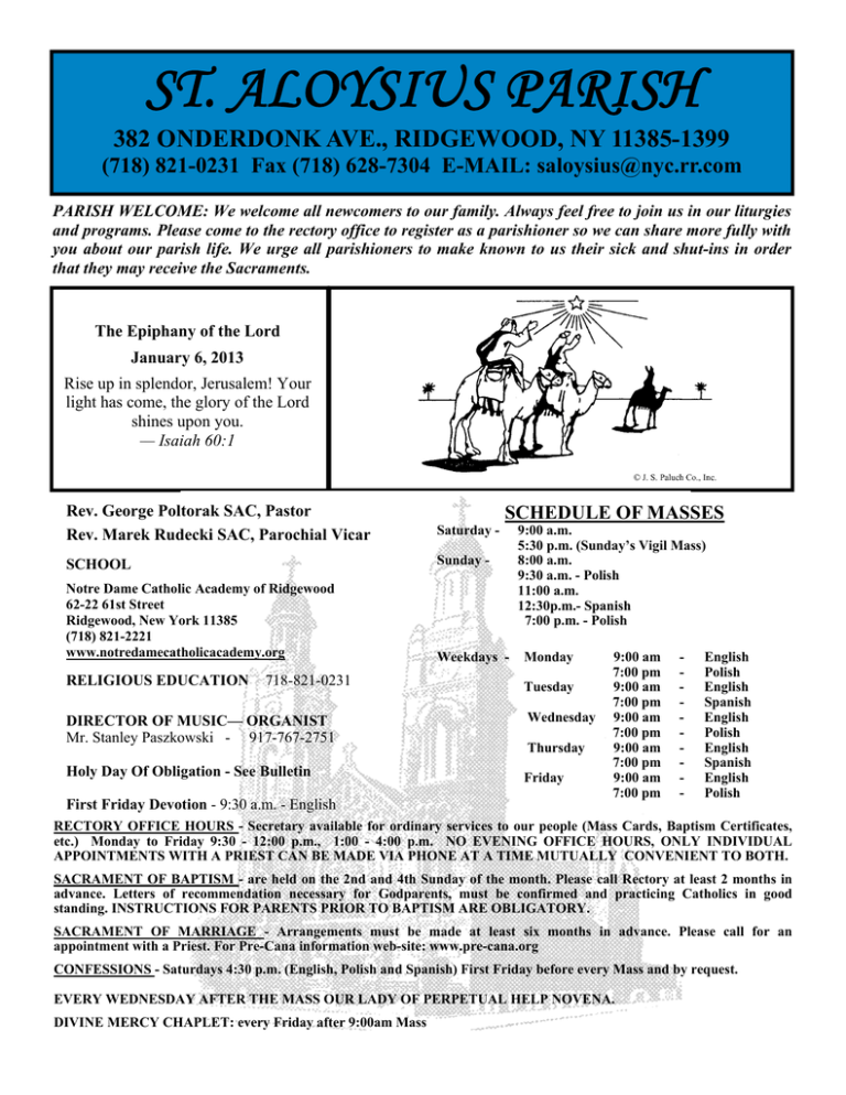 ST. ALOYSIUS PARISH 382 ONDERDONK AVE., RIDGEWOOD, NY 11385-1399 (718) 821-0231 Fax (718) 628-7304 E-MAIL: [email protected] PARISH WELCOME: We welcome all newcomers to our family. Always feel free to join us in our liturgies and programs. Please come to the rectory office to register as a parishioner so we can share more fully with you about our parish life. We urge all parishioners to make known to us their sick and shut-ins in order that they may receive the Sacraments. The Epiphany of the Lord January 6, 2013 Rise up in splendor, Jerusalem! Your light has come, the glory of the Lord shines upon you. — Isaiah 60:1 Rev. George Poltorak SAC, Pastor Rev. Marek Rudecki SAC, Parochial Vicar Saturday - SCHOOL Sunday - Notre Dame Catholic Academy of Ridgewood 62-22 61st Street Ridgewood, New York 11385 (718) 821-2221 www.notredamecatholicacademy.org Weekdays - RELIGIOUS EDUCATION 718-821-0231 DIRECTOR OF MUSIC— ORGANIST Mr. Stanley Paszkowski - 917-767-2751 Holy Day Of Obligation - See Bulletin First Friday Devotion - 9:30 a.m. - English SCHEDULE OF MASSES 9:00 a.m. 5:30 p.m. (Sunday’s Vigil Mass) 8:00 a.m. 9:30 a.m. - Polish 11:00 a.m. 12:30p.m.- Spanish 7:00 p.m. - Polish Monday Tuesday Wednesday Thursday Friday 9:00 am 7:00 pm 9:00 am 7:00 pm 9:00 am 7:00 pm 9:00 am 7:00 pm 9:00 am 7:00 pm - English Polish English Spanish English Polish English Spanish English Polish RECTORY OFFICE HOURS - Secretary available for ordinary services to our people (Mass Cards, Baptism Certificates, etc.) Monday to Friday 9:30 - 12:00 p.m., 1:00 - 4:00 p.m. NO EVENING OFFICE HOURS, ONLY INDIVIDUAL APPOINTMENTS WITH A PRIEST CAN BE MADE VIA PHONE AT A TIME MUTUALLY CONVENIENT TO BOTH. SACRAMENT OF BAPTISM - are held on the 2nd and 4th Sunday of the month. Please call Rectory at least 2 months in advance. Letters of recommendation necessary for Godparents, must be confirmed and practicing Catholics in good standing. INSTRUCTIONS FOR PARENTS PRIOR TO BAPTISM ARE OBLIGATORY. SACRAMENT OF MARRIAGE - Arrangements must be made at least six months in advance. Please call for an appointment with a Priest. For Pre-Cana information web-site: www.pre-cana.org CONFESSIONS - Saturdays 4:30 p.m. (English, Polish and Spanish) First Friday before every Mass and by request. EVERY WEDNESDAY AFTER THE MASS OUR LADY OF PERPETUAL HELP NOVENA. DIVINE MERCY CHAPLET: every Friday after 9:00am Mass PRAY FOR THE SICK SUNDAY – JANUARY 6 — THE EPIPHANY OF THE LORD 8:00AM – LAMBERTO FLORES JR.— Cesar & Lina Luna 9:30AM – GRZEGORZ SIEMIENIEWICZ— od Syna z Rodzinę 11:00AM – MR. & MRS. RALPH SCARPITTA—Dot & Pat 12:30PM – ACCION DE GRACIAS DE FRANCISCO TLAPA ( cumpleaños 18 años ) 7:00PM – HELENA i JANUSZ ŻURYCHO— by Franciszek Cyrzan MONDAY – JANUARY 7 9:00AM – ROSE SERINE— Helena Klesin 7:00PM – JANUSZ JAŻWIEC— od Córki z Rodziną TUESDAY – JANUARY 8 9:00AM – LOUIS STAUDER 7:00PM – FOR ALL THE PEOPLE OF THE PARISH WEDNESDAY– JANUARY 9 9:00AM – 7:00PM – O BŁOG. BOŻE DLA RYSZARDA W 20 URODZINY — od Mamy THURSDAY– JANUARY 10 9:00AM – MARIA ORLANDO WAGNER— Gandolfo Family 7:00PM – FRIDAY— JANUARY 11 9:00AM – 7:00PM – SPECIAL INTENTIONS IN MEMORY OF ZOFIA SATURDAY— JANUARY 12 9:00AM – LAMBERTO FLORES JR. - Ric & Lillian Gaviola & Family 5:30PM – MARGUERITE CAMUTO — Anna Gandolfo SUNDAY – JANUARY 13— THE EPIPHANY OF THE LORD 8:00AM – 9:30AM – GRZEGORZ SIEMIENIEWICZ— od Syna z Rodzinę 11:00AM – LENA ZAMBROTTA— Daughter & Grandchildren 12:30PM – JULIO PEREZ, MAKSYMA BELEZ—de Familia Hidalgo 7:00PM – DZIĘKIZYNNO– BŁAGALNA BARTOSZA i JAKUBA W 8 ROCZ. URODZIN — Rodzice z Siostrą The Sacramental Bread and Wine for the week of TO JANUARY 06 to JANUARY 12 has been offered IN MEMORY OF CLAIRE & JOSEPH DECKERT The SANCTUARY LAMP will burn HONOR OF CLAIRE & JOSEPH DECKERT for the week of JANUARY 06 TO JANUARY 12 Tony Iovino, Jo Trapani, Ignazia Paneduro, Anna Braccioforte, Maria Puma, Nella Elmi, Sara Gioia, Joseph Scarfo, Helen Bach, Salvador, Eliza Mae & Anecito Sorriano, Annmarie Minervini, Oliver Kahn, Carmello Agosto, Justin Pappas, Marie Megiel, Maria Trujillio, Nicolina Caietta, Angelo Tommolino, Ann Iovino, Baby Anthony Miquel Diaz , Patricia Hanley, Maria Grill, Frank DeStefano, and Nina DiGiovanna. Please remember all the sick and homebound in your prayers. TODAY’S READINGS First Reading — Rise up in splendor, Jerusalem! The Lord shines upon you and the glory of the Lord appears over you (Isaiah 60:1-6). Psalm — Lord, every nation on earth will adore you (Psalm 72). Second Reading — The Gentiles are coheirs, copartners in the promise in Christ Jesus through the gospel (Ephesians 3:2-3a, 5-6). Gospel — Magi from the east arrived, looking for the newborn king of the Jews (Matthew 2:1-12). REFLECTION The splendid magi, all sparkle and dash and solemnity, march right up off the pages of Matthew’s Gospel and into our churches today. Matthew alone tells us this grand and seductive story so that we might see the light and know that the child these magi visited is the fulfillment of prophecy, the king of the world that stretches to the magi’s home country and beyond, right down the ages to us. We too see and understand anew. Like the magi, our patron saints for this day, we see in the newborn child the king of the universe and light of the world. Like the magi, we find in ourselves a new faith and a new life. Like them, we return to our home by a new route. We are asked to come away from this festive season ourselves renewed and awake to the presence of God among us. We are asked to find God where God is to be found, to be attentive and surprised and ready to bow down in adoration and to offer our gifts. Copyright © J. S. Paluch Co. KNOW AND NOT TO KNOW Collection last weekend of DECEMBER 23: $4,822.00 English DECEMBER 24 & 25 : $8,029.00 English 2,114.00 2 IN GRATITUDE FOR ALL CHRISTMAS DECORATION DONATIONS 2012 FLOWERS GIVEN BY: L