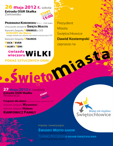 26 maja 2012 r. sobota Estrada OSiR Skałka Żwirowisko T R TA NA S ODZI 0 G :0 5 1 PRZEMARSZ KOROWODU SP nr 1 - OSiR Skałka Uroczyste otwarcie ŚWIĘTA MIASTA Koncert Zespołu VENIMUS z CKŚ KONCERT dla Mamy występ solistek oraz solistów warsztatów artystycznych CKŚ Koncert Zespołu STAUROS ROCK FEVER KALWI i REMI Gwiazda wieczoru Prezydent Miasta Świętochłowice Dawid Kostempski zaprasza na WiLKI POKAZ SZTUCZNYCH OGNI m ś więto a i a t s 27 maja 2012 r. niedziela Estrada OSiR Skałka Restauracja T R TA NA S ODZI 0 G :3 16 Program dla dzieci występ warsztatów artystycznych CKŚ Koncert Zespołu Wywenieni Koncert Zespołu HaNuta KARPOWICZ FAMILY imprezy towarzyszące: ŚWIONY MOTO-SHOW korona stadionu Skałka TURNIEJ RYCERSKI O SKARB ŚWIĘTOSŁAWA teren kąpieliska Skałka