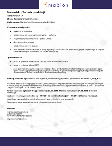 Stanowisko: Technik produkcji Firma: MABION SA Obszar działania firmy: Biofarmacja Miejsce pracy: Mabion SA – Konstantynów Łódzki/ Łódź Wymagane umiejętności: • wykształcenie średnie • umiejętność przygotowania roztworów i buforów • znajomość oprogramowania – pakiet Office • dobra organizacja pracy • umiejętność pracy w zespole • mile widziane (doświadczenie w pracy zgodnej z zasadami GMP, znajomość języka angielskiego w stopniu komunikatywnym, znajomość zasad pracy sterylnej) Opis stanowiska: • praca w systemie zmianowym (zmiany noce dodatkowo płatne) • praca w systemie jakości GMP • zaangażowanie w czynności pomocnicze podczas produkcji leku biotechnologicznego w procesie opartym o innowacyjną technologię (utrzymywanie strefy w gotowości produkcyjnej, bieżący monitoring stanu materiałów, dbałość o sterylność pomieszczeń i urządzeń) Wymogi formalne zgłoszenia: CV ze zdjęciem, list motywacyjny, format tytułu maila: NAZWISKO_IMIĘ_ETAT Prosimy o dopisanie następującej klauzuli: „Wyrażam zgodę na przetwarzanie moich danych osobowych zawartych w ofercie pracy dla potrzeb niezbędnych do realizacji procesu rekrutacji (zgodnie z Ustawą z dnia 29.08.97 r. o Ochronie Danych Osobowych DzU nr 133 poz. 833)” Termin składania zgłoszeń drogą e-mailową: 07.07.2016 (I termin rekrutacji) i 04.08.2016 (II termin rekrutacji) Spotkanie rekrutacyjne odbędzie się 14.07.2016 (I termin rekrutacji) i 11.08.2016 (II termin rekrutacji). Nadesłanie zgłoszenia jest potwierdzeniem dyspozycyjności w ww. terminach. Zastrzegamy sobie prawo do kontaktu tylko z wybranymi osobami. Kontakt: [email protected] ul. Langiewicza 60 95-050 Konstantynów Łódzki http://www.mabion.eu