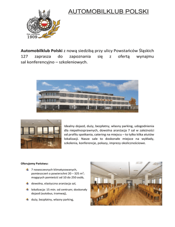 Automobilklub Polski z nową siedzibą przy ulicy Powstańców Śląskich 127 zaprasza do zapoznania się z ofertą wynajmu sal konferencyjno – szkoleniowych. Idealny dojazd, duży, bezpłatny, własny parking, udogodnienia dla niepełnosprawnych, dowolna aranżacja 7 sal w zależności od profilu spotkania, catering na miejscu – to tylko kilka atutów lokalizacji. Nasze sale to doskonałe miejsce na wykłady, szkolenia, konferencje, pokazy, imprezy okolicznościowe. Oferujemy Państwu: 7 nowoczesnych klimatyzowanych, pomieszczeń o powierzchni 20 – 325 m2; mogących pomieścić od 10 do 250 osób, dowolna, elastyczna aranżacja sal, lokalizacja: 15 min. od centrum; doskonały dojazd (autobus, tramwaj), duży, bezpłatny, własny parking, wyposażenie sal dostosowane do potrzeb Klienta, wygodne meble, odpowiednie nagłośnienie, rzutniki multimedialne, tablice, efektowne oświetlenie, duże okna i mobilne, dźwiękoszczelne ściany działowe pozwalające na łączenie sal, przestronne foyer, mobilna szatnia, winda, Wi-Fi, a także internet stacjonarny, na miejscu catering oraz własne zaplecze kuchenne, dostępność przez cały rok, także w weekendy, udogodnienia dla niepełnosprawnych. Możliwe ustawienia sal / ilość osób Automobilklub Polski sala nr 003 - parter sala nr 101 - I piętro sala nr 111 - I piętro (a+b) sala nr 111a - I piętro sala nr 111b - I piętro sala nr 201 - II piętro sala nr 208 - II piętro m2 325 250 85 42 42 20 85 układ teatralny szkolny narada bankietowy 220 160 50 30 30 x x 200 150 40 20 20 x x 200 150 40 20 20 10 40 250 190 x x x x 40 Położenie obiektu, bogata infrastruktura, możliwości adaptacyjne sprawiają, iż Automobilklub Polski jest unikatowym miejscem do organizacji różnego rodzaju eventów. Zapraszamy do zapoznania się z naszą ofertą: Agnieszka Majewska, [email protected], (22) 746 33 46, 502 477 722.