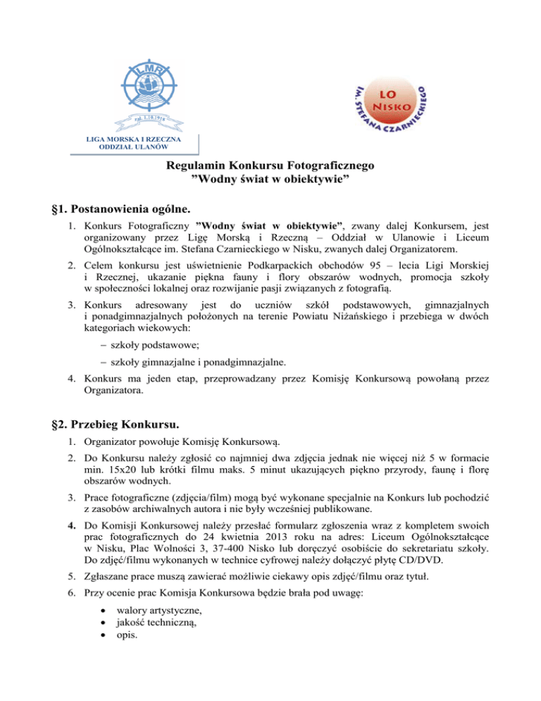 LIGA MORSKA I RZECZNA ODDZIAŁ ULANÓW Regulamin Konkursu Fotograficznego ”Wodny świat w obiektywie” §1. Postanowienia ogólne. 1. Konkurs Fotograficzny ”Wodny świat w obiektywie”, zwany dalej Konkursem, jest organizowany przez Ligę Morską i Rzeczną – Oddział w Ulanowie i Liceum Ogólnokształcące im. Stefana Czarnieckiego w Nisku, zwanych dalej Organizatorem. 2. Celem konkursu jest uświetnienie Podkarpackich obchodów 95 – lecia Ligi Morskiej i Rzecznej, ukazanie piękna fauny i flory obszarów wodnych, promocja szkoły w społeczności lokalnej oraz rozwijanie pasji związanych z fotografią. 3. Konkurs adresowany jest do uczniów szkół podstawowych, gimnazjalnych i ponadgimnazjalnych położonych na terenie Powiatu Niżańskiego i przebiega w dwóch kategoriach wiekowych: szkoły podstawowe; szkoły gimnazjalne i ponadgimnazjalne. 4. Konkurs ma jeden etap, przeprowadzany przez Komisję Konkursową powołaną przez Organizatora. §2. Przebieg Konkursu. 1. Organizator powołuje Komisję Konkursową. 2. Do Konkursu należy zgłosić co najmniej dwa zdjęcia jednak nie więcej niż 5 w formacie min. 15x20 lub krótki filmu maks. 5 minut ukazujących piękno przyrody, faunę i florę obszarów wodnych. 3. Prace fotograficzne (zdjęcia/film) mogą być wykonane specjalnie na Konkurs lub pochodzić z zasobów archiwalnych autora i nie były wcześniej publikowane. 4. Do Komisji Konkursowej należy przesłać formularz zgłoszenia wraz z kompletem swoich prac fotograficznych do 24 kwietnia 2013 roku na adres: Liceum Ogólnokształcące w Nisku, Plac Wolności 3, 37-400 Nisko lub doręczyć osobiście do sekretariatu szkoły. Do zdjęć/filmu wykonanych w technice cyfrowej należy dołączyć płytę CD/DVD. 5. Zgłaszane prace muszą zawierać możliwie ciekawy opis zdjęć/filmu oraz tytuł. 6. Przy ocenie prac Komisja Konkursowa będzie brała pod uwagę: walory artystyczne, jakość techniczną, opis. 7. Po zakończeniu Konkursu Komisja Konkursowa sporządza Protokół przebiegu Konkursu. 8. Udział w konkursie jest jednoznaczny z nieodpłatnym udzieleniem prawa na wykorzystanie prac fotograficznych. §3. Nagrody. 1. Najlepsze prace zostaną zaprezentowane podczas wystawy tematycznej w dniach 27-28 kwietnia 2013 r. w Ulanowie podczas Podkarpackich obchodów 95 – lecia Ligi Morskiej i Rzecznej (filmy zostaną umieszczone na stronie internetowej szkoły) oraz podczas wystawy pokonkursowej w auli Liceum Ogólnokształcącego w Nisku. 2. Autorzy najlepszych prac w poszczególnych kategoriach wiekowych otrzymają nagrody rzeczowe. §4. Terminarz Konkursu. 1. Prace wraz ze zgłoszeniem należy przesłać do 24 kwietnia 2013 roku lub doręczyć osobiście do sekretariatu szkoły. 2. Rozstrzygnięcie Konkursu nastąpi do 27 kwietnia 2013 r. 3. Lista zwycięzców zostanie ogłoszona na stronie internetowej szkoły. 4. Organizator wcześniej przekaże informacje o zwycięstwie. §5. Uwagi końcowe. 1. Niniejszy Regulamin jest jedynym dokumentem określającym zasady przeprowadzenia Konkursu. 2. Organizator zastrzega sobie prawo do zamieszczenia w Internecie i w prasie imion, nazwisk, zdjęć oraz informacji o uczestnikach Konkursu. 3. Organizator zastrzega sobie prawo zmiany Regulaminu Konkursu. 4. W sytuacjach nieobjętych niniejszym Regulaminem rozstrzyga Organizator Konkursu. 5. Wszelkich informacji dotyczących przebiegu Konkursu udziela Dyrektor Liceum Ogólnokształcącego w Nisku Pan Jerzy Stelmach. 6. Wszelką korespondencję związaną z przebiegiem Konkursu należy kierować na adres: Liceum Ogólnokształcące w Nisku, Plac Wolności 3, 37-400 Nisko; tel.(fax) 15 84 12 031; adres e-mail [email protected]. 7. Wszystkie informacje na temat Konkursu będą na bieżąco zamieszczane na stronie internetowej Liceum Ogólnokształcącego w Nisku: www.lo.nisko.pl. Prezes Ligi Morskiej i Rzecznej Oddział Ulanów Dyrektor Liceum Ogólnokształcącego w Nisku mgr Teresa Pracownik mgr Jerzy Stelmach Załącznik Nr 1 do Regulaminu LIGA MORSKA I RZECZNA ODDZIAŁ ULANÓW ZGŁOSZENIE udziału w Konkursie Fotograficznym ”Wodny świat w obiektywie” Zgłaszam swój udział w Konkursie ...................................................................................................................................................... (imię i nazwisko, wiek, klasa) ...................................................................................................................................................... (pełna nazwa szkoły) ...................................................................................................................................................... (opiekun ucznia) ...................................................................................................................................................... (telefon kontaktowy) Wraz ze zgłoszeniem przesyłam komplet zdjęć / film /płytę CD-DVD / opis wraz z tytułem ( właściwe podkreślić). Oświadczam, że jestem autorem wszystkich prac oraz wyrażam zgodę na ich nieodpłatne wykorzystanie w ramach Podkarpackich obchodów 95 – lecia Ligi Morskiej i Rzecznej. Wyrażam zgodę na przetwarzanie danych osobowych dla potrzeb Konkursu zgodnie z ustawą z dnia 29.08.1997 r. o ochronie danych osobowych. (Dz. U. z 2002 r. nr 101, poz.926 ze zm.). ………………………………………. podpis autora (w przypadku osób nieletnich podpis rodziców) ………………………..………… …………………………………………. (pieczątka szkoły) (pieczęć i podpis dyrektora szkoły) Załącznik Nr 2 do Regulaminu LIGA MORSKA I RZECZNA ODDZIAŁ ULANÓW ………………………..………… ……………………., dnia ………………. (pieczątka szkoły) PROTOKÓŁ z przebiegu Konkursu Fotograficznego ”Wodny świat w obiektywie” 1. Skład Komisji Konkursowej: IMIĘ I NAZWISKO PEŁNIONA FUNKCJA Przewodniczący członek komisji członek komisji 2. W Konku