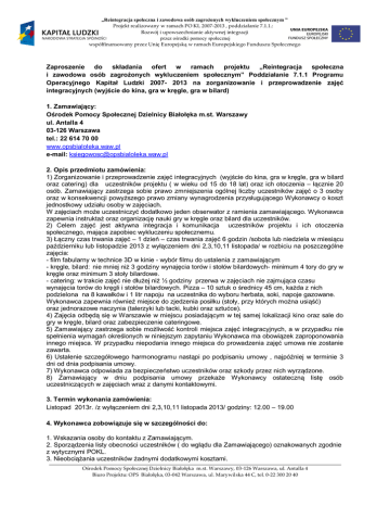 „Reintegracja społeczna i zawodowa osób zagrożonych wykluczeniem społecznym ” Projekt realizowany w ramach PO KL 2007-2013 , poddziałanie 7.1.1.: Rozwój i upowszechnianie aktywnej integracji przez ośrodki pomocy społecznej współfinansowany przez Unię Europejską w ramach Europejskiego Funduszu Społecznego Zaproszenie do składania ofert w ramach projektu „Reintegracja społeczna i zawodowa osób zagrożonych wykluczeniem społecznym” Poddziałanie 7.1.1 Programu Operacyjnego Kapitał Ludzki 2007- 2013 na zorganizowanie i przeprowadzenie zajęć integracyjnych (wyjście do kina, gra w kręgle, gra w bilard) 1. Zamawiający: Ośrodek Pomocy Społecznej Dzielnicy Białołęka m.st. Warszawy ul. Antalla 4 03-126 Warszawa tel.: 22 614 70 00 www.opsbialoleka.waw.pl e-mail: [email protected] 2. Opis przedmiotu zamówienia: 1) Zorganizowanie i przeprowadzenie zajęć integracyjnych (wyjście do kina, gra w kręgle, gra w bilard oraz catering) dla uczestników projektu ( w wieku od 15 do 18 lat) oraz ich otoczenia – łącznie 20 osób. Zamawiający zastrzega sobie prawo zmniejszenia ogólnej liczby uczestników zajęć o 3 osoby oraz w konsekwencji powyższego prawo zmiany wynagrodzenia przysługującego Wykonawcy o koszt jednostkowy udziału osoby w zajęciach. W zajęciach może uczestniczyć dodatkowo jeden obserwator z ramienia zamawiającego. Wykonawca zapewnia instruktaż oraz organizację nauki gry w kręgle oraz bilard dla uczestników. 2) Celem zajęć jest aktywna integracja i komunikacja uczestników projektu i ich otoczenia społecznego, mająca zapobiec wykluczeniu społecznemu. 3) Łączny czas trwania zajęć – 1 dzień – czas trwania zajęć 6 godzin /sobota lub niedziela w miesiącu październiku lub listopadzie 2013 z wyłączeniem dni 2,3,10,11 listopada/ w rozbiciu na poszczególne zajęcia: - film fabularny w technice 3D w kinie - wybór filmu do ustalenia z zamawiającym - kręgle, bilard: nie mniej niż 3 godziny wynajęcia torów i stołów bilardowych- minimum 4 tory do gry w kręgle oraz minimum 3 stoły bilardowe. - catering: w trakcie zajęć nie dłużej niż ½ godziny przerwa w zajęciach nie zajmująca czasu wynajęcia torów do kręgli i stołów bilardowych. Pizza – 10 sztuk o średnicy 45 cm, każda z nich podzielona na 8 kawałków i 1 litr napoju na uczestnika do wyboru herbata, soki, napoje gazowane. Wykonawca zapewnia również miejsce do zjedzenia posiłku (stoły, przy których można usiąść) oraz jednorazowe naczynia (talerzyki lub tacki, kubki oraz sztućce). 4) Zajęcia odbędą się w Warszawie w miejscu posiadającym w tej samej lokalizacji kino oraz sale do gry w kręgle, bilard oraz zabezpieczenie cateringowe. 5) Zamawiający zastrzega sobie możliwość kontroli miejsca zajęć integracyjnych, a w przypadku nie spełnienia wymagań określonych w niniejszym zapytaniu Wykonawca ma obowiązek zaproponowania innego miejsca. W przypadku niepodania innego miejsca do prowadzenia zajęć umowa nie zostanie zawarta. 6) Ustalenie szczegółowego harmonogramu nastąpi po podpisaniu umowy , najpóźniej w terminie 3 dni od dnia podpisania umowy. 7) Wykonawca odpowiada za bezpieczeństwo uczestników oraz szkody przez nich wyrządzone. 8) Zamawiający w dniu podpisania umowy przekaże Wykonawcy ostateczną listę osób uczestniczących w zajęciach wraz z danymi kontaktowymi. 3. Termin wykonania zamówienia: Listopad 2013r. /z wyłączeniem dni 2,3,10,11 listopada 2013/ godziny: 12.00 – 19.00 4. Wykonawca zobowiązuje się w szczególności do: 1. Wskazania osoby do kontaktu z Zamawiającym. 2. Sporządzenia listy obecności uczestników ( do wglądu dla Zamawiającego) oznakowanych zgodnie z wytycznymi POKL. 3. Nieobciążania uczestników żadnymi dodatkowymi kosztami. Ośrodek Pomocy Społecznej Dzielnicy Białołęka m.st. Warszawy, 03-126 Warszawa, ul. Antalla 4 Biuro Projektu: OPS Białołęka, 03-042 Warszawa, ul. Marywilska 44 C, tel. 0-22 300 20 40 „Reintegracja społeczna i zawodowa osób zagrożonych wykluczeniem społecznym ” Projekt realizowany w ramach PO KL 2007-2013 , poddziałanie 7.1.1.: Rozwój i upowszechnianie aktywnej integracji przez ośrodki pomocy społecznej współfinansowany przez Unię Europejską w ramach Europejskiego Funduszu Społecznego 4. Pokrycia kosztów: a) zakupu biletów do kina dla uczestników, b) wynajmu torów do kręgli i stołów bilardowych , c) cateringu dla uczestników, d) ubezpieczenia OC oraz NW na wypadek szkód powstałych w związku z realizacją przedmiotu zamówienia, 5. Przygotowania raportu całościowego z realizacji ww. zamówienia i złożenia go wraz z fakturą VAT/rachunkiem i listą obecności uczestników. 7. OPS Dzielnicy Białołęka m.st. Warszawy nie odpowiada za wszelkie szkody spowodowane przez uczestników w związku z realizacją umowy. 5. Sposób przygotowania oferty: 1) Oferent powinien przedstawić swoją ofertę na formularzu załączonym do niniejszego zapytania- zał. nr 1 oraz dołączyć zał. nr 4 i zał. nr 5 . 2) Oferta musi być podpisana przez osoby upoważnione lub podpisana przez osoby upoważnione i podstemplowana pieczątką imienną. Wszelkie poprawki lub zmiany w tekście oferty muszą być naniesione w sposób czytelny, datowane i podpisane przez osobę upoważnioną. 6. Termin i miejsce składania ofert Ofertę składamy osobiście lub pocztą do 30.10.2013 r. godz. 12. 00 na adres: Ośrodek Pomocy Społecznej Dzielnicy Białołęka m. st. Warszawy ul. Marywilska 44 C, 03-042 Warszawa tel 022 614 70 00 lub 022 300 20 40 UWAGA. Oferty, które wpłyną po terminie nie będą rozpatrywane. 7. Kryteria, którymi Zamawiający będzie się kierował przy wyborze oferty i tryb udzielenia zamówienia. a) Zamawiający udzieli zamówienia u Wykonawcy, który zaoferował najniższą cenę. b) Na podstawie art. 4 pkt. 8 ustawy z dn,. 29. 01.2004 r. (tj. Dz. U. z 2010 r., nr 113, poz 759 z późniejszymi zmianami) przepisów w/w ustawy nie sto