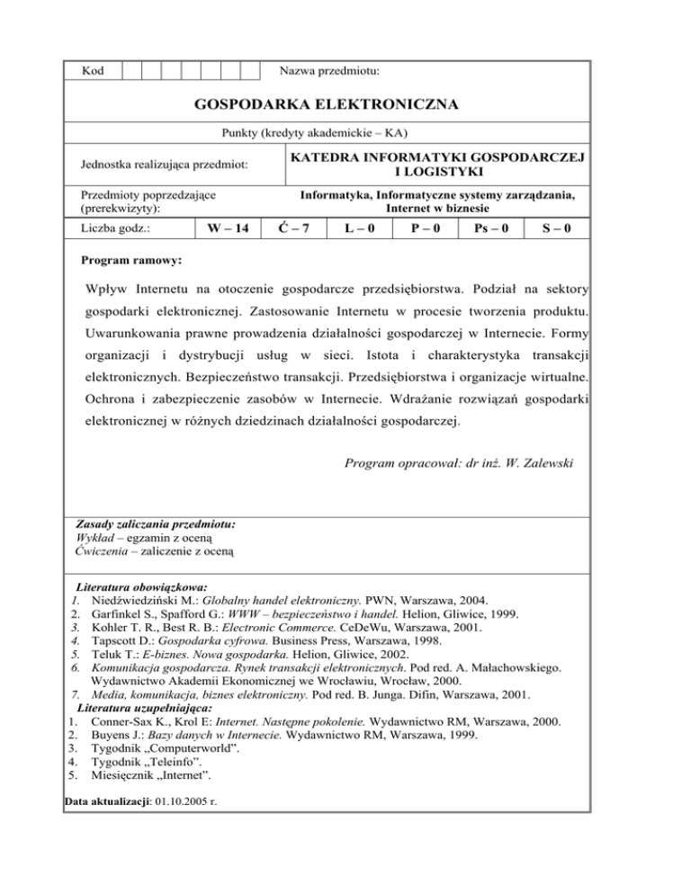 Kod Nazwa przedmiotu: GOSPODARKA ELEKTRONICZNA Punkty (kredyty akademickie – KA) Jednostka realizująca przedmiot: Przedmioty poprzedzające (prerekwizyty): Liczba godz.: W – 14 KATEDRA INFORMATYKI GOSPODARCZEJ I LOGISTYKI Informatyka, Informatyczne systemy zarządzania, Internet w biznesie Ć–7 L–0 P–0 Ps – 0 S–0 Program ramowy: Wpływ Internetu na otoczenie gospodarcze przedsiębiorstwa. Podział na sektory gospodarki elektronicznej. Zastosowanie Internetu w procesie tworzenia produktu. Uwarunkowania prawne prowadzenia działalności gospodarczej w Internecie. Formy organizacji i dystrybucji usług w sieci. Istota i charakterystyka transakcji elektronicznych. Bezpieczeństwo transakcji. Przedsiębiorstwa i organizacje wirtualne. Ochrona i zabezpieczenie zasobów w Internecie. Wdrażanie rozwiązań gospodarki elektronicznej w różnych dziedzinach działalności gospodarczej. Program opracował: dr inż. W. Zalewski Zasady zaliczania przedmiotu: Wykład – egzamin z oceną Ćwiczenia – zaliczenie z oceną Literatura obowiązkowa: 1. Niedźwiedziński M.: Globalny handel elektroniczny. PWN, Warszawa, 2004. 2. Garfinkel S., Spafford G.: WWW – bezpieczeństwo i handel. Helion, Gliwice, 1999. 3. Kohler T. R., Best R. B.: Electronic Commerce. CeDeWu, Warszawa, 2001. 4. Tapscott D.: Gospodarka cyfrowa. Business Press, Warszawa, 1998. 5. Teluk T.: E-biznes. Nowa gospodarka. Helion, Gliwice, 2002. 6. Komunikacja gospodarcza. Rynek transakcji elektronicznych. Pod red. A. Małachowskiego. Wydawnictwo Akademii Ekonomicznej we Wrocławiu, Wrocław, 2000. 7. Media, komunikacja, biznes elektroniczny. Pod red. B. Junga. Difin, Warszawa, 2001. Literatura uzupełniająca: 1. Conner-Sax K., Krol E: Internet. Następne pokolenie. Wydawnictwo RM, Warszawa, 2000. 2. Buyens J.: Bazy danych w Internecie. Wydawnictwo RM, Warszawa, 1999. 3. Tygodnik „Computerworld”. 4. Tygodnik „Teleinfo”. 5. Miesięcznik „Internet”. Data aktualizacji: 01.10.2005 r.