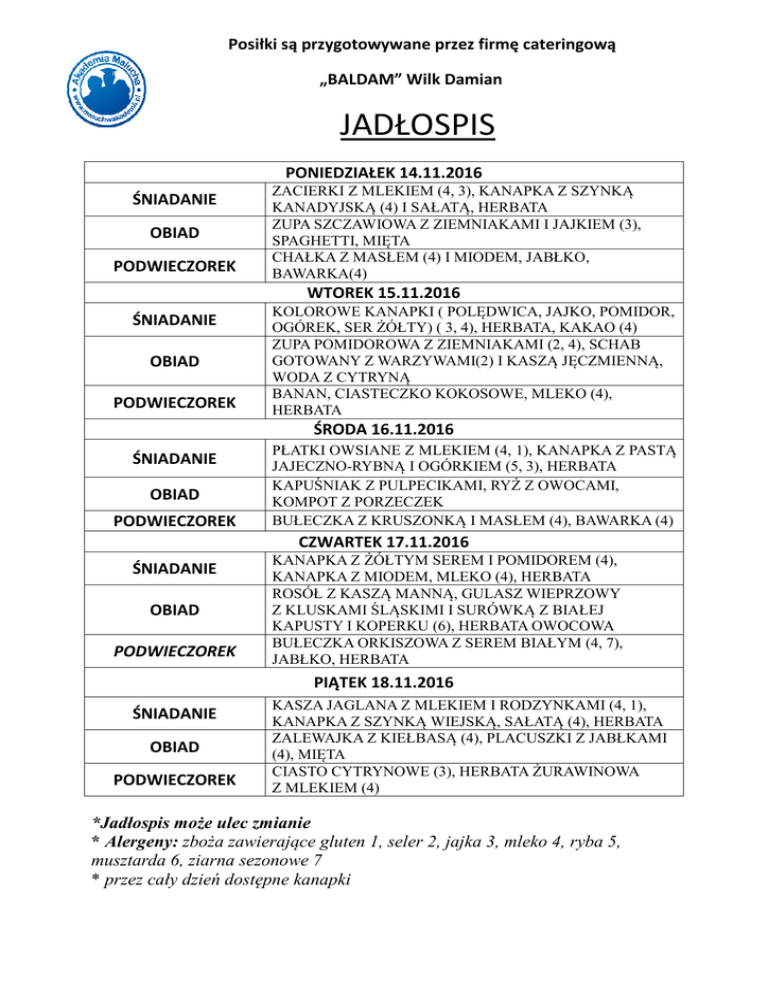Posiłki są przygotowywane przez firmę cateringową „BALDAM” Wilk Damian JADŁOSPIS PONIEDZIAŁEK 14.11.2016 ŚNIADANIE OBIAD PODWIECZOREK ZACIERKI Z MLEKIEM (4, 3), KANAPKA Z SZYNKĄ KANADYJSK (4) I SAŁATĄ, HERBATA KANADYJSKĄ ZUPA SZCZAWIOWA Z ZIEMNIAKAMI ZIEMNIAKAMI I JAJKIEM (3), SPAGHETTI, MIĘTA CHAŁK Z MASŁEM (4) I MIODEM, JABŁKO, CHAŁKA BAWARKA(4) WTOREK 15.11.2016 ŚNIADANIE OBIAD PODWIECZOREK KOLOROWE KANAPKI ( POLĘDWICA, POL DWICA, JAJKO, JA POMIDOR, OGÓREK, SER ŻÓŁTY) ( 3, 4), HERBATA, KAKAO (4) ZUPA POMIDOROWA Z ZIEMNIAKAMI (2, 4), SCHAB GOTOWANY Z WARZYWAMI(2) I KASZĄ KASZĄ JĘCZMIENNĄ, Ę WODA Z CYTRYNĄ CYTRYN BANAN, CIASTECZKO KOKOSOWE, MLEKO (4), HERBATA ŚRODA 16.11.2016 ŚNIADANIE OBIAD PODWIECZOREK PŁATKI OWSIANE Z MLEKIEM (4, 1), KANAPKA Z PASTĄ JAJECZNO JAJECZNO-RYBNĄ I OGÓRKIEM (5, 3), HERBATA KAPU KAPUŚNIAK Z PULPECIKAMI, RYŻ Ż Z OWOCAMI, KOMPOT Z PORZECZEK BUŁECZKA Z KRUSZONKĄ KRUSZONK I MASŁEM (4), BAWARKA (4) CZWARTEK 17.11.2016 ŚNIADANIE OBIAD PODWIECZOREK KANAPKA Z ŻÓŁTYM ÓŁTYM SEREM I POMIDOREM (4), KANAPKA Z MIODEM, MLEKO (4), HERBATA ROSÓŁ Z KASZĄ KASZ MANNĄ,, GULASZ WIEPRZOWY Z KLUSKAMI ŚLĄSKIMI I SURÓWKĄ Z BIAŁEJ KAPUSTY I KOPERKU (6), HERBATA OWOCOWA BUŁECZKA ORKISZOWA Z SEREM BIAŁYM (4, 7), JABŁKO, HERBATA PIĄTEK 18.11.2016 ŚNIADANIE OBIAD PODWIECZOREK KASZA JAGLANA Z MLEKIEM I RODZYNKAMI (4, 1), KANAPKA Z SZYNKĄ SZYNK WIEJSKĄ, SAŁATĄ (4), HERBATA ZALEWAJKA Z KIEŁBASĄ KIEŁBAS (4),, PLACUSZKI Z JABŁKAMI (4), MIĘTA MI CIASTO CYTRYNOWE (3), HERBATA ŻURAWINOWA Z MLEKIEM (4) *Jadłospis możee ulec zmianie * Alergeny: zbożaa zawierające zawierają gluten 1, seler 2, jajka 3, mleko 4, ryba 5, musztarda 6, ziarna sezonowe 7 * przez cały dzień dostępne ępne kanapki