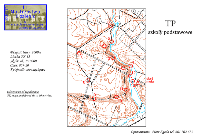 SKRÓTY II Mistrzostwa Kozienic w marszach na orientację TP 6 Garbatka Let.,12.09.2014 szkoły podstawowe 5 4 Długość trasy: 2600m Liczba PK 13 Skala: ok. 1:10000 Czas: 85+ 20 Kolejność: obowiązkowa 7 3 1 2 start meta 8 Odstępstwo od regulaminu: PK mogą znajdować się co 10 metrów. 12 11 13 9 10 Opracowanie: Piotr Zgoda tel. 661 702 673
