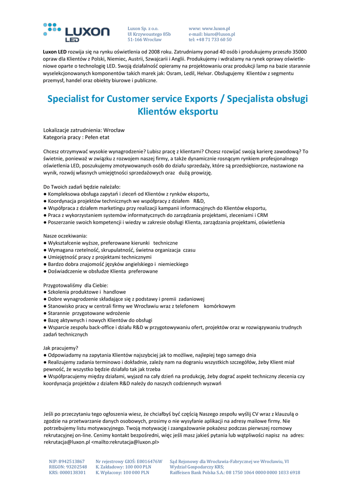 Luxon Sp. z o.o. Ul Krzywoustego 85b 51-166 Wrocław www: www.luxon.pl e-mail: [email protected] tel: +48 71 733 60 50 Luxon LED rozwija się na rynku oświetlenia od 2008 roku. Zatrudniamy ponad 40 osób i produkujemy przeszło 35000 opraw dla Klientów z Polski, Niemiec, Austrii, Szwajcarii i Anglii. Produkujemy i wdrażamy na rynek oprawy oświetleniowe oparte o technologię LED. Swoją działalność opieramy na projektowaniu oraz produkcji lamp na bazie starannie wyselekcjonowanych komponentów takich marek jak: Osram, Ledil, Helvar. Obsługujemy Klientów z segmentu przemysł, handel oraz obiekty biurowe i publiczne. Specialist for Customer service Exports / Specjalista obsługi Klientów eksportu Lokalizacje zatrudnienia: Wrocław Kategoria pracy : Pełen etat Chcesz otrzymywać wysokie wynagrodzenie? Lubisz pracę z klientami? Chcesz rozwijać swoją karierę zawodową? To świetnie, ponieważ w związku z rozwojem naszej firmy, a także dynamicznie rosnącym rynkiem profesjonalnego oświetlenia LED, poszukujemy zmotywowanych osób do działu sprzedaży, które są przedsiębiorcze, nastawione na wynik, rozwój własnych umiejętności sprzedażowych oraz dużą prowizję. Do Twoich zadań będzie należało: Kompleksowa obsługa zapytań i zleceń od Klientów z rynków eksportu, Koordynacja projektów technicznych we współpracy z działem R&D, Współpraca z działem marketingu przy realizacji kampanii informacyjnych do Klientów eksportu, Praca z wykorzystaniem systemów informatycznych do zarządzania projektami, zleceniami i CRM Poszerzanie swoich kompetencji i wiedzy w zakresie obsługi Klienta, zarządzania projektami, oświetlenia Nasze oczekiwania: Wykształcenie wyższe, preferowane kierunki techniczne Wymagana rzetelność, skrupulatność, świetna organizacja czasu Umiejętność pracy z projektami technicznymi Bardzo dobra znajomość języków angielskiego i niemieckiego Doświadczenie w obsłudze Klienta preferowane Przygotowaliśmy dla Ciebie: Szkolenia produktowe i handlowe Dobre wynagrodzenie składające się z podstawy i premii zadaniowej Stanowisko pracy w centrali firmy we Wrocławiu wraz z telefonem komórkowym Starannie przygotowane wdrożenie Bazę aktywnych i nowych Klientów do obsługi Wsparcie zespołu backoffice i działu R&D w przygotowywaniu ofert, projektów oraz w rozwiązywaniu trudnych zadań technicznych Jak pracujemy? Odpowiadamy na zapytania Klientów najszybciej jak to możliwe, najlepiej tego samego dnia Realizujemy zadania terminowo i dokładnie, zależy nam na dograniu wszystkich szczegółów, żeby Klient miał pewność, że wszystko będzie działało tak jak trzeba Współpracujemy między działami, wyjazd na cały dzień na produkcję, żeby dograć aspekt techniczny zlecenia czy koordynacja projektów z działem R&D należy do naszych codziennych wyzwań Jeśli po przeczytaniu tego ogłoszenia wiesz, że chciałbyś być częścią Naszego zespołu wyślij CV wraz z klauzulą o zgodzie na przetwarzanie danych osobowych, prosimy o nie wysyłanie aplikacji na adresy mailowe firmy. Nie potrzebujemy listu motywacyjnego. Twoją motywację i zaangażowanie pokażesz podczas pierwszej rozmowy rekrutacyjnej online. Cenimy kontakt bezpośredni, więc jeśli masz jakieś pytania lub wątpliwości napisz na adres: [email protected] <mailto:[email protected]> NIP: 8942513867 REGON: 93202548 KRS: 0000138301 Nr rejestrowy GIOŚ: E0016476W K. Zakładowy: 100 000 PLN K. Wpłacony: 100 000 PLN Sąd Rejonowy dla Wrocławia-Fabrycznej we Wrocławiu, VI Wydział Gospodarczy KRS; Raiffeisen Bank Polska S.A.: 08 1750 1064 0000 0000 1033 6918