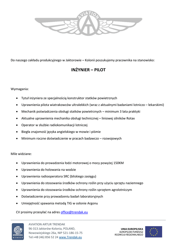 Do naszego zakładu produkcyjnego w Jaktorowie – Kolonii poszukujemy pracownika na stanowisko: INŻYNIER – PILOT Wymagania: Tytuł inżyniera ze specjalnością konstruktor statków powietrznych Uprawnienia pilota wiatrakowców ultralekkich (wraz z aktualnymi badaniami lotniczo – lekarskimi) Mechanik poświadczenia obsługi statków powietrznych – minimum 3 lata praktyki Aktualne uprawnienia mechanika obsługi technicznej – liniowej silników Rotax Operator w służbie radiokomunikacji lotniczej Biegła znajomość języka angielskiego w mowie i piśmie Minimum roczne doświadczenie w pracach badawczo – rozwojowych Mile widziane: Uprawnienia do prowadzenia łodzi motorowej o mocy powyżej 150KM Uprawnienia do holowania na wodzie Uprawnienia radiooperatora SRC (bliskiego zasięgu) Uprawnienia do stosowania środków ochrony roślin przy użyciu sprzętu naziemnego Uprawnienia do stosowania środków ochrony roślin sprzętem agrolotniczym Doświadczenie przy prowadzeniu badań laboratoryjnych Umiejętność spawania metodą TIG w osłonie Argonu CV prosimy przesyłać na adres [email protected] ----------------------------------------------------------------------------------------------------------------------------------------------------------AVIATION ARTUR TRENDAK 96-313 Jaktorów-Kolonia, POLAND, Nowowiejskiego 26a, NIP 521-186-15-75 Tel:+48 (46) 856 52 24 www.Trendak.eu