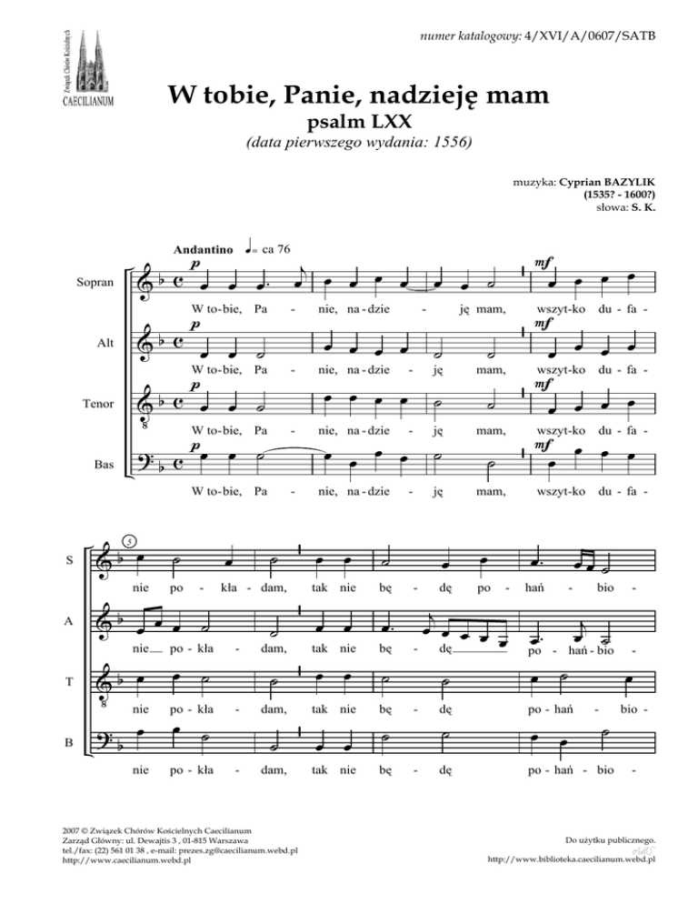 numer katalogowy: 4/XVI/A/0607/SATB W tobie, Panie, nadzieję mam psalm LXX (data pierwszego wydania: 1556) muzyka: Cyprian BAZYLIK (1535? - 1600?) słowa: S. K. Ú p Andantino ca 76 & b c œ œ œ. Sopran p W to- bie, Pa &b c Alt p - œ œ ˙ W to- bie, Pa ? b c pœ œ ˙ W to- bie, Pa Bas 5 S nie A Vb œ nie B po - &b œ œ œ ˙ nie T ˙ ?b œ nie po - kła œ ˙ po - kła nie, na - dzie œ œ œ œ nie, na - dzie œ œ œ œ - ˙ œ œ œ œ œ - W to- bie, Pa &b œ nie, na - dzie - Vb c œ œ ˙ Tenor j œ œ œ œ œ nie, na - dzie | kła - dam, - ˙ dam, ˙ œ ˙ - po - kła - | | dam, 2007 © Związek Chórów Kościelnych Caecilianum Zarząd Główny: ul. Dewajtis 3 , 01-815 Warszawa tel./fax: (22) 561 01 38 , e-mail: [email protected] http://www.caecilianum.webd.pl - ˙ ję mam, ˙ ˙ ję ˙ - ˙ ję mam, œ œ - œ œ œ. j œ œ œ œ œ dę œ œ œ œ tak nie bę ˙ dę | mam, ˙ po - F œ œ œ œ du - fa - F œ œ œ œ wszyt-ko | ˙ F œ œ œ œ wszyt-ko | bę tak nie | ˙ - ję mam, tak nie tak nie dam, ˙ œ œ - œ œ ˙ | du - fa - F œ œ œ œ wszyt-ko du - fa - wszyt-ko du - fa - œ. hań - œ. œœ ˙ - j œ ˙ - bio po - hań - bio œ ˙ bę - dę po - hań bę - dę po - hań - bio ˙ ˙ œ œ - ˙ œ bio - - Do uŜytku publicznego. http://www.biblioteka.caecilianum.webd.pl W tobie, Panie, nadzieję mam - Cyprian BAZYLIK S &b ˙ | ny A T &b ˙ ny B ny p œ u | ny ?b ˙ p œ. œ u - Ŝy | Vb ˙ p œ p œ - ˙ wa j œ ˙ u - Ŝy - ˙ œ œ - - - œ jąc œ twej poco rit. œ o - ˙ W aœ bro - ny. - poco rit. Ŝy - wa - u - Ŝy | 10 wa ˙ wa - - œ jąc œ jąc œ jąc œ œ œ o - œ œ twej o - twej œ twej œ ˙ bro poco rit. œ œ ˙ bro poco rit. o - - ny. W - ny. - W ˙ bro W ny. PSALM LXX In te, Domine, speravi. 1. W tobie, Panie, nadzieję mam, Wszytko dufanie pokładam, Tak nie będę pohańbiony UŜywając twej obrony. 6. Oto przeciwnicy moi Przeciwko sie mnie spiknęli, Radząc jako by szkodzili, Duszę moję zatracili, 11. Ty, Panie, z młodości mojej Uczyłeś mie wolej swojej, DajŜe mi w niej do końca trwać, Nie racz mie nigdy opuszczać. 2. Wyzwol mie z twojej lutości Od wszelkiej niebezpieczności, Nachyl ku mnie ucha twego, A zbaw człowieka grzesznego. 7. Mówiąc: JuŜ go Bóg porzucił, Z obrony swojej opuścił, JuŜ go łatwie załapiemy, Jako chcemy, utrapiemy. 12. Odtąd do starości mojej Niech będę w opiece twojej, Abych i inszem objawiał, Jakąś ty ku mnie lutość miał. 3. 8. Bądź ty, Panie, ma obrona, BoŜe mój, przydź mi na pomoc, Boć moja rzecz jest stracona, Potłum ich wszytkę usilność, Wszakeś obiecał wysłuchać, Co sie ze mnie urągają, Człowieka w smętku pocieszać. Bo ciebie, Panie, nie znają. 13. Tyś mię beł, Panie, zasmucił, Aleś mie zaś sam pocieszył, Wyrwałeś mię z tej przepaści, Nieprzyjacielskiej chytrości. 4. 9. BoŜe, ciebie oczekawam, NiechŜe sie ich rada zmieni, Od młodości mojej wzywam, Aby beli pohańbieni, Wyzwol mie z ręki gwałtownej, A niech sie wstydzą zdrady swej, NiezboŜności świata zdradnej. Którą czynili duszy mej. 14. Przeto tobie moja dusza Będzie śpiewać, jako słusza, Język, takieŜ wargi moje Nie ustaną w twojej chwale. 5. Stałem sie światu wzgardzony, Od wszech prawie opuszczony, WszakŜe ja o to nic nie dbam, W Bodze mocną nadzieję mam. 10. BoŜe, ciebie będę chwalić, Sprawiedliwość twoję sławić, Ciebie jedyną pomoc mam, Bo inego Boga nie znam. -2- 15. Tobie poruczam, BoŜe mój, Duszę, ciało i Ŝywot mój, Sprawuj ty mnie, sługę swego, AŜ do Ŝywota wiecznego. http://www.biblioteka.caecilianum.webd.pl