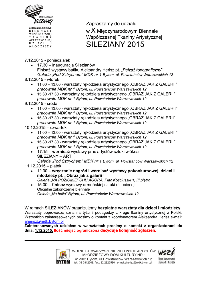 Zapraszamy do udziału w X Międzynarodowym Biennale Współczesnej Tkaniny Artystycznej SILEZIANY 2015 7.12.2015 - poniedziałek 17.30 – inauguracja Silezianów Finisaż wystawy batiku Aleksandry Herisz pt. „Pejzaż topograficzny” Galeria „Pod Sztrychem” MDK nr 1 Bytom, ul. Powstańców Warszawskich 12 8.12.2015 - wtorek 11.00 – 13.00 - warsztaty rękodzieła artystycznego „OBRAZ JAK Z GALERII” pracownie MDK nr 1 Bytom, ul. Powstańców Warszawskich 12 15.30 -17.30 - warsztaty rękodzieła artystycznego „OBRAZ JAK Z GALERII” pracownie MDK nr 1 Bytom, ul. Powstańców Warszawskich 12 9.12.2015 - środa 11.00 – 13.00 - warsztaty rękodzieła artystycznego „OBRAZ JAK Z GALERII” pracownie MDK nr 1 Bytom, ul. Powstańców Warszawskich 12 15.30 -17.30 - warsztaty rękodzieła artystycznego „OBRAZ JAK Z GALERII” pracownie MDK nr 1 Bytom, ul. Powstańców Warszawskich 12 10.12.2015 – czwartek 11.00 – 13.00 - warsztaty rękodzieła artystycznego „OBRAZ JAK Z GALERII” pracownie MDK nr 1 Bytom, ul. Powstańców Warszawskich 12 15.30 -17.30 - warsztaty rękodzieła artystycznego „OBRAZ JAK Z GALERII” pracownie MDK nr 1 Bytom, ul. Powstańców Warszawskich 12 17.15 – wernisaż wystawy prac artystów sztuki włókna SILEZIANY – ART Galeria „Pod Sztrychem” MDK nr 1 Bytom, ul. Powstańców Warszawskich 12 11.12.2015 – piątek 12.00 – wręczanie nagród i wernisaż wystawy pokonkursowej dzieci i młodzieży pt. „Obraz jak z galerii” Galeria „NA POZIOMIE” CHU AGORA, Plac Kościuszki 1; III piętro 15.00 – finisaż wystawy armeńskiej sztuki dziecięcej Oficjalne zakończenie biennale Galeria „Na hollu” Bytom, ul. Powstańców Warszawskich 12 W ramach SILEZIANÓW organizujemy bezpłatne warsztaty dla dzieci i młodzieży Warsztaty poprowadzą uznani artyści i pedagodzy z kręgu tkaniny artystycznej z Polski. Wszystkich zainteresowanych prosimy o kontakt z koordynatorem Aleksandrą Herisz e-mail: [email protected] Zainteresowanych udziałem w warsztatach prosimy o kontakt z organizatorami do dnia: 1.12.2015. Ilość miejsc ograniczona decyduje kolejność zgłoszeń. WOLNE STOWARZYSZENIE ZIELONYCH ARTYSTÓW MŁODZIEŻOWY DOM KULTURY NR 1 41-902 Bytom, ul.Powstańców Warszawskich 12 tel.: 32 2812508, fax.: 32 2825580 e-mail:[email protected]