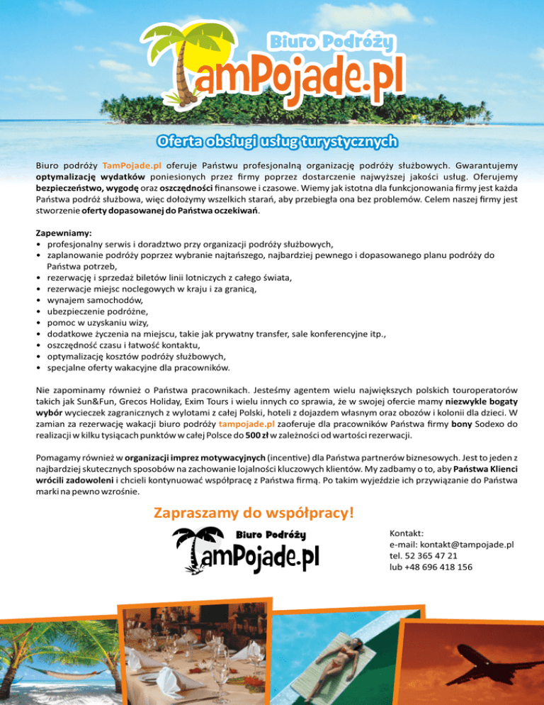 Oferta obsługi usług turystycznych Biuro podróży TamPojade.pl oferuje Państwu profesjonalną organizację podróży służbowych. Gwarantujemy optymalizację wydatków poniesionych przez firmy poprzez dostarczenie najwyższej jakości usług. Oferujemy bezpieczeństwo, wygodę oraz oszczędności finansowe i czasowe. Wiemy jak istotna dla funkcjonowania firmy jest każda Państwa podróż służbowa, więc dołożymy wszelkich starań, aby przebiegła ona bez problemów. Celem naszej firmy jest stworzenie oferty dopasowanej do Państwa oczekiwań. Zapewniamy: • profesjonalny serwis i doradztwo przy organizacji podróży służbowych, • zaplanowanie podróży poprzez wybranie najtańszego, najbardziej pewnego i dopasowanego planu podróży do Państwa potrzeb, • rezerwację i sprzedaż biletów linii lotniczych z całego świata, • rezerwacje miejsc noclegowych w kraju i za granicą, • wynajem samochodów, • ubezpieczenie podróżne, • pomoc w uzyskaniu wizy, • dodatkowe życzenia na miejscu, takie jak prywatny transfer, sale konferencyjne itp., • oszczędność czasu i łatwość kontaktu, • optymalizację kosztów podróży służbowych, • specjalne oferty wakacyjne dla pracowników. Nie zapominamy również o Państwa pracownikach. Jesteśmy agentem wielu największych polskich touroperatorów takich jak Sun&Fun, Grecos Holiday, Exim Tours i wielu innych co sprawia, że w swojej ofercie mamy niezwykle bogaty wybór wycieczek zagranicznych z wylotami z całej Polski, hoteli z dojazdem własnym oraz obozów i kolonii dla dzieci. W zamian za rezerwację wakacji biuro podróży tampojade.pl zaoferuje dla pracowników Państwa firmy bony Sodexo do realizacji w kilku tysiącach punktów w całej Polsce do 500 zł w zależności od wartości rezerwacji. Pomagamy również w organizacji imprez motywacyjnych (incen ve) dla Państwa partnerów biznesowych. Jest to jeden z najbardziej skutecznych sposobów na zachowanie lojalności kluczowych klientów. My zadbamy o to, aby Państwa Klienci wrócili zadowoleni i chcieli kontynuować współpracę z Państwa firmą. Po takim wyjeździe ich przywiązanie do Państwa marki na pewno wzrośnie. Zapraszamy do współpracy! Kontakt: e-mail: [email protected] tel. 52 365 47 21 lub +48 696 418 156