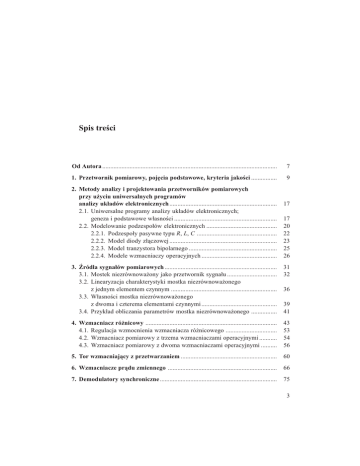 Spis treci Od Autora ............................................................................................................. 7 1. Przetwornik pomiarowy, pojêcia podstawowe, kryteria jakoci ................ 9 2. Metody analizy i projektowania przetworników pomiarowych przy u¿yciu uniwersalnych programów analizy uk³adów elektronicznych ................................................................... 2.1. Uniwersalne programy analizy uk³adów elektronicznych; geneza i podstawowe w³asnoci ................................................................ 2.2. Modelowanie podzespo³ów elektronicznych ............................................ 2.2.1. Podzespo³y pasywne typu 4, L, C .................................................. 2.2.2. Model diody z³¹czowej ................................................................... 2.2.3. Model tranzystora bipolarnego ....................................................... 2.2.4. Modele wzmacniaczy operacyjnych ............................................... 17 17 20 22 23 25 26 3. ród³a sygna³ów pomiarowych ...................................................................... 3.1. Mostek niezrównowa¿ony jako przetwornik sygna³u ............................... 3.2. Linearyzacja charakterystyki mostka niezrównowa¿onego z jednym elementem czynnym .................................................................. 3.3. W³asnoci mostka niezrównowa¿onego z dwoma i czterema elementami czynnymi ............................................... 3.4. Przyk³ad obliczania parametrów mostka niezrównowa¿onego ................ 31 32 4. Wzmacniacz ró¿nicowy .................................................................................. 4.1. Regulacja wzmocnienia wzmacniacza ró¿nicowego ................................ 4.2. Wzmacniacz pomiarowy z trzema wzmacniaczami operacyjnymi ........... 4.3. Wzmacniacz pomiarowy z dwoma wzmacniaczami operacyjnymi .......... 43 53 54 56 5. Tor wzmacniaj¹cy z przetwarzaniem ............................................................ 60 6. Wzmacniacze pr¹du zmiennego .................................................................... 66 7. Demodulatory synchroniczne ......................................................................... 75 36 39 41 3 8. Filtry wyjciowe .............................................................................................. 8.1. Filtr dolnoprzepustowy drugiego rzêdu o wielokrotnym sprzê¿eniu zwrotnym ...................................................... 8.2. Filtr dolnoprzepustowy drugiego rzêdu o dodatnim sprzê¿eniu zwrotnym .............................................................. 8.3. Przyk³ad obliczania parametrów filtru dolnoprzepustowego typu Butterwortha jako filtru wyjciowego wzmacniacza z przetwarzaniem ......................... 81 9. Generatory samowzbudne .............................................................................. 9.1. Generatory liniowe .................................................................................... 9.1.1. Generator z czwórnikiem Wiena .................................................... 9.1.2. Generator z czwórnikiem Wiena wyposa¿ony w uk³ad automatycznej regulacji wzmocnienia .............................. 9.1.3. Generator z przesuwnikami fazowymi ........................................... 9.1.4. Generator z filtrem pasmowym ...................................................... 9.1.5. Generator z integratorami ............................................................... 9.2. Generatory nieliniowe ............................................................................... 9.2.1. Komparator z histerez¹ zbudowany przy u¿yciu wzmacniacza operacyjnego ........................................ 9.2.2. Generator nieliniowy z jednym wzmacniaczem operacyjnym ....... 9.2.3. Nieliniowy generator z integratorem aktywnym i komparatorem z histerez¹ ............................................................. 94 94 96 10. Tor pomiarowy z modulacj¹ czêstotliwoci .................................................. 10.1. Przetworniki sygna³u parametrycznego na czêstotliwoæ ....................... 10.1.1. Bezporedni przetwornik ma³ych zmian εR na czêstotliwoæ ........................................................................... 10.2. Przetworniki napiêcie/czêstotliwoæ ....................................................... 10.2.1. Przetwornik napiêcie/czêstotliwoæ z kompensacj¹ ³adunku ............................................................... 10.2.2. Modulator sigma/delta (przetwornik napiêcie/czêstotliwoæ z obcym zegarem) ............. 11. Pomiarowe demodulatory czêstotliwoci przetworniki czêstotliwoæ/napiêcie ........................................................... 11.1. Demodulator czêstotliwoci z urednianiem impulsów standaryzowanych przez ró¿niczkowanie ..... 11.2. Demodulator czêstotliwoci z urednianiem impulsów standaryzowanych przez uniwibrator ............ 11.3. Demodulacja czêstotliwoci z wykorzystaniem uk³adu synchronicznej pêtli fazowej PLL ........................................................... 4 86 88 89 98 99 102 103 108 109 110 112 113 114 118 121 121 123 127 128 130 131 12. Analogowe uk³ady obróbki sygna³ów ............................................................ 12.1. Dodawanie i odejmowanie sygna³ów ...................................................... 12.2. Uk³ady logarytmuj¹ce i alogarytmuj¹ce .................................................. 12.3. Mno¿enie i dzielenie sygna³ów ............................................................... 12.3.1. Mno¿enie sygna³ów krótki rys historyczny ............................. 12.3.2. Uk³ad mno¿¹cy o zmiennej transkonduktancji ........................... 12.3.3. Uk³ad mno¿¹cy z modulacj¹ wysokoci i szerokoci impulsów ................................................................. 12.3.4. Elektromechaniczny przetwornik do pomiaru mocy mec