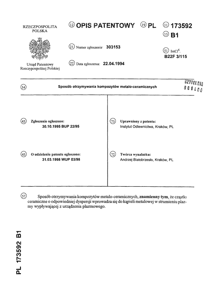 (12) OPIS PATENTOWY (19)PL R ZEC ZPO SPO LITA POLSKA ( 2 1) Numer zgłoszenia: 303153 (11) 173592 (13) B1 (51) IntCl6: B22F 3/115 Urząd Patentowy Rzeczypospolitej Polskiej (54) (43) (22) Data zgłoszenia: 22.04.1994 Sposób otrzymywania kompozytów metalo-ceramicznych Zgłoszenie ogłoszono: (7 3 ) 30.10.1995 BUP 22/95 (45) O udzieleniu patentu ogłoszono: 31.03.1998 WUP 03/98 PL 173592 B1 (57) Uprawniony z patentu: Instytut Odlewnictwa, Kraków, PL (72) Twórca wynalazku: Andrzej Białobrzeski, Kraków, PL Sposób otrzymywania kompozytów metalo-ceramicznych, znamienny tym, że cząstki ceramiczne o odpowiedniej dyspersji wprowadza się do kąpieli metalowej w strumieniu plazmy wypływającej z urządzenia plazmowego. Sposób otrzymywania kompozytów metalo-ceramicznych Zastrzeżenie patentowe Sposób otrzymywania kompozytów metalo-ceramicznych, znamienny tym, że cząstki ceramiczne o odpowiedniej dyspersji wprowadza się do kąpieli metalowej w strumieniu plazmy wypływającej z urządzenia plazmowego. * * * Przedmiotem wynalazku jest sposób otrzymywania kompozytów metalo-ceramicznych, zwłaszcza z cząstkami ceramicznymi o wysokiej temperaturze topnienia. Niezbędnym warunkiem uzyskania kompozytu, a więc trwałego połączenia pomiędzy składnikami kompozytu: ciekłym stopem i ceramiczną fazą stałą jest zapewnienie zwilżalności cząstek niemetalicznych przez ciekły stop. Poprawę zwilżalności cząstek niemetalicznych można uzyskać poprzez uaktywnienie powierzchni cząstek niemetalicznych albo specjalnego zabiegu modyfikacji metalu. Uaktywnienie powierzchni polega na pokryciu jej warstwami metalu lub innymi związkami umożliwiającymi jej zwilżanie. Znany z polskiego opisu patentowego nr 157 721 sposób otrzymywania kompozytów metalicznych z cząstkami metalicznymi lub niemetalicznymi polega na pokryciu oczyszczonych powierzchniowo cząstek lub włókien, wodnym roztworem lub alkoholowym roztworem czteroboranu sodowego i/lub tlenku boru i następnie usunięcie rozpuszczalnika-wody lub alkoholu. Cząstki z tak przygotowaną powierzchnią-naniesioną substancją powierzchniowo czynną wprowadza się do ciekłej osnowy metalicznej. Sposób otrzymywania kompozytów metalo-ceramicznych według wynalazku polega na tym, że cząstki ceramiczne o odpowiedniej dyspersji wprowadza się do kąpieli metalowej w strumieniu plazmy wypływającej ze znanego urządzenia plazmowego. Wypływająca plazma porywa cząstki materiału ceramicznego i kieruje je do kąpieli metalowej nadając im dużą energię kinetycznąi podgrzewa do temperatury topnienia. Stopienie lub nadtopienie powierzchni cząstki ceramicznej powoduje zwiększenie jej zwilżalności przez ciekły stop, co z kolei zapewnia ich trwałe połączenie. Duża energia kinetyczna cząstek ceramicznych oraz ich wysoka temperatura zapewnia całkowite wymieszanie kąpieli metalowej, a także dodatkowo, przeprowadza jej rafinację gazową. Dodatkowym korzystnym zjawiskiem występującym przy stosowaniu sposobu według wynalazku jest wytworzenie atmosfery ochronnej nad kąpielą metalowąprzez gazy obojętne stosowane w urządzeniu plazmowym. Stosowanie sposobu według wynalazku umożliwia otrzymywanie kompozytów metalo-ceramicznych ze składników charakteryzujących się wysoką temperaturą topnienia, które ze względu na brak występowania zjawiska zwilżalności nie były wykorzystywane w znanych sposobach. Kompozyty otrzymane sposobem według wynalazku posiadająjednorodną strukturę i wymagany skład chemiczny. Przykład otrzymywania kompozytu metalo-ceramicznego według wynalazku: Wykonano kompozyt poprzez wtryśnięcie w strumieniu plazmy argonowej uzyskanej w znanym urządzeniu plazmowym proszku Al2O3 o uziarnieniu 20 μm do kąpieli o temperaturze 700°C stopu AK 11. Uzyskany kompozyt zawiera cząsteczki Al2O3 o odpowiednim stopniu dyspersji równomiernie rozłożone w całej objętości osnowy metalowej - stopu Al-Si. Zawartość fazy ceramicznej wynosi 8% wagowych w stosunku do osnowy metalowej. Uzyskany kompozyt charakteryzuje się dużą odpornością na ścieranie, około 3 razy większą od odporności stopu osnowy metalowej. Kompozyt stosuje się do wykonywania elementów odpornych na ścieranie, na przykład odlewy motoryzacyjne. Departament Wydawnictw UP RP. Nakład 90 egz. Cena 2,00 zł