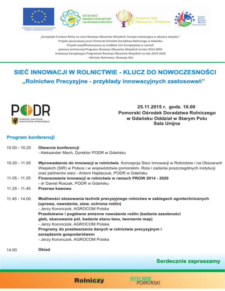 „Europejski Fundusz Rolny na rzecz Rozwoju Obszarów Wiejskich: Europa inwestuj¹ca w obszary wiejskie.” Projekt opracowany przez Pomorski Oœrodek Doradztwa Rolniczego w Gdañsku Projekt wspó³finansowany ze œrodków Unii Europejskiej w ramach pomocy technicznej Programu Rozwoju Obszarów Wiejskich na lata 2014-2020 Instytucja Zarz¹dzaj¹ca Programem Rozwoju Obszarów Wiejskich na lata 2014-2020 - Minister Rolnictwa i Rozwoju Wsi SIEÆ INNOWACJI W ROLNICTWIE - KLUCZ DO NOWOCZESNOŒCI „Rolnictwo Precyzyjne - przyk³ady innowacyjnych zastosowañ” 25.11.2015 r. godz. 10.00 Pomorski Oœrodek Doradztwa Rolniczego w Gdañsku Oddzia³ w Starym Polu Sala Unijna Program konferencji 10.00 - 10.20 Otwarcie konferencji - Aleksander Mach, Dyrektor PODR w Gdañsku 10.20 - 11.05 Wprowadzenie do innowacji w rolnictwie. Koncepcja Sieci Innowacji w Rolnictwie i na Obszarach Wiejskich (SIR) w Polsce i w województwie pomorskim. Rola i zadania poszczególnych instytucji oraz partnerów sieci - Antoni Hajdaczuk, PODR w Gdañsku Finansowanie innowacji w rolnictwie w ramach PROW 2014 - 2020 - dr Daniel Roszak, PODR w Gdañsku Przerwa kawowa 11.05 - 11.25 11.25 - 11.45 11.45 - 14.00 Mo¿liwoœci stosowania technik precyzyjnego rolnictwa w zabiegach agrotechnicznych (uprawa, nawo¿enie, siew, ochrona roœlin) - Jerzy Koronczok, AGROCOM Polska Przedsiewne i pog³ówne zmienne nawo¿enie roœlin (badanie zasobnoœci gleb, skanowanie pól, badanie stanu ³anu, tworzenie map) - Jerzy Koronczok, AGROCOM Polska Programy do przetwarzania danych w rolnictwie precyzyjnym i zarz¹dzanie gospodarstwem - Jerzy Koronczok, AGROCOM Polska 14.00 Obiad Serdecznie zapraszamy