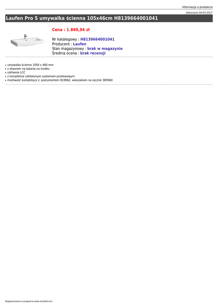 Informacje o produkcie Utworzono 04-03-2017 Laufen Pro S umywalka ścienna 105x46cm H8139664001041 Cena : 1.849,94 zł Nr katalogowy : H8139664001041 Producent : Laufen Stan magazynowy : brak w magazynie Średnia ocena : brak recenzji ● ● ● ● ● umywalka ścienna 1050 x 460 mm z otworem na baterię na środku szkliwnie LCC z kompletnie szkliwionym systemem przelewowym możliwość kompletacji z: postumentem 819962, wieszakiem na ręcznik 385960 Wygenerowano w programie www.oscGold.com