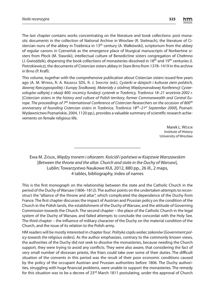 Notki recenzyjne 325 The last chapter contains works concentrating on the literature and book collections: post monastic documents in the collection of National Archive in Wrocław (R. Stelmach), the literature of Cistercian nuns of the abbey in Trzebnica in 13th century (A. Wałkówski), scriptorium from the abbey of regular canons in Czerwińsk as the emergence place of liturgical manuscripts of Norbertine sisters from Płock (M. Stawski), intellectual culture of Benedictine sisters congregation of Chełmno (J. Gwioździk), dispersing the book collections of monasteries dissolved in 18th and 19th centuries (I. Pietrzkiewicz), the documents of Cistercian sisters abbey in Stare Brno from 1378–1419 in the archive in Brno (P. Krafl). This volume, together with the comprehensive publication about Cistercian sisters issued few years ago (A. M. WYRWA, fr. A. KIEŁBASA SDS, fr. J. SWASTEK (ed.), Cysterki w dziejach i kulturze ziem polskich, dawnej Rzeczypospolitej i Europy Środkowej. Materiały z siódmej Międzynarodowej Konferencji Cystersologów odbytej z okazji 800. rocznicy fundacji cysterek w Trzebnicy, Trzebnica 18–21 września 2002 r. [Cistercian sisters in the history and culture of Polish territory, former Commonwealth and Central Europe. The proceedings of 7th International Conference of Cistercian Researchers on the occasion of 800th anniversary of founding Cistercian sisters in Trzebnica, Trzebnica 18th–21st September 2000], Poznań: Wydawnictwo Poznańskie, 2004, 1120 pp.), provides a valuable summary of scientific research achievements on female religious life. Marek L. WÓJCIK Institute of History University of Wrocław Ewa M. ZIÓŁEK, Między tronem i ołtarzem. Kościół i państwo w Księstwie Warszawskim [Between the throne and the altar. Church and state in the Duchy of Warsaw], Lublin: Towarzystwo Naukowe KUL 2012, 880 pp., 26 ill., 2 maps, 4 tables, bibliography, index of names This is the first monograph on the relationship between the state and the Catholic Church in the period of the Duchy of Warsaw (1806–1812). The author points on the undertaken attempts to reconstruct the “alliance of the throne and altar“, which complicated the dependence of the Duchy from France. The first chapter discusses the impact of Austrian and Prussian policy on the condition of the Church in the Polish lands, the establishment of the Duchy of Warsaw, and the attitude of Governing Commission towards the Church. The second chapter – the place of the Catholic Church in the legal system of the Duchy of Warsaw, and failed attempts to conclude the concordat with the Holy See. The third chapter – the influence of military character of the Duchy on the material condition of the Church, and the issue of its relation to the Polish army. HM readers will be mostly interested in chapter four: Polityka rządu wobec zakonów [Government policy towards the religious orders]. As the author emphasizes, contrary to the commonly known views, the authorities of the Duchy did not seek to dissolve the monasteries, because needing the Church support, they were trying to avoid any conflicts. They were also aware, that considering the fact of very small number of diocesan priests, the friars could take over some of their duties. The difficult situation of the convents in this period was the result of their poor economic conditions caused by the policy of the occupant Austrian and Prussian authorities before 1806. The Duchy authorities, struggling with huge financial problems, were unable to support the monasteries. The remedy for this situation was to be a decree of 23rd March 1811 postulating, under the approval of Church 326 Notki recenzyjne authorities, the mergence of small monasteries in larger, economically independent entities. With a special concern were surrounded those congregations, which has been considered as useful for the country, namely those teaching and carrying hospitals. In particular regard, as a symbol of Polish identity, was treated the monastery of Jasna Góra. The book ends with two chapters devoted to the Church reform projects and the relation of the Church to the state and monarch – Frederick Augustus, patriotism of the clergy, and the religiousness of discussed period. Marek DERWICH Institute of History University of Wrocław