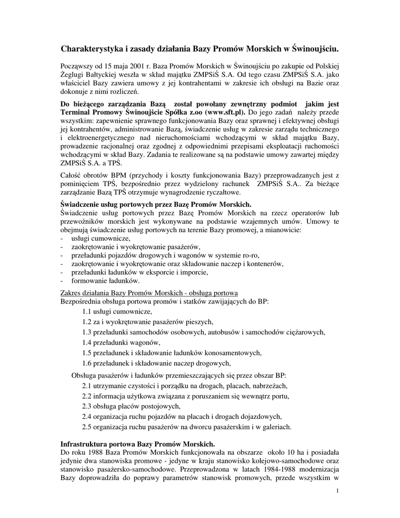 Charakterystyka i zasady działania Bazy Promów Morskich w Świnoujściu. Począwszy od 15 maja 2001 r. Baza Promów Morskich w Świnoujściu po zakupie od Polskiej Żeglugi Bałtyckiej weszła w skład majątku ZMPSiŚ S.A. Od tego czasu ZMPSiŚ S.A. jako właściciel Bazy zawiera umowy z jej kontrahentami w zakresie ich obsługi na Bazie oraz dokonuje z nimi rozliczeń. Do bieżącego zarządzania Bazą został powołany zewnętrzny podmiot jakim jest Terminal Promowy Świnoujście Spółka z.oo (www.sft.pl). Do jego zadań należy przede wszystkim: zapewnienie sprawnego funkcjonowania Bazy oraz sprawnej i efektywnej obsługi jej kontrahentów, administrowanie Bazą, świadczenie usług w zakresie zarządu technicznego i elektroenergetycznego nad nieruchomościami wchodzącymi w skład majątku Bazy, prowadzenie racjonalnej oraz zgodnej z odpowiednimi przepisami eksploatacji ruchomości wchodzącymi w skład Bazy. Zadania te realizowane są na podstawie umowy zawartej między ZMPSiŚ S.A. a TPŚ. Całość obrotów BPM (przychody i koszty funkcjonowania Bazy) przeprowadzanych jest z pominięciem TPŚ, bezpośrednio przez wydzielony rachunek ZMPSiŚ S.A.. Za bieżące zarządzanie Bazą TPŚ otrzymuje wynagrodzenie ryczałtowe. Świadczenie usług portowych przez Bazę Promów Morskich. Świadczenie usług portowych przez Bazę Promów Morskich na rzecz operatorów lub przewoźników morskich jest wykonywane na podstawie wzajemnych umów. Umowy te obejmują świadczenie usług portowych na terenie Bazy promowej, a mianowicie: - usługi cumownicze, - zaokrętowanie i wyokrętowanie pasażerów, - przeładunki pojazdów drogowych i wagonów w systemie ro-ro, - zaokrętowanie i wyokrętowanie oraz składowanie naczep i kontenerów, - przeładunki ładunków w eksporcie i imporcie, - formowanie ładunków. Zakres działania Bazy Promów Morskich - obsługa portowa Bezpośrednia obsługa portowa promów i statków zawijających do BP: 1.1 usługi cumownicze, 1.2 za i wyokrętowanie pasażerów pieszych, 1.3 przeładunki samochodów osobowych, autobusów i samochodów ciężarowych, 1.4 przeładunki wagonów, 1.5 przeładunek i składowanie ładunków konosamentowych, 1.6 przeładunek i składowanie naczep drogowych, Obsługa pasażerów i ładunków przemieszczających się przez obszar BP: 2.1 utrzymanie czystości i porządku na drogach, placach, nabrzeżach, 2.2 informacja użytkowa związana z poruszaniem się wewnątrz portu, 2.3 obsługa placów postojowych, 2.4 organizacja ruchu pojazdów na placach i drogach dojazdowych, 2.5 organizacja ruchu pasażerów na dworcu pasażerskim i w galeriach. Infrastruktura portowa Bazy Promów Morskich. Do roku 1988 Baza Promów Morskich funkcjonowała na obszarze około 10 ha i posiadała jedynie dwa stanowiska promowe - jedyne w kraju stanowisko kolejowo-samochodowe oraz stanowisko pasażersko-samochodowe. Przeprowadzona w latach 1984-1988 modernizacja Bazy doprowadziła do poprawy parametrów stanowisk promowych, przede wszystkim w 1 zakresie długości linii cumowniczej oraz niewielkiej poprawy stanu technicznego zaplecza Bazy. Istniejące od 1988 zdolności obsługowe Bazy były jednak w dalszym ciągu niewystarczające dla sprawnej i efektywnej obsługi przewozów komunikacji promowej. Pilną potrzebą było podniesienie standardu obsługi ruchu pasażerskiego. Dostosowanie zdolności obsługowych terminalu promowego i przejścia granicznego dla zwiększających się przewozów w morskiej komunikacji promowej oraz uzyskanie wysokich standardów tej obsługi było możliwe wyłącznie na drodze zasadniczej przebudowy funkcjonującej Bazy Promów Morskich. Roboty rozpoczęto w lipcu 1988 roku. Program inwestycyjny rozbudowy Bazy Promów Morskich w Świnoujściu obejmował docelowo realizację następujących głównych zadań: 1) budowę trzech nowych stanowisk promowych, w tym jedno stanowisko promowe Nr 2 dla obsługi promów kolejowo-samochodowych oraz pasażersko- samochodowych; dwa stanowiska promowe (Nr 5 i Nr 6) dla obsługi promów pasażersko-samochodowych, 2) modernizację istniejących stanowisk promowych (Nr 3 i Nr 4), z których jedno (Nr 3) przewidziane było dla obsługi promów kolejowo-samochodowych, drugie dla obsługi promów pasażersko-samochodowych, 3) budowę dworca morskiego i zespołu galerii pasażerskich wraz z ruchomymi pomostami pasażerskimi "galeria-prom" dla obsługi ruchu pasażerskiego, 4) przeniesienie odpraw graniczno-celnych samochodów wraz z kompleksem obiektów kubaturowych dla służb graniczno-celnych, ochrony sanitarnej, odpraw armatorskich i stanowiskiem szczegółowej kontroli samochodów, przedportowe i wewnątrz portowe place komunikacji krajowej i międzynarodowej, wyczekiwania samochodów na odprawę, układ dróg wewnątrz portowych oraz zewnętrznych dojazdowych, 5) budowę kompleksu obiektów infrastruktury technicznej, pozwalającej na zaopatrzenie terminalu promowego w energię elektryczną, ciepło, wodę, odbiór i oczyszczanie ścieków sanitarnych, zaolejonych oraz wód opadowych. Przedstawiony powyżej w ogólnym zarysie program rozbudowy Bazy Promów Morskich został zrealizowany na obszarze ok. 30 ha. W efekcie zabudowa linii brzegowej otrzymała nowy kształt poprzez wybudowanie stanowisk promowych Nr 5 i Nr 6 oraz wydłużenie stanowiska promowego Nr 4, a także całkowite przebudowanie stanowiska promowego Nr 2. Nowe stanowiska wchodzą w akwen przybrzeżny Świny, zwiększając tym samym powierzchnię lądową terminalu. W dalszym ciągu pozostaje rezerwa terenu pod budowę uniwersalnego stanowiska promowego Nr 1 przewidzianego głównie do obsługi równoczesnej dwóch promów kolejowo-pasażersko-samochodowych. ZMPSiŚ S.A. czyni obecnie starania o pozyskanie środków z Unii Europejskiej na współfinansowanie tej inwestycji. W wyniku realizacji galerii i ruchomych pomostów pasażerskich "galeria-prom", ruch pieszych został całkowicie oddzielony od ruchu samochodów i skład