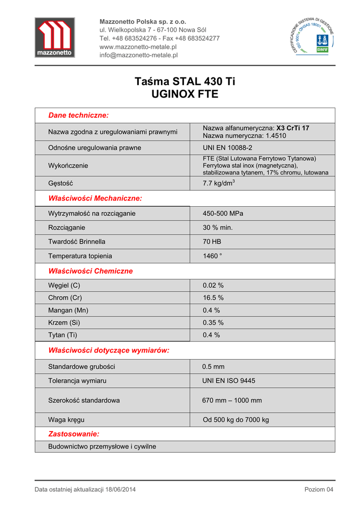 Mazzonetto Polska sp. z o.o. ul. Wielkopolska 7 - 67-100 Nowa Sól Tel. +48 683524276 - Fax +48 683524277 www.mazzonetto-metale.pl [email protected] Taśma STAL 430 Ti UGINOX FTE Dane techniczne: Nazwa zgodna z uregulowaniami prawnymi Nazwa alfanumeryczna: X3 CrTi 17 Nazwa numeryczna: 1.4510 Odnośne uregulowania prawne UNI EN 10088-2 Wykończenie FTE (Stal Lutowana Ferrytowo Tytanowa) Ferrytowa stal inox (magnetyczna), stabilizowana tytanem, 17% chromu, lutowana Gęstość 7.7 kg/dm3 Właściwości Mechaniczne: Wytrzymałość na rozciąganie 450-500 MPa Rozciąganie 30 % min. Twardość Brinnella 70 HB Temperatura topienia 1460 ° Właściwości Chemiczne Węgiel (C) 0.02 % Chrom (Cr) 16.5 % Mangan (Mn) 0.4 % Krzem (Si) 0.35 % Tytan (Ti) 0.4 % Właściwości dotyczące wymiarów: Standardowe grubości 0.5 mm Tolerancja wymiaru UNI EN ISO 9445 Szerokość standardowa 670 mm – 1000 mm Waga kręgu Od 500 kg do 7000 kg Zastosowanie: Budownictwo przemysłowe i cywilne Data ostatniej aktualizacji 18/06/2014 Poziom 04
