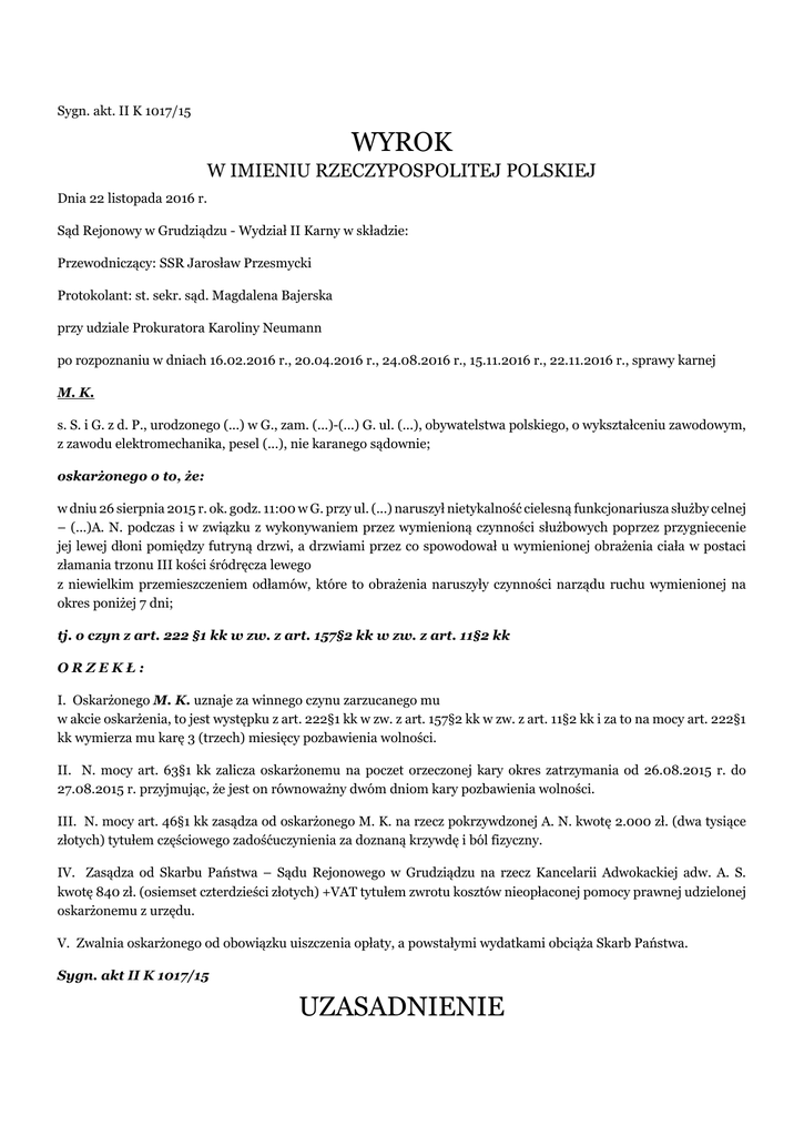 Sygn. akt. II K 1017/15 WYROK W IMIENIU RZECZYPOSPOLITEJ POLSKIEJ Dnia 22 listopada 2016 r. Sąd Rejonowy w Grudziądzu - Wydział II Karny w składzie: Przewodniczący: SSR Jarosław Przesmycki Protokolant: st. sekr. sąd. Magdalena Bajerska przy udziale Prokuratora Karoliny Neumann po rozpoznaniu w dniach 16.02.2016 r., 20.04.2016 r., 24.08.2016 r., 15.11.2016 r., 22.11.2016 r., sprawy karnej M. K. s. S. i G. z d. P., urodzonego (...) w G., zam. (...)-(...) G. ul. (...), obywatelstwa polskiego, o wykształceniu zawodowym, z zawodu elektromechanika, pesel (...), nie karanego sądownie; oskarżonego o to, że: w dniu 26 sierpnia 2015 r. ok. godz. 11:00 w G. przy ul. (...) naruszył nietykalność cielesną funkcjonariusza służby celnej – (...)A. N. podczas i w związku z wykonywaniem przez wymienioną czynności służbowych poprzez przygniecenie jej lewej dłoni pomiędzy futryną drzwi, a drzwiami przez co spowodował u wymienionej obrażenia ciała w postaci złamania trzonu III kości śródręcza lewego z niewielkim przemieszczeniem odłamów, które to obrażenia naruszyły czynności narządu ruchu wymienionej na okres poniżej 7 dni; tj. o czyn z art. 222 §1 kk w zw. z art. 157§2 kk w zw. z art. 11§2 kk ORZEKŁ: I. Oskarżonego M. K. uznaje za winnego czynu zarzucanego mu w akcie oskarżenia, to jest występku z art. 222§1 kk w zw. z art. 157§2 kk w zw. z art. 11§2 kk i za to na mocy art. 222§1 kk wymierza mu karę 3 (trzech) miesięcy pozbawienia wolności. II. N. mocy art. 63§1 kk zalicza oskarżonemu na poczet orzeczonej kary okres zatrzymania od 26.08.2015 r. do 27.08.2015 r. przyjmując, że jest on równoważny dwóm dniom kary pozbawienia wolności. III. N. mocy art. 46§1 kk zasądza od oskarżonego M. K. na rzecz pokrzywdzonej A. N. kwotę 2.000 zł. (dwa tysiące złotych) tytułem częściowego zadośćuczynienia za doznaną krzywdę i ból fizyczny. IV. Zasądza od Skarbu Państwa – Sądu Rejonowego w Grudziądzu na rzecz Kancelarii Adwokackiej adw. A. S. kwotę 840 zł. (osiemset czterdzieści złotych) +VAT tytułem zwrotu kosztów nieopłaconej pomocy prawnej udzielonej oskarżonemu z urzędu. V. Zwalnia oskarżonego od obowiązku uiszczenia opłaty, a powstałymi wydatkami obciąża Skarb Państwa. Sygn. akt II K 1017/15 UZASADNIENIE Oskarżony M. K. nie był karany sądownie. Co prawda z karty karnej wynika, że oskarżony był karany z art. 291 § 1 kk, jednakże jak ustalił Sąd, skazanie uległo zatarciu na podstawie art. 106 kk. W dniu 26 sierpnia 2016 r. oskarżony M. K. przebywał w mieszkaniu przy ulicy (...) G.. W tym dniu około godziny 11, funkcjonariusze referatu dozoru (...)w T. (...) – (...) A. N. i M. M., pełniąc służbę nieoznakowanym pojazdem służbowym marki F. (...) o nr rej. (...), przejeżdżając przy ulicy (...) w G., z odległości około 50 metrów, zauważyli wychodzącą z posesji przy wymienionym adresie W. D., która trzymała w ręku duży czarny worek, w środku którego odznaczały się kształty paczek papierosów. M. M. rozpoznał W. D., gdyż miał już z nią do czynienia, ponieważ zajmowała się ona nielegalnym handlem papierosami bez wymaganych znaków akcyzy. N. wskazanej posesji znajdował się budynek składający się z parteru i I. piętra. W. D. poznała z daleka funkcjonariusza M. M. i pojazd służby celnej i zaczęła się cofać z powrotem na posesję z której wychodziła i wbiegła do budynku. Wówczas M. M. podjechał bliżej posesji, A. N. wybiegła z samochodu i pobiegła za W. D.. Po wbiegnięciu do budynku A. N. zauważyła jak uciekająca przed nią W. D. wbiega z czarnym workiem po schodach na I. piętro. Funkcjonariusza U. C.krzyknęła za nią „służba celna”. Kobieta z workiem cały czas biegła dalej a A. N. za nią. N. I. piętrze W. D. przez otwarte drzwi mieszkania oskarżonego wrzuciła czarny worek do środka, po czym zatrzymała się przy tych drzwiach. Drzwi do mieszkania były jeszcze uchylone. A. N. prawą częścią swego ciała, tj. barkiem i nogą próbowała uniemożliwić oskarżonemu znajdującemu się w środku mieszkania zamknięcie drzwi. Funkcjonariuszka ponownie użyła zwrotu „służba celna”. W celu uniemożliwienia zamknięcia drzwi dodatkowo włożyła lewą dłoń pomiędzy futrynę drzwi a drzwi. Otwór drzwi się zmniejszał. Oskarżony cały czas starał się zamknąć drzwi, napierał mocno na drzwi, sprawiając funkcjonariuszce ból. A. N. wykrzyczała, że „będzie to czynna napaść na funkcjonariusza”. Oskarżony nadal napierał na drzwi, nie chcą wpuścić pokrzywdzonej do środka mieszkania, która odczuwała coraz większy ból w ręce. Gdy oskarżony zwolnił nacisk na drzwi – A. N. udało się wyciągnąć dłoń, a drzwi od mieszkania zostały przez niego zamknięte. Wtedy na I. piętro wbiegł M. M., który zauważył, że jego koleżanka trzyma się za swoją rękę a obok stała W. N. miejsce interwencji funkcjonariuszy urzędu celnego wezwano policję, funkcjonariuszy z sekcji dozoru urzędu celnego w B. oraz pogotowie ratunkowe, celem udzielenia pierwszej pomocy poszkodowanej A. N.. Pomimo nawoływania oskarżony, który przytrzasnął drzwi A. N., dopiero po dłuższej chwili otworzył drzwi. Funkcjonariusze dozoru przy asyście policji zatrzymali w mieszkaniu oskarżonego 1610 paczek papierosów różnych marek bez akcyzy oraz 16 litrów spirytusu bez akcyzy. Pokrzywdzona A. N. została zabrana karetką pogotowia do szpitala w G.. W następstwie przytrzaśnięcia, przykleszczenia ręki drzwiami pokrzywdzona A. N. doznała obrażenia w postaci złamania trzonu III kości śródręcza lewego z niewielkim przemieszczeniem odłamów, które to obrażenia naruszyły czynności narządu ruchu wymienionej na okres powyżej 7 dni, tj. spowodował uszczerbek na zdrowiu w rozumieniu art. 157 § 1 kk Dowody: częściowe wyjaśnienia oskarżonego M. K. k. 7; zeznania: A. N. k. 58-58v; M. M. k. 58v-59, 6v-7; K. K. (1) k. 62v, 12v zb