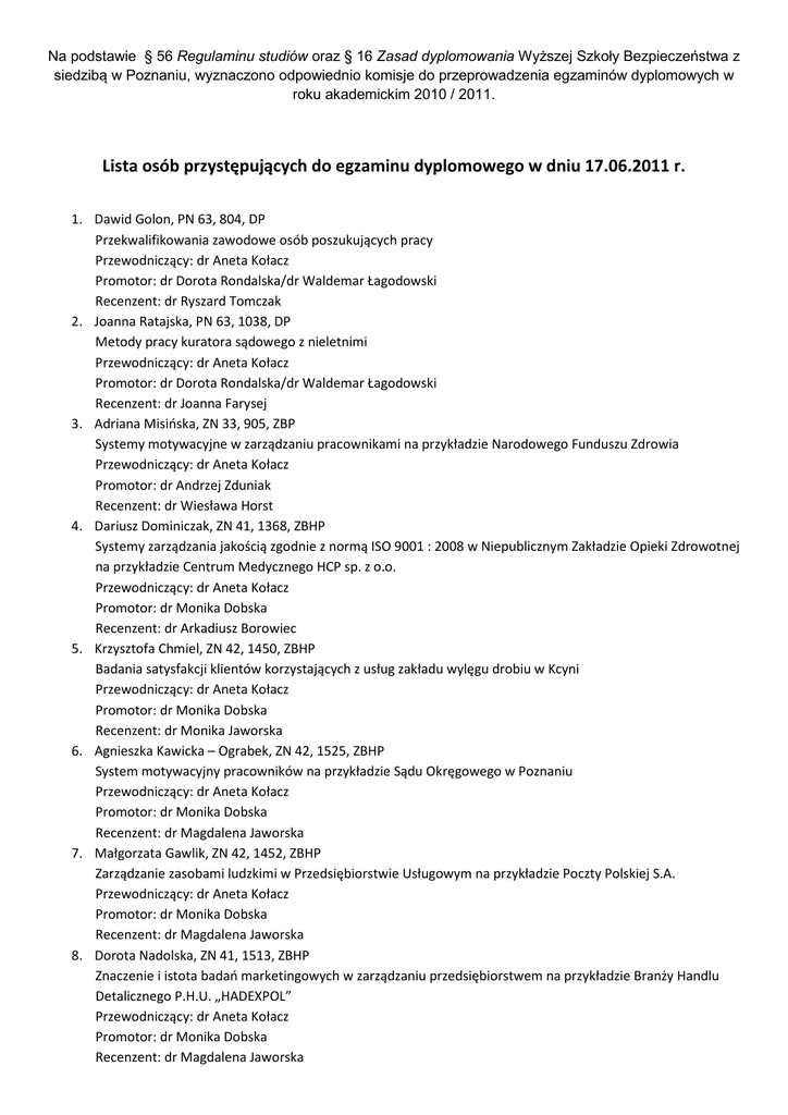 Na podstawie § 56 Regulaminu studiów oraz § 16 Zasad dyplomowania Wyższej Szkoły Bezpieczeństwa z siedzibą w Poznaniu, wyznaczono odpowiednio komisje do przeprowadzenia egzaminów dyplomowych w roku akademickim 2010 / 2011. Lista osób przystępujących do egzaminu dyplomowego w dniu 17.06.2011 r. 1. Dawid Golon, PN 63, 804, DP Przekwalifikowania zawodowe osób poszukujących pracy Przewodniczący: dr Aneta Kołacz Promotor: dr Dorota Rondalska/dr Waldemar Łagodowski Recenzent: dr Ryszard Tomczak 2. Joanna Ratajska, PN 63, 1038, DP Metody pracy kuratora sądowego z nieletnimi Przewodniczący: dr Aneta Kołacz Promotor: dr Dorota Rondalska/dr Waldemar Łagodowski Recenzent: dr Joanna Farysej 3. Adriana Misińska, ZN 33, 905, ZBP Systemy motywacyjne w zarządzaniu pracownikami na przykładzie Narodowego Funduszu Zdrowia Przewodniczący: dr Aneta Kołacz Promotor: dr Andrzej Zduniak Recenzent: dr Wiesława Horst 4. Dariusz Dominiczak, ZN 41, 1368, ZBHP Systemy zarządzania jakością zgodnie z normą ISO 9001 : 2008 w Niepublicznym Zakładzie Opieki Zdrowotnej na przykładzie Centrum Medycznego HCP sp. z o.o. Przewodniczący: dr Aneta Kołacz Promotor: dr Monika Dobska Recenzent: dr Arkadiusz Borowiec 5. Krzysztofa Chmiel, ZN 42, 1450, ZBHP Badania satysfakcji klientów korzystających z usług zakładu wylęgu drobiu w Kcyni Przewodniczący: dr Aneta Kołacz Promotor: dr Monika Dobska Recenzent: dr Monika Jaworska 6. Agnieszka Kawicka – Ograbek, ZN 42, 1525, ZBHP System motywacyjny pracowników na przykładzie Sądu Okręgowego w Poznaniu Przewodniczący: dr Aneta Kołacz Promotor: dr Monika Dobska Recenzent: dr Magdalena Jaworska 7. Małgorzata Gawlik, ZN 42, 1452, ZBHP Zarządzanie zasobami ludzkimi w Przedsiębiorstwie Usługowym na przykładzie Poczty Polskiej S.A. Przewodniczący: dr Aneta Kołacz Promotor: dr Monika Dobska Recenzent: dr Magdalena Jaworska 8. Dorota Nadolska, ZN 41, 1513, ZBHP Znaczenie i istota badań marketingowych w zarządzaniu przedsiębiorstwem na przykładzie Branży Handlu Detalicznego P.H.U. „HADEXPOL” Przewodniczący: dr Aneta Kołacz Promotor: dr Monika Dobska Recenzent: dr Magdalena Jaworska 9. Piotr Łukaszewski, ZN 41, 1372, ZBHP Znaczenie zarządzania zasobami ludzkimi na przykładzie nadodrzańskiego oddziału Straży Granicznej Przewodniczący: dr Aneta Kołacz Promotor: dr Monika Dobska Recenzent: dr Wiesław Otwinowski 10. Adriana Graś, ZN 41, 1372, ZBHP Ocena ryzyka jako element systemu zarządzania BHP na przykładzie branży drogowej Przewodniczący: dr Aneta Kołacz Promotor: Prof. dr hab. inż. Piotr Grudowski Recenzent: dr Monika Dobska 11. Łukasz Broniszewski, ZN 42, 1447, ZBHP Zastosowanie przepisów prawnych dotyczących BHP w procesie projektowania hali produkcyjnej przedsiębiorstwa przemysłowego Przewodniczący: dr Aneta Kołacz Promotor: dr Arkadiusz Borowiec Recenzent: dr Monika Dobska 12. Alina Lemańska, ZN 41, 1396, ZBHP Kreowanie wizerunku firmy w zarządzaniu serwisem samochodowym TAURUS Przewodniczący: dr Aneta Kołacz Promotor: dr Monika Dobska Recenzent: dr Andrzej Zduniak 13. Iwona Geresdorf, ZN 41, 1371, ZBHP Zarządzanie marketingowe w zakładach opieki zdrowotnej na przykładzie SPSK nr 1 w Poznaniu Przewodniczący: dr Aneta Kołacz Promotor: dr Monika Dobska Recenzent: dr Andrzej Zduniak 14. Piotr Staśkowiak, ZN 41, 1385, ZBHP Zarządzanie ryzykiem zawodowym na przykładzie wybranego stanowiska obróbki mechanicznej Przewodniczący: dr Aneta Kołacz Promotor: Prof. dr hab. inż. Piotr Grudowski Recenzent: dr Andrzej Zduniak 15. Katarzyna Turkiewicz, ZN 42, 1653, ZBHP Zarządzanie zasobami ludzkimi w stowarzyszeniu ochotnicza Straż Pożarna w Swarzędzu Przewodniczący: dr Aneta Kołacz Promotor: dr Monika Dobska Recenzent: dr Aleksandra Czechowska 16. Edyta Skarupska, ZN 41, 1382, ZBHP Jakość obsługi klienta w zarządzaniu na przykładzie firmy PZU Życie SA Przewodniczący: dr Aneta Kołacz Promotor: dr Monika Dobska Recenzent: dr Andrzej Zduniak