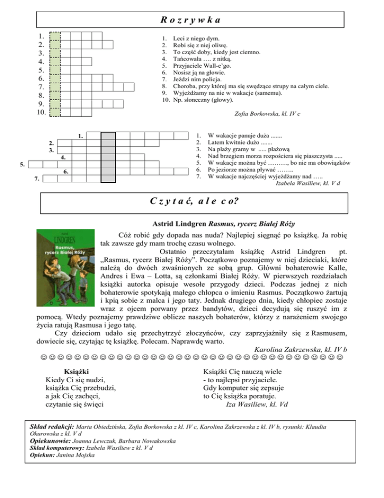 Rozrywka 1. 2. 3. 4. 5. 6. 7. 8. 9. 10. 1. 2. 3. 4. 5. 6. 7. 8. 9. 10. Leci z niego dym. Robi się z niej oliwę. To część doby, kiedy jest ciemno. Tańcowała …. z nitką. Przyjaciele Wall-e’go. Nosisz ją na głowie. Jeździ nim policja. Choroba, przy której ma się swędzące strupy na całym ciele. Wyjeżdżamy na nie w wakacje (samemu). Np. słoneczny (głowy). Zofia Borkowska, kl. IV c 1. 2. 3. 4. 5. 6. 7. 1. 2. 3. 4. 5. 6. 7. W wakacje panuje duża ....... Latem kwitnie dużo ....... Na plaży gramy w ..... plażową Nad brzegiem morza rozpościera się piaszczysta ..... W wakacje można być ………, bo nie ma obowiązków Po jeziorze można pływać …….. W wakacje najczęściej wyjeżdżamy nad ….. Izabela Wasiliew, kl. V d C z y t a ć, a l e c o? Astrid Lindgren Rasmus, rycerz Białej Róży Cóż robić gdy dopada nas nuda? Najlepiej sięgnąć po książkę. Ja robię tak zawsze gdy mam trochę czasu wolnego. Ostatnio przeczytałam książkę Astrid Lindgren pt. „Rasmus, rycerz Białej Róży”. Początkowo poznajemy w niej dzieciaki, które należą do dwóch zwaśnionych ze sobą grup. Główni bohaterowie Kalle, Andres i Ewa – Lotta, są członkami Białej Róży. W pierwszych rozdziałach książki autorka opisuje wesołe przygody dzieci. Podczas jednej z nich bohaterowie spotykają małego chłopca o imieniu Rasmus. Początkowo żartują i kpią sobie z malca i jego taty. Jednak drugiego dnia, kiedy chłopiec zostaje wraz z ojcem porwany przez bandytów, dzieci decydują się ruszyć im z pomocą. Wtedy poznajemy prawdziwe oblicze naszych bohaterów, którzy z narażeniem swojego życia ratują Rasmusa i jego tatę. Czy dzieciom udało się przechytrzyć złoczyńców, czy zaprzyjaźniły się z Rasmusem, dowiecie się, czytając tę książkę. Polecam. Naprawdę warto. Karolina Zakrzewska, kl. IV b Książki Kiedy Ci się nudzi, książka Cię przebudzi, a jak Cię zachęci, czytanie się święci Książki Cię nauczą wiele - to najlepsi przyjaciele. Gdy komputer się zepsuje to Cię książka poratuje. Iza Wasiliew, kl. Vd Skład redakcji: Marta Obiedzińska, Zofia Borkowska z kl. IV c, Karolina Zakrzewska z kl. IV b, rysunki: Klaudia Okurowska z kl. V d Opiekunowie: Joanna Lewczuk, Barbara Nowakowska Skład komputerowy: Izabela Wasiliew z kl. V d Opiekun: Janina Mojska