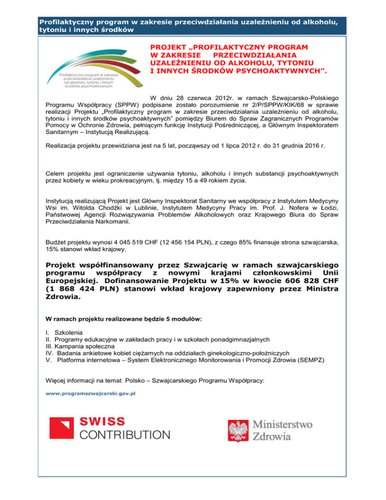 Profilaktyczny program w zakresie przeciwdziałania uzależnieniu od alkoholu, tytoniu i innych środków PROJEKT „PROFILAKTYCZNY PROGRAM W ZAKRESIE PRZECIWDZIAŁANIA UZALEŻNIENIU OD ALKOHOLU, TYTONIU I INNYCH ŚRODKÓW PSYCHOAKTYWNYCH”. W dniu 28 czerwca 2012r. w ramach Szwajcarsko-Polskiego Programu Współpracy (SPPW) podpisane zostało porozumienie nr 2/P/SPPW/KIK/68 w sprawie realizacji Projektu „Profilaktyczny program w zakresie przeciwdziałania uzależnieniu od alkoholu, tytoniu i innych środków psychoaktywnych” pomiędzy Biurem do Spraw Zagranicznych Programów Pomocy w Ochronie Zdrowia, pełniącym funkcję Instytucji Pośredniczącej, a Głównym Inspektoratem Sanitarnym – Instytucją Realizującą. Realizacja projektu przewidziana jest na 5 lat, począwszy od 1 lipca 2012 r. do 31 grudnia 2016 r. Celem projektu jest ograniczenie używania tytoniu, alkoholu i innych substancji psychoaktywnych przez kobiety w wieku prokreacyjnym, tj. między 15 a 49 rokiem życia. Instytucją realizującą Projekt jest Główny Inspektorat Sanitarny we współpracy z Instytutem Medycyny Wsi im. Witolda Chodźki w Lublinie, Instytutem Medycyny Pracy im. Prof. J. Nofera w Łodzi, Państwowej Agencji Rozwiązywania Problemów Alkoholowych oraz Krajowego Biura do Spraw Przeciwdziałania Narkomanii. Budżet projektu wynosi 4 045 519 CHF (12 456 154 PLN), z czego 85% finansuje strona szwajcarska, 15% stanowi wkład krajowy. Projekt współfinansowany przez Szwajcarię w ramach szwajcarskiego programu współpracy z nowymi krajami członkowskimi Unii Europejskiej. Dofinansowanie Projektu w 15% w kwocie 606 828 CHF (1 868 424 PLN) stanowi wkład krajowy zapewniony przez Ministra Zdrowia. W ramach projektu realizowane będzie 5 modułów: I. Szkolenia II. Programy edukacyjne w zakładach pracy i w szkołach ponadgimnazjalnych III. Kampania społeczna IV. Badania ankietowe kobiet ciężarnych na oddziałach ginekologiczno-położniczych V. Platforma internetowa – System Elektronicznego Monitorowania i Promocji Zdrowia (SEMPZ) Więcej informacji na temat Polsko – Szwajcarskiego Programu Współpracy: www.programszwajcarski.gov.pl