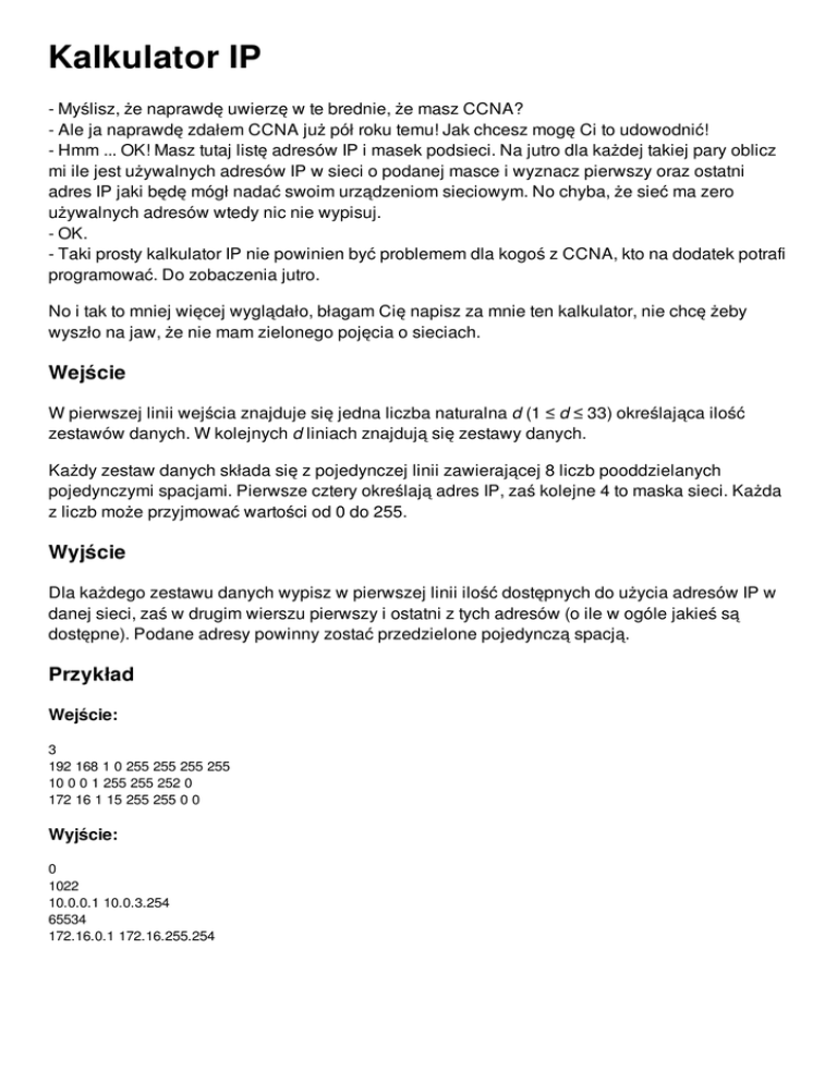 Kalkulator IP - Myślisz, że naprawdę uwierzę w te brednie, że masz CCNA? - Ale ja naprawdę zdałem CCNA już pół roku temu! Jak chcesz mogę Ci to udowodnić! - Hmm ... OK! Masz tutaj listę adresów IP i masek podsieci. Na jutro dla każdej takiej pary oblicz mi ile jest używalnych adresów IP w sieci o podanej masce i wyznacz pierwszy oraz ostatni adres IP jaki będę mógł nadać swoim urządzeniom sieciowym. No chyba, że sieć ma zero używalnych adresów wtedy nic nie wypisuj. - OK. - Taki prosty kalkulator IP nie powinien być problemem dla kogoś z CCNA, kto na dodatek potrafi programować. Do zobaczenia jutro. No i tak to mniej więcej wyglądało, błagam Cię napisz za mnie ten kalkulator, nie chcę żeby wyszło na jaw, że nie mam zielonego pojęcia o sieciach. Wejście W pierwszej linii wejścia znajduje się jedna liczba naturalna d (1 ≤ d ≤ 33) określająca ilość zestawów danych. W kolejnych d liniach znajdują się zestawy danych. Każdy zestaw danych składa się z pojedynczej linii zawierającej 8 liczb pooddzielanych pojedynczymi spacjami. Pierwsze cztery określają adres IP, zaś kolejne 4 to maska sieci. Każda z liczb może przyjmować wartości od 0 do 255. Wyjście Dla każdego zestawu danych wypisz w pierwszej linii ilość dostępnych do użycia adresów IP w danej sieci, zaś w drugim wierszu pierwszy i ostatni z tych adresów (o ile w ogóle jakieś są dostępne). Podane adresy powinny zostać przedzielone pojedynczą spacją. Przykład Wejście: 3 192 168 1 0 255 255 255 255 10 0 0 1 255 255 252 0 172 16 1 15 255 255 0 0 Wyjście: 0 1022 10.0.0.1 10.0.3.254 65534 172.16.0.1 172.16.255.254