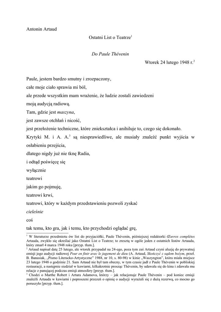Antonin Artaud Ostatni List o Teatrze1 Do Paule Thévenin Wtorek 24 lutego 1948 r.2 Paule, jestem bardzo smutny i zrozpaczony, całe moje ciało sprawia mi ból, ale przede wszystkim mam wrażenie, że ludzie zostali zawiedzeni moją audycją radiową. Tam, gdzie jest maszyna, jest zawsze otchłań i nicość, jest przełożenie techniczne, które zniekształca i anihiluje to, czego się dokonało. Krytyki M. i A. A.3 są niesprawiedliwe, ale musiały znaleźć punkt wyjścia w osłabieniu przejścia, dlatego nigdy już nie tknę Radia, i odtąd poświęcę się wyłącznie teatrowi jakim go pojmuję, teatrowi krwi, teatrowi, który w każdym przedstawieniu pozwoli zyskać cieleśnie coś tak temu, kto gra, jak i temu, kto przychodzi oglądać grę, 1 W literaturze przedmiotu ów list do przyjaciółki, Paule Thévenin, późniejszej redaktorki Œuvres complètes Artauda, zwykło się określać jako Ostatni List o Teatrze; to zresztą w ogóle jeden z ostatnich listów Artauda, który zmarł 4 marca 1948 roku [przyp. tłum.]. 2 Artaud napisał datę 25 lutego, ale wtorek przypadał na 24-ego, poza tym zaś Artaud czyni aluzję do prywatnej emisji jego audycji radiowej Pour en finir avec le jugement de dieu (A. Artaud, Skończyć z sądem bożym, przeł. B. Banasiak, „Pismo Literacko-Artystyczne” 1988, nr 10, s. 80-98) w kinie „Waszyngton”, która miała miejsce 23 lutego 1948 o godzinie 21. Sam Artaud nie był tam obecny, w tym czasie jadł z Paule Thévenin w pobliskiej restauracji, a następnie siedział w kawiarni, kilkakrotnie prosząc Thévenin, by udawała się do kina i zdawała mu relacje z panującej podczas emisji atmosfery [przyp. tłum.]. 3 Chodzi o Marthe Robert i Artura Adamova, którzy – jak relacjonuje Paule Thévenin – pod koniec emisji znaleźli Artauda w kawiarni i poproszeni przezeń o opinię o audycji wyrażali się z dużą rezerwą, co mocno go poruszyło [przyp. tłum.]. a zresztą nie gra się, lecz działa. Teatr to w rzeczywistości geneza kreacji. To się dokona. Tego popołudnia miałem widzenie – widziałem tych, którzy za mną idą i którzy nie mają jeszcze ciała, ponieważ świnie, jak te z restauracji wczoraj wieczorem, jedzą zbyt dużo. Są tacy, co jedzą zbyt dużo, i tacy, którzy, jak ja, nie mogą już jeść bez plucia. Dla ciebie. Antonin Artaud Przełożył Bogdan Banasiak