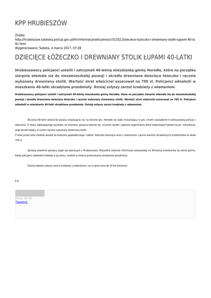 KPP HRUBIESZÓW Źródło: http://hrubieszow.lubelska.policja.gov.pl/lhr/informacje/aktualnosci/31332,Dzieciece-lozeczko-i-drewniany-stolik-lupami-40-la tki.html Wygenerowano: Sobota, 4 marca 2017, 07:28 DZIECIĘCE ŁÓŻECZKO I DREWNIANY STOLIK ŁUPAMI 40-LATKI Hrubieszowscy policjanci ustalili i zatrzymali 40-letnią mieszkankę gminy Horodło, która na początku sierpnia włamała się do niezamieszkałej posesji i skradła drewniane dziecięce łóżeczko i ręcznie wykonany drewniany stolik. Wartość strat właściciel oszacował na 700 zł. Policjanci odnaleźli w mieszkaniu 40-latki skradzione przedmioty. Dzisiaj usłyszy zarzut kradzieży z włamaniem. Hrubieszowscy policjanci ustalili i zatrzymali 40-letnią mieszkankę gminy Horodło, która na początku sierpnia włamała się do niezamieszkałej posesji i skradła drewniane dziecięce łóżeczko i ręcznie wykonany drewniany stolik. Wartość strat właściciel oszacował na 700 zł. Policjanci odnaleźli w mieszkaniu 40-latki skradzione przedmioty. Dzisiaj usłyszy zarzut kradzieży z włamaniem. Wczoraj 60-letni właściciel posesji znajdującej się na terenie gm. Horodło na stałe mieszkający w gm. Chełm zawiadomił hrubieszowską policję o włamaniu. Z relacji zgłaszającego wynikało, że nieznany sprawca włamał się na teren działki i poprzez wypchnięcie drzwi wejściowych dostał się do mieszkania, skąd skradł stojący w kuchni ręcznie wykonany drewniany stolik. Z kolei przed okno złodziej wszedł do budynku gospodarczego i zabrał łóżeczko dziecięce wraz z materacem. Łączna wartość skradzionych przedmiotów to około 700 zł. Sprawą ustalenia sprawcy zajęli się operacyjni z Hrubieszowa. Wszystkie zebrane informacje wskazywały na 40-letnią mieszkankę tej samej gminy. Kiedy policjanci odwiedzili kobietę w jej domu, znaleźli w trakcie przeszukania skradzione przedmioty. Dzisiaj kobieta usłyszy zarzut kradzieży z włamaniem, za co grozi kara do 10 lat wiezienia. E.K. Ocena: 0/5 (0) Tweetnij