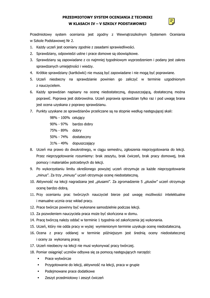PRZEDMIOTOWY SYSTEM OCENIANIA Z TECHNIKI W KLASACH IV – V SZKOŁY PODSTAWOWEJ Przedmiotowy system oceniania jest zgodny z Wewnątrzszkolnym Systemem Oceniania w Szkole Podstawowej Nr 2. 1. Każdy uczeń jest oceniany zgodnie z zasadami sprawiedliwości. 2. Sprawdziany, odpowiedzi ustne i prace domowe są obowiązkowe. 3. Sprawdziany są zapowiadane z co najmniej tygodniowym wyprzedzeniem i podany jest zakres sprawdzanych umiejętności i wiedzy. 4. Krótkie sprawdziany (kartkówki) nie muszą być zapowiadane i nie mogą być poprawiane. 5. Uczeń nieobecny na sprawdzianie powinien go zaliczyć w terminie uzgodnionym z nauczycielem. 6. Każdy sprawdzian napisany na ocenę niedostateczną, dopuszczającą, dostateczną można poprawić. Poprawa jest dobrowolna. Uczeń poprawia sprawdzian tylko raz i pod uwagę brana jest ocena uzyskana z poprawy sprawdzianu. 7. Punkty uzyskane ze sprawdzianów przeliczane są na stopnie według następującej skali: 98% - 100% celujący 90% - 97% bardzo dobry 75% - 89% dobry 50% - 74% dostateczny 31% - 49% dopuszczający 8. Uczeń ma prawo do dwukrotnego, w ciągu semestru, zgłoszenia nieprzygotowania do lekcji. Przez nieprzygotowanie rozumiemy: brak zeszytu, brak ćwiczeń, brak pracy domowej, brak pomocy i materiałów potrzebnych do lekcji. 9. Po wykorzystaniu limitu określonego powyżej uczeń otrzymuje za każde nieprzygotowanie „minus”. Za trzy „minusy” uczeń otrzymuje ocenę niedostateczną. 10. Aktywność na lekcji nagradzana jest „plusami”. Za zgromadzenie 5 „plusów” uczeń otrzymuje ocenę bardzo dobrą. 11. Przy ocenianiu prac twórczych nauczyciel bierze pod uwagę możliwości intelektualne i manualne ucznia oraz wkład pracy. 12. Prace twórcze powinny być wykonane samodzielnie podczas lekcji. 13. Za pozwoleniem nauczyciela praca może być skończona w domu. 14. Pracę twórczą należy oddać w terminie 1 tygodnia od zakończenia jej wykonania. 15. Uczeń, który nie odda pracy w wyżej wymienionym terminie uzyskuje ocenę niedostateczną. 16. Ocena z pracy oddanej w terminie późniejszym jest średnią oceny niedostatecznej i oceny za wykonaną pracę 17. Uczeń nieobecny na lekcji nie musi wykonywać pracy twórczej. 18. Pomiar osiągnięć uczniów odbywa się za pomocą następujących narzędzi: Prace wytwórcze Przygotowanie do lekcji, aktywność na lekcji, praca w grupie Podejmowane prace dodatkowe Zeszyt przedmiotowy i zeszyt ćwiczeń Sprawdziany i kartkówki Wypowiedzi ustne Inne formy aktywności np. wykonywanie pomocy, zaangażowanie w wystrój pracowni, ład i porządek na stanowisku pracy, właściwe i oszczędne wykorzystywanie materiałów, dbałość o bezpieczeństwo podczas wykonywania prac. Liczba i częstotliwość pomiarów osiągnięć jest zależna od realizowanego programu oraz liczby godzin przewidzianych na prace twórcze. OKREŚLENIE POZIOMU WYMAGAŃ W PRZEDMIOCIE TECHNIKA W ODNIESIENIU DO STOPNIA SZKOLNEGO • Stopień celujący otrzymuje uczeń spełniający wymagania wykraczające (W): Posiadł wiedzę i umiejętności znacznie wykraczające poza program nauczania. Samodzielnie i twórczo rozwija własne zainteresowania np: przedstawiając je na forum, wykonuje prace dodatkowe w domu pokazując nowatorskie rozwiązania, korzysta z encyklopedii multimedialnej itp. Osiąga sukcesy w konkursach technicznych . Proponuje nietypowe rozwiązania racjonalizatorskie w projektowaniu. Przedstawia ciekawostki techniczne. Jego prace wytwórcze stanowią idealną dokładność z projektem – są wykonywane z zastosowaniem dużo idącej racjonalizacji rozwiązań. • Stopień bardzo dobry otrzymuje uczeń spełniający wymagania dopełniające (D): Opanował pełny zakres wiedzy i umiejętności określony programem nauczania. Rozwiązuje samodzielnie problemy teoretyczne. Podejmuje działania mające na celu ochronę środowiska naturalnego przed ujemnymi wpływami techniki (np. bierze udział w akcji sprzątania, działa na rzecz promocji zdrowia). Biegle i poprawnie rozpoznaje rodzaje drewna i materiały drewnopochodne oraz elementy elektrotechniczne (żarówka, bateria, przewody, bezpiecznik, prądnica, wyłącznik, rezystor suwakowy, wyłącznik bimetaliczny). Sprawnie rysuje i analizuje układy elektryczne i mechaniczne. Zna podstawowe właściwości poznawanych materiałów i potrafi je sprawdzić metodami warsztatowymi. Stosuje wiadomości w innych sytuacjach. Dokumentacja techniczna jest kompletna, systematyczna i estetyczna. Rysuje przedmioty w rzutach prostokątnych i wymiaruje przedmioty płaskie zgodnie z normami rysunkowymi. Sprawnie korzysta z dokumentacji. Właściwie organizuje stanowisko pracy. Racjonalnie wykorzystuje czas pracy. Zachowuje wzorowy ład i porządek. Przestrzega przepisy bhp. Stosuje racjonalizatorskie rozwiązania. Sprawnie posługuje się narzędziami i przyborami. Bez przeszkód montuje układy elektryczne i mechaniczne Prawidłowo wykonuje operacje technologiczne. Racjonalnie wykorzystuje materiały. dobiera materiały do Biegle wykonania prac. Prace wytwórcze są estetyczne, staranne, zgodne z rysunkiem. Biegle i właściwie stosuje poznane wiadomości. Zna biegle przepisy ruchu drogowego. • Stopień dobry otrzymuje uczeń spełniający wymagania rozszerzające ( R): Nie opanował w pełni wiadomości i umiejętności określonych programem nauczania. Potrafi wykorzystać wiadomości przy rozwiązywaniu zadań wytwórczych koncepcyjnych. Rozróżnia podstawowe materiały oraz elementy elektrotechniczne. Zna ich niektóre właściwości, potrafiąc je sprawdzić metodami warsztatowymi. Systematycznie i starannie prowadzi dokumentację techniczną, poprawnie ją czyta. Prawidłowo rysuje przedmioty w rzutach prostokątnych w mniejszej skali trudności i wymiaruje przedmioty płaskie. Stara się przestrzegać normy rysunkowe. Stosuje zasady bhp. Zachowuje ład i porządek na stanowisku pracy. Prawidłowo wykorzystuje czas pracy. Poprawnie dobiera narzędzia 