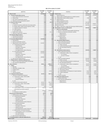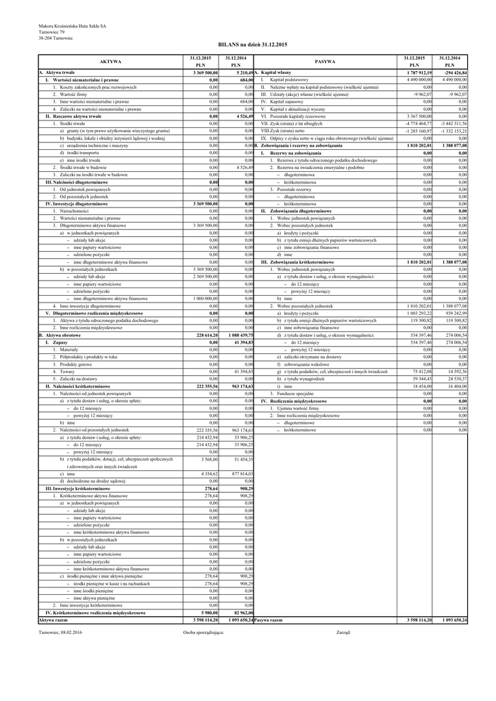 Makora Krośnieńska Huta Szkła SA Tarnowiec 79 38-204 Tarnowiec BILANS na dzień 31.12.2015 AKTYWA A. Aktywa trwałe 31.12.2015 31.12.2014 PLN PLN 3 369 500,00 31.12.2015 PASYWA PLN 5 210,49 A. Kapitał własny 0,00 684,00 I. Kapitał podstawowy 1. Koszty zakończonych prac rozwojowych 0,00 0,00 II. Należne wpłaty na kapitał podstawowy (wielkość ujemna) 2. Wartość firmy 0,00 0,00 III. Udziały (akcje) własne (wielkość ujemna) 3. Inne wartości niematerialne i prawne 0,00 684,00 4. Zaliczki na wartości niematerialne i prawne 0,00 0,00 0,00 4 526,49 0,00 0,00 a) grunty (w tym prawo użytkowania wieczystego gruntu) 0,00 b) budynki, lokale i obiekty inżynierii lądowej i wodnej 0,00 c) urządzenia techniczne i maszyny 0,00 0,00 B. Zobowiązania i rezerwy na zobowiązania d) środki transportu 0,00 0,00 e) inne środki trwałe 0,00 0,00 2. Środki trwałe w budowie 0,00 4 526,49 3. Zaliczki na środki trwałe w budowie 0,00 0,00 – 0,00 0,00 – 1. Od jednostek powiązanych 0,00 0,00 2. Od pozostałych jednostek 0,00 0,00 – IV. Inwestycje długoterminowe 3 369 500,00 0,00 0,00 – 0,00 0,00 3 369 500,00 0,00 0,00 0,00 – udziały lub akcje 0,00 – inne papiery wartościowe I. Wartości niematerialne i prawne II. Rzeczowe aktywa trwałe 1. Środki trwałe 31.12.2014 PLN 1 787 912,19 -294 426,84 4 490 000,00 4 490 000,00 0,00 0,00 -9 962,07 -9 962,07 IV. Kapitał zapasowy 0,00 0,00 V. Kapitał z aktualizacji wyceny 0,00 0,00 VI. Pozostałe kapitały rezerwowe 3 367 500,00 0,00 VII. Zysk (strata) z lat ubiegłych -4 774 464,77 -3 442 311,56 0,00 VIII.Zysk (strata) netto -1 285 160,97 -1 332 153,21 0,00 IX. Odpisy z zysku netto w ciągu roku obrotowego (wielkość ujemna) 0,00 0,00 1 810 202,01 1 388 077,08 Rezerwy na zobowiązania 0,00 0,00 1. Rezerwa z tytułu odroczonego podatku dochodowego 0,00 0,00 2. Rezerwa na świadczenia emerytalne i podobne 0,00 0,00 długoterminowa 0,00 0,00 krótkoterminowa 0,00 0,00 0,00 0,00 długoterminowa 0,00 0,00 krótkoterminowa 0,00 0,00 0,00 0,00 1. Wobec jednostek powiązanych 0,00 0,00 2. Wobec pozostałych jednostek 0,00 0,00 a) kredyty i pożyczki 0,00 0,00 0,00 b) z tytułu emisji dłużnych papierów wartościowych 0,00 0,00 0,00 0,00 c) inne zobowiązania finansowe 0,00 0,00 – udzielone pożyczki 0,00 0,00 d) inne 0,00 0,00 – inne długoterminowe aktywa finansowe 0,00 0,00 III. Zobowiązania krótkoterminowe 1 810 202,01 1 388 077,08 3 369 500,00 0,00 1. Wobec jednostek powiązanych 0,00 0,00 2 369 500,00 0,00 0,00 0,00 – inne papiery wartościowe 0,00 0,00 – do 12 miesięcy 0,00 0,00 – udzielone pożyczki 0,00 0,00 – powyżej 12 miesięcy 0,00 0,00 1 000 000,00 0,00 0,00 0,00 III. Należności długoterminowe 1. Nieruchomości 2. Wartości niematerialne i prawne 3. Długoterminowe aktywa finansowe a) w jednostkach powiązanych b) w pozostałych jednostkach – udziały lub akcje – inne długoterminowe aktywa finansowe 4. Inne inwestycje długoterminowe 0,00 I. 3. Pozostałe rezerwy II. Zobowiązania długoterminowe a) z tytułu dostaw i usług, o okresie wymagalności: b) inne 2. Wobec pozostałych jednostek 0,00 0,00 a) kredyty i pożyczki 1. Aktywa z tytułu odroczonego podatku dochodowego 0,00 0,00 b) z tytułu emisji dłużnych papierów wartościowych 2. Inne rozliczenia międzyokresowe 0,00 0,00 c) inne zobowiązania finansowe 228 614,20 1 088 439,75 V. Długoterminowe rozliczenia międzyokresowe B. Aktywa obrotowe I. Zapasy d) z tytułu dostaw i usług, o okresie wymagalności: – do 12 miesięcy 0,00 0,00 1 810 202,01 1 388 077,08 1 003 293,22 939 242,99 119 300,82 119 300,82 0,00 0,00 534 397,46 274 006,54 534 397,46 274 006,54 0,00 0,00 0,00 0,00 41 394,83 1. Materiały 0,00 0,00 2. Półprodukty i produkty w toku 0,00 0,00 e) zaliczki otrzymane na dostawy 0,00 3. Produkty gotowe 0,00 0,00 f) zobowiązania wekslowe 0,00 0,00 4. Towary 0,00 41 394,83 g) z tytułu podatków, ceł, ubezpieczeń i innych świadczeń 75 412,08 14 592,36 h) z tytułu wynagrodzeń 59 344,43 24 530,37 i) inne 18 454,00 16 404,00 0,00 0,00 5. Zaliczki na dostawy – powyżej 12 miesięcy 0,00 0,00 222 355,56 963 174,63 0,00 0,00 0,00 0,00 IV. Rozliczenia międzyokresowe 0,00 0,00 – do 12 miesięcy 0,00 0,00 1. Ujemna wartość firmy 0,00 0,00 – powyżej 12 miesięcy 0,00 0,00 2. Inne rozliczenia międzyokresowe 0,00 0,00 0,00 0,00 – długoterminowe 0,00 0,00 222 355,56 963 174,63 – krótkoterminowe 0,00 0,00 214 432,94 33 906,25 214 432,94 33 906,25 3 598 114,20 1 093 650,24 II. Należności krótkoterminowe 1. Należności od jednostek powiązanych a) z tytułu dostaw i usług, o okresie spłaty: b) inne 2. Należności od pozostałych jednostek a) z tytułu dostaw i usług, o okresie spłaty: – do 12 miesięcy – powyżej 12 miesięcy b) z tytułu podatków, dotacji, ceł, ubezpieczeń społecznych 0,00 0,00 3 568,00 51 454,35 4 354,62 877 814,03 3. Fundusze specjalne i zdrowotnych oraz innych świadczeń c) inne d) dochodzone na drodze sądowej 0,00 0,00 278,64 908,29 278,64 908,29 0,00 0,00 – udziały lub akcje 0,00 0,00 – inne papiery wartościowe 0,00 0,00 – udzielone pożyczki 0,00 0,00 – inne krótkoterminowe aktywa finansowe 0,00 0,00 0,00 0,00 – udziały lub akcje 0,00 0,00 – inne papiery wartościowe 0,00 0,00 – udzielone pożyczki 0,00 0,00 – inne krótkoterminowe aktywa finansowe 0,00 0,00 278,64 908,29 III. Inwestycje krótkoterminowe 1. Krótkoterminowe aktywa finansowe a) w jednostkach powiązanych b) w pozostałych jednostkach c) środki pieniężne i inne aktywa pieniężne – środki pieniężne w kasie i na rachunkach 278,64 908,29 – inne środki pieniężne 0,00 0,00 – inne aktywa pieniężne 0,00 0,00 2. Inne inwestycje krótkoterminowe IV. Krótkoterminowe rozliczenia międzyokresowe Aktywa razem Tarnowiec, 08.02.2016 0,00 0,00 5 980,00 82 962,00 3 598 114,20 Osoba sporządzająca: 1 093 650,24 Pasywa razem Zarząd: Makora Krośnieńska Huta Szkła SA Tarnowiec 79 38-204 Tarnowie