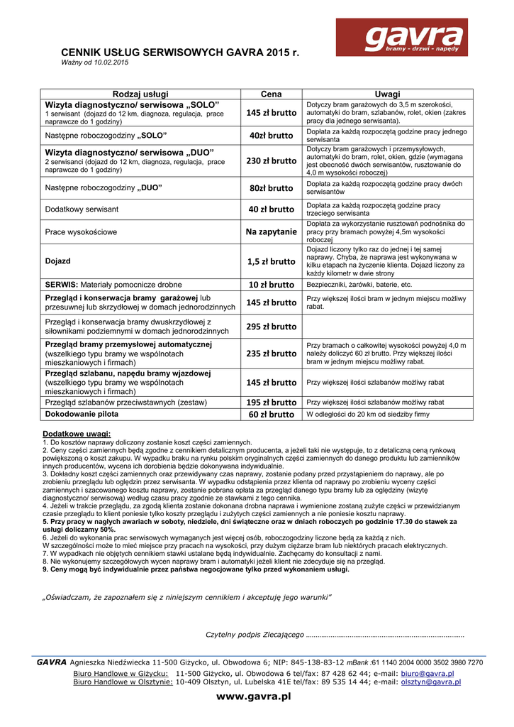 CENNIK USŁUG SERWISOWYCH GAVRA 2015 r.