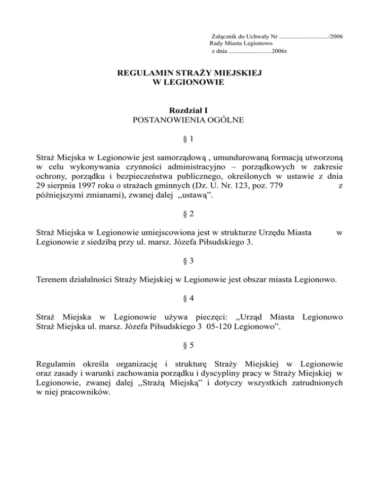 Załącznik do Uchwały Nr .............................../2006 Rady Miasta Legionowo z dnia ...........................2006r. REGULAMIN STRAŻY MIEJSKIEJ W LEGIONOWIE Rozdział I POSTANOWIENIA OGÓLNE §1 Straż Miejska w Legionowie jest samorządową , umundurowaną formacją utworzoną w celu wykonywania czynności administracyjno – porządkowych w zakresie ochrony, porządku i bezpieczeństwa publicznego, określonych w ustawie z dnia 29 sierpnia 1997 roku o strażach gminnych (Dz. U. Nr. 123, poz. 779 z późniejszymi zmianami), zwanej dalej ,,ustawą”. §2 Straż Miejska w Legionowie umiejscowiona jest w strukturze Urzędu Miasta Legionowie z siedzibą przy ul. marsz. Józefa Piłsudskiego 3. w §3 Terenem działalności Straży Miejskiej w Legionowie jest obszar miasta Legionowo. §4 Straż Miejska w Legionowie używa pieczęci: ,,Urząd Miasta Legionowo Straż Miejska ul. marsz. Józefa Piłsudskiego 3 05-120 Legionowo”. §5 Regulamin określa organizację i strukturę Straży Miejskiej w Legionowie oraz zasady i warunki zachowania porządku i dyscypliny pracy w Straży Miejskiej w Legionowie, zwanej dalej ,,Strażą Miejską” i dotyczy wszystkich zatrudnionych w niej pracowników. Rozdział II ORGANIZACJA I STRUKTURA STRAŻY MIEJSKIEJ §6 Straż Miejska stanowi komórkę organizacyjną Urzędu Miasta Legionowo. §7 1.W Straży Miejskiej tworzy się stanowiska urzędnicze Straży Miejskiej: 1)Komendant Straży Miejskiej zwany dalej ,,Komendantem”, 2)Dwóch Zastępców Komendanta Straży Miejskiej zwanych dalej ,,Zastępcą Komendanta” 3)Starszy Inspektor, 4)Inspektor, 5)Młodszy Inspektor, 6)Starszy Strażnik, 7)Strażnik, 8)Młodszy Strażnik. 2.W Straży Miejskiej tworzy się inne stanowiska urzędnicze: Referent (Podinspektor, Inspektor). §8 Strażą kieruje Komendant powoływany i odwoływany przez Prezydenta Miasta Legionowo zwanego dalej ,,Prezydentem”, po zasięgnięciu opinii Komendanta Wojewódzkiego Policji Województwa Mazowieckiego. §9 Przełożonym Komendanta jest Prezydent. § 10 Komendant i dwaj Zastępcy Komendanta są pracownikami na stanowiskach kierowniczych w Urzędzie Miasta Legionowo. § 11 1. Komendant jest zobowiązany do składania Prezydentowi informacji o stanie porządku publicznego w gminie raz w miesiącu. 2. O ważnych wydarzeniach mających wpływ na stan bezpieczeństwa i porządku publicznego Komendant informuje Prezydenta niezwłocznie. Rozdział III ZADANIA STRAŻY MIEJSKIEJ § 12 Do zadań Straży Miejskiej należy w szczególności: 1) ochrona spokoju i porządku w miejscach publicznych, 2) czuwanie nad porządkiem i kontrola ruchu drogowego – w zakresie określonym w przepisach Ustawy Prawo o ruchu drogowym z dnia 20.06.1997r. Dz. U. Nr 98, poz. 602 z późniejszymi zmianami, ze szczególnym uwzględnieniem prawidłowości parkowań pojazdów i kontrola prędkości poruszających się pojazdów przy użyciu fotoradaru, 3) współdziałanie z właściwymi podmiotami w zakresie ratowania życia i zdrowia obywateli, pomocy w usuwaniu awarii technicznych i skutków klęsk żywiołowych oraz innych miejscowych zagrożeń, 4) zabezpieczenie miejsca przestępstwa, katastrofy lub innego podobnego zdarzenia albo miejsc zagrożonych takim zdarzeniem przed dostępem osób postronnych lub zniszczeniem śladów i dowodów, do momentu przybycia właściwych służb, a także ustalenie w miarę możliwości świadków zdarzenia, 5) ochrona obiektów komunalnych i urządzeń użyteczności publicznej, 6) współdziałanie z organizatorami i innymi służbami w ochronie porządku podczas zgromadzeń i imprez publicznych, 7) doprowadzenie osób nietrzeźwych do izby wytrzeźwień lub miejsca ich zamieszkania, jeżeli osoby te zachowaniem swoim dają powód do zgorszenia w miejscu publicznym, znajdują się w okolicznościach zagrażających ich życiu lub zdrowiu albo zagrażają życiu i zdrowiu innych osób, 8) informowanie społeczności lokalnej o stanie i rodzajach zagrożeń, a także inicjowanie i uczestnictwo w działaniach mających na celu zapobieganie popełnianiu przestępstw i wykroczeń oraz zjawiskom kryminogennym i współdziałanie w tym zakresie z organami państwowymi, samorządowymi i organizacjami społecznymi, 9) konwojowanie dokumentów, przedmiotów wartościowych lub wartości pieniężnych dla potrzeb Urzędu Miasta Legionowo oraz gminnych jednostek organizacyjnych, na ich wniosek za zgodą Prezydenta, 10)kontrolowanie utrzymania czystości porządku na terenie gminy ze szczególnym uwzględnieniem Regulaminu utrzymania czystości porządku uchwalonego przez Radę Miasta Legionowo, 11)bezpośredni nadzór nad tym, aby w obrocie publicznym i czynnościach urzędowych używano przyrządów pomiarowych mających ważne cechy lub świadectwa legalizacji, 12)kontrola miejsc targowych i sprzedaży zgodnie z regulaminem targowiska z uwzględnieniem przepisów sanitarnych oraz kontrola sprzątania śmieci na targowisku i wokół niego, 13)kontrola opłat targowych, 14)podejmowanie interwencji dotyczącej bezpańskich i agresywnych psów stanowiących zagrożenie dla mieszkańców oraz wobec właścicieli psów wyprowadzających je bez smyczy, kagańca i zanieczyszczające miejsca publiczne, 15)obserwacje sklepów spożywczo – monopolowych pod kątem przestrzegania ustawy ,,O wychowaniu w trzeźwości i przeciwdziałaniu alkoholizmowi”, 16)podejmowanie interwencji wobec wadliwie działającego oświetlenia ulicznego, stanu technicznego dróg i znaków drogowych, 17)prowadzenie w szkołach akcji ,,Bezpieczna droga do szkoły” - szkolenie dzieci i młodzieży, 18)wystawianie posterunków stałych przy przejściach przez jezdnię w pobliżu szkół w celu zapewnienia bezpieczeństwa dzieciom w drodze do szkoły, 19)kontrola spokoju i porządku publicznego w miejscach najbardziej zagrożonych szczególnie w pobliżu szkół, budynków komunalnych i osiedli mieszkaniowych samodzielnie oraz przy ścisłej współpracy z Poli
