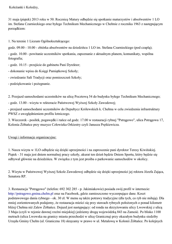 Koleżanki i Koledzy, 31 maja (piątek) 2013 roku w 50. Rocznicę Matury odbędzie się spotkanie maturzystów i absolwentów 1 LO im. Stefana Czarnieckiego oraz byłego Technikum Mechanicznego w Chełmie z rocznika 1963 z następującym porządkiem: 1. Na terenie 1 Liceum Ogólnokształcącego: godz. 09.00 - 10.00 - zbiórka absolwentów na dziedzińcu 1 LO im. Stefana Czarnieckiego (pod czaplą); - godz. 10.00 - powitanie uczestników spotkania, zapoznanie z aktualnym planem, komunikaty, wspólna fotografia; - godz. 10.15 - przejście do gabinetu Pani Dyrektor; - dokonanie wpisu do Księgi Pamiątkowej Szkoły; - zwiedzanie Sali Tradycji oraz pomieszczeń Szkoły; - podziękowanie i pożegnanie. 2. Przejazd samochodami uczestników na ulicę Pocztową 54 do budynku byłego Technikum Mechanicznego; - godz. 13.00 - wizyta w rektoracie Państwowej Wyższej Szkoły Zawodowej; - przejazd samochodami uczestników do Depułtycz Królewskich k. Chełma w celu zwiedzenia infrastruktury PWSZ z uwzględnieniem profilu lotniczego. 3. Wieczorek - posiłek, pogawędki i tańce od godz. 17.00 w restauracji rybnej "Pstrągowo", ulica Pstrągowa 17, Kolonia Żółtańce przy muzyce Człowieka Orkiestry czyli Janusza Prętkiewicza. Uwagi i informacje organizacyjne: 1. Nasza wizyta w 1LO odbędzie się dzięki uprzejmości i na zaproszenie pani dyrektor Teresy Kiwińskiej. Piątek - 31 maja jest dniem normalnej pracy szkoły, akurat ten dzień będzie Dniem Sportu, który będzie się odbywał głównie na dziedzińcu. W związku z tym jest prośba o parkowanie samochodów w okolicy. 2. Wizyta w Państwowej Wyższej Szkole Zawodowej odbędzie się dzięki uprzejmości jej rektora Józefa Zająca, Senatora RP. 3. Restauracja "Pstrągowo" (telefon: 692 302 285 - p. Jakimiakowie) posiada swój profil w internecie: http://pstragowo.gmina.chelm.pl oraz na Facebook, gdzie zamieszczono wyczerpujące dane. Koszt podstawowego dania rybnego - ok. 30 zł. W menu są także potrawy tradycyjne (dla tych, co ryb nie miłują). Dla mniej zorientowanych podajemy, że restauracja mieści się przy stawach rybnych położonych o ponad kilometr bliżej Chełma niż Zalew Żółtańce. Dojazd jest następujący: od ronda na skrzyżowaniu ulicy Lwowskiej z ulicą 3 Maja (czyli w rejonie dawnej rzeźni miejskiej) jedziemy drogą wojewódzką 843 na Zamość. Po blisko 1100 metrach (ulica Lwowska na granicy miasta przechodzi w ulicę Graniczną) przy okazałym budynku siedziby Urzędu Gminy Chełm (ul. Graniczna 18) skręcamy w prawo w ul. Metalową w Kolonii Żółtańce. Po kolejnych 1100 metrach (w tym mijamy mostek na Uherce) skręcamy w lewo, w drogę bez nazwy, aby po 800 metrach dojechać do ulicy Pstrągowej. I stąd już tylko 300 m do restauracji. 4. Wszystkie przejazdy będą dokonywane samochodami prywatnymi uczestników spotkania, stąd prośba do właścicieli aut o zabieranie osób bez własnego transportu, a także o zapobiegliwość w wykorzystaniu środków lokomocji chełmskich krewnych i znajomych. 5. Nie tworzymy listy obecności ani nie zbieramy składek. Osoby towarzyszące absolwentom bardzo mile widziane. W restauracji każdy sam składa zamówienie i sam je opłaca. W związku z taką organizacją tej części spotkania właściciele restauracji proszą o wcześniejsze podanie ogólnej liczby biesiadników, aby móc odpowiednio przygotować zapasy jadła oraz ewentualnie zwiększyć obsługę kelnerską. Doprecyzowanie liczby osób planujących udział w wieczorku nastąpi pod czaplą - 31 maja o godz. 10.00. Proszę więc o zgłoszenia (nazwisko plus liczba osób) chętnych do udziału w wieczorku na mój adres poczty internetowej: [email protected] lub też SMS-em na mój tel. komórkowy - 696 535 463 (można też do mnie ewentualnie zadzwonić). Spotkanie zostało przygotowane przez grupę inicjatywną w składzie: Agata (z d. Raczyńska) i Bogdan Biernatowie (Bogdan - absolwent Technikum Mechanicznego, matura 1963); Janusz Prętkiewicz oraz Leszek Duniec przy współdziałaniu osób wspierających: Ola Stanisławska, Danusia Dąbrowska-Nawrocka oraz Ania Białowiejska-Kosińska.