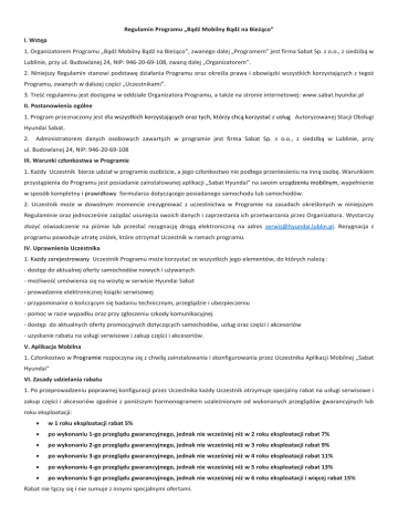 Regulamin Programu „Bądź Mobilny Bądź na Bieżąco” I. Wstęp 1. Organizatorem Programu „Bądź Mobilny Bądź na Bieżąco”, zwanego dalej „Programem” jest firma Sabat Sp. z o.o., z siedzibą w Lublinie, przy ul. Budowlanej 24, NIP: 946-20-69-108, zwaną dalej „Organizatorem”. 2. Niniejszy Regulamin stanowi podstawę działania Programu oraz określa prawa i obowiązki wszystkich korzystających z tegoż Programu, zwanych w dalszej części „Uczestnikami”. 3. Treść regulaminu jest dostępna w oddziale Organizatora Programu, a także na stronie internetowej: www.sabat.hyundai.pl II. Postanowienia ogólne 1. Program przeznaczony jest dla wszystkich korzystających oraz tych, którzy chcą korzystać z usług Autoryzowanej Stacji Obsługi Hyundai Sabat. 2. Administratorem danych osobowych zawartych w programie jest firma Sabat Sp. z o.o., z siedzibą w Lublinie, przy ul. Budowlanej 24, NIP: 946-20-69-108 III. Warunki członkostwa w Programie 1. Każdy Uczestnik bierze udział w programie osobiście, a jego członkostwo nie podlega przeniesieniu na inną osobę. Warunkiem przystąpienia do Programu jest posiadanie zainstalowanej aplikacji „Sabat Hyundai” na swoim urządzeniu mobilnym, wypełnienie w sposób kompletny i prawidłowy formularza dotyczącego posiadanego samochodu lub samochodów. 2. Uczestnik może w dowolnym momencie zrezygnować z uczestnictwa w Programie na zasadach określonych w niniejszym Regulaminie oraz jednocześnie zażądać usunięcia swoich danych i zaprzestania ich przetwarzania przez Organizatora. Wystarczy złożyć oświadczenie na piśmie lub przesłać rezygnację drogą elektroniczną na adres [email protected]. Rezygnacja z programu powoduje utratę zniżek, które otrzymał Uczestnik w ramach programu. IV. Uprawnienia Uczestnika 1. Każdy zarejestrowany Uczestnik Programu może korzystać ze wszystkich jego elementów, do których należą : - dostęp do aktualnej oferty samochodów nowych i używanych - możliwość umówienia się na wizytę w serwisie Hyundai Sabat - prowadzenie elektronicznej książki serwisowej - przypominanie o kończącym się badaniu technicznym, przeglądzie i ubezpieczeniu - pomoc w razie wypadku oraz przy zgłoszeniu szkody komunikacyjnej - dostęp do aktualnych oferty promocyjnych dotyczących samochodów, usług oraz części i akcesoriów - uzyskanie rabatu na usługi serwisowe i zakup części i akcesoriów. V. Aplikacja Mobilna 1. Członkostwo w Programie rozpoczyna się z chwilą zainstalowania i skonfigurowania przez Uczestnika Aplikacji Mobilnej „Sabat Hyundai” VI. Zasady udzielania rabatu 1. Po przeprowadzeniu poprawnej konfiguracji przez Uczestnika każdy Uczestnik otrzymuje specjalny rabat na usługi serwisowe i zakup części i akcesoriów zgodnie z poniższym harmonogramem uzależnionym od wykonanych przeglądów gwarancyjnych lub roku eksploatacji: w 1 roku eksploatacji rabat 5% po wykonaniu 1-go przeglądu gwarancyjnego, jednak nie wcześniej niż w 2 roku eksploatacji rabat 7% po wykonaniu 2-go przeglądu gwarancyjnego, jednak nie wcześniej niż w 3 roku eksploatacji rabat 9% po wykonaniu 3-go przeglądu gwarancyjnego, jednak nie wcześniej niż w 4 roku eksploatacji rabat 11% po wykonaniu 4-go przeglądu gwarancyjnego, jednak nie wcześniej niż w 5 roku eksploatacji rabat 13% po wykonaniu 5-go przeglądu gwarancyjnego, jednak nie wcześniej niż w 6 roku eksploatacji i więcej rabat 15% Rabat nie łączy się i nie sumuje z innymi specjalnymi ofertami. 2. Udzielenie rabatu jest możliwe tylko wtedy gdy Uczestnik przy wizycie w serwisie, przed dokonaniem płatności okaże zainstalowaną aplikację z właściwie wprowadzonym samochodem. Po dokonaniu transakcji za pomocą karty płatniczej i/lub wydrukowaniu paragonu fiskalnego udzielenie rabatu nie jest możliwe. Z tego tytułu Uczestnik nie może rościć żadnych pretensji ani żądać jakiejkolwiek rekompensaty od Organizatora. VII. Dane członkowskie, ochrona danych i prywatność Uczestników Programu. 1. Wszelkie dane dotyczące członkostwa oraz informacje przedstawione przez Uczestników Programu traktowane będą przez Organizatora w sposób zgodny z zasadami zawartymi w niniejszym Regulaminie. 2. Instalując aplikację Uczestnik: -wyraża zgodę na uczestnictwo w Programie „Bądź Mobilny Bądź na Bieżąco” -akceptuje wszystkie postanowienia niniejszego Regulaminu -wyraża zgodę na gromadzenie i przetwarzanie przez Organizatora danych -potwierdza autentyczność zawartych danych. 3. Każdy Uczestnik ma możliwość wglądu i aktualizacji danych osobowych dotyczących jego osoby i posiadanych samochodów, a także prawo do usunięcia danych w przypadku rezygnacji z uczestnictwa. 4. Organizator może z własnej inicjatywy uzupełnić, sprostować lub też usunąć jakiekolwiek niepełne, niezgodne lub nieaktualne dane osobowe przechowywane w związku z działalnością Programu. VIII. Ograniczenie odpowiedzialności i ograniczona gwarancja 1. Organizator nie ponosi odpowiedzialności za okresowy brak dostępu do stron internetowych Programu, a także nie odpowiada za opóźnienia, utratę danych ani za szkody powstałe w wyniku zainstalowania aplikacji. IX. Inne postanowienia 1. Organizator ma w każdym czasie prawo do dokonania zmian lub modyfikacji Programu a także wycofania dostępu do jego usług bez lub za wcześniejszym powiadomieniem Uczestników nie ponosząc za to odpowiedzialności, chyba że warunki i zasady dotyczące określonej usługi stanowią inaczej. 2. Nieważność któregokolwiek z postanowień niniejszego regulaminu nie wyłącza stosowania pozostałych postanowień. W miejsce nieważnego postanowienia stosowany będzie ważny przepis, którego znaczenie jest najbliższe celom i efektom funkcjonowania niniejszych postanowień Regulaminu. 3. Niniejsze postanowienia Regulaminu nie wyłączają ani nie ograniczają ustawowych praw Uczestników. X. Zmiany regulaminu 1. Niniejszy regulamin obow