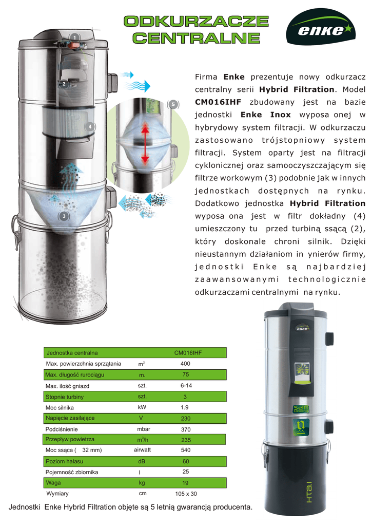O D K U R Z A C Z E C E N T R A L N E Firma Enke prezentuje nowy odkurzacz centralny serii Hybrid Filtration. Model CM016IHF jednostki zbudowany Enke Inox jest na bazie wyposażonej w hybrydowy system filtracji. W odkurzaczu zastosowano trójstopniowy system filtracji. System oparty jest na filtracji cyklonicznej oraz samooczyszczającym się filtrze workowym (3) podobnie jak w innych jednostkach dostępnych na rynku. Dodatkowo jednostka Hybrid Filtration wyposażona jest w filtr dokładny (4) umieszczony tuż przed turbiną ssącą (2), który doskonale chroni silnik. Dzięki nieustannym działaniom inżynierów firmy, jednostki Enke zaawansowanymi są najbardziej technologicznie odkurzaczami centralnymi na rynku. CM016IHF Jednostka centralna Max. powierzchnia sprzątania m2 400 Max. długość rurociągu m. 75 Max. ilość gniazd szt. 6-14 Stopnie turbiny szt. 3 Moc silnika kW 1.9 Napięcie zasilające V 230 Podciśnienie mbar 370 3 m /h 235 airwatt 540 Poziom hałasu dB 60 Pojemność zbiornika l 25 Waga kg 19 Wymiary cm 105 x 30 Przepływ powietrza Moc ssąca (O 32 mm) Jednostki Enke Hybrid Filtration objęte są 5 letnią gwarancją producenta.