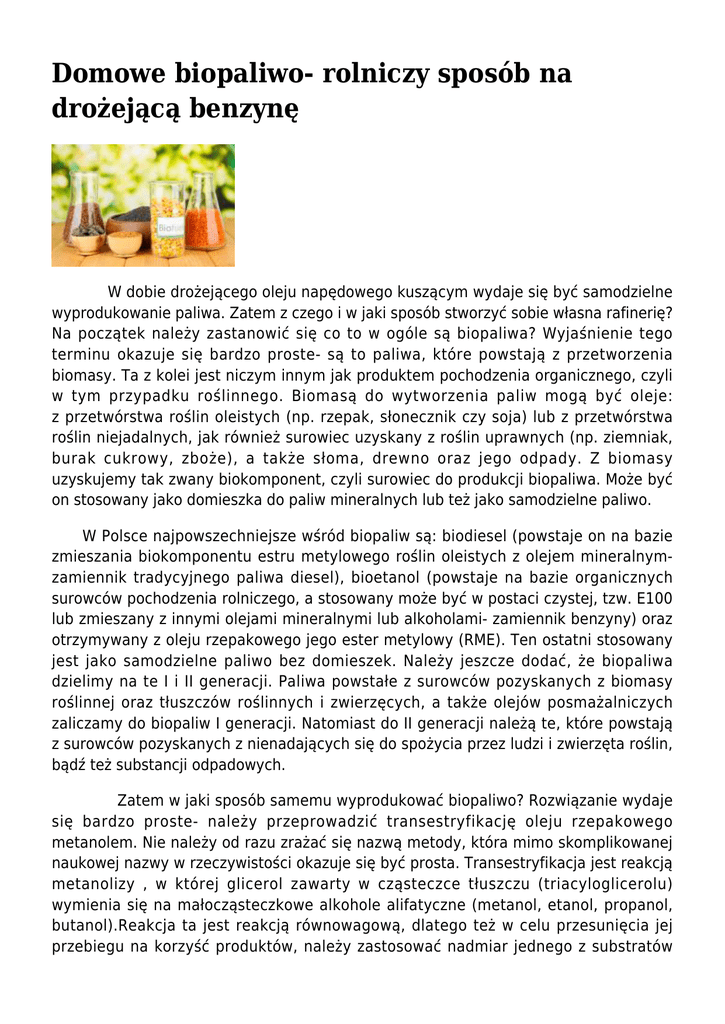 Domowe biopaliwo- rolniczy sposób na drożejącą benzynę W dobie drożejącego oleju napędowego kuszącym wydaje się być samodzielne wyprodukowanie paliwa. Zatem z czego i w jaki sposób stworzyć sobie własna rafinerię? Na początek należy zastanowić się co to w ogóle są biopaliwa? Wyjaśnienie tego terminu okazuje się bardzo proste- są to paliwa, które powstają z przetworzenia biomasy. Ta z kolei jest niczym innym jak produktem pochodzenia organicznego, czyli w tym przypadku roślinnego. Biomasą do wytworzenia paliw mogą być oleje: z przetwórstwa roślin oleistych (np. rzepak, słonecznik czy soja) lub z przetwórstwa roślin niejadalnych, jak również surowiec uzyskany z roślin uprawnych (np. ziemniak, burak cukrowy, zboże), a także słoma, drewno oraz jego odpady. Z biomasy uzyskujemy tak zwany biokomponent, czyli surowiec do produkcji biopaliwa. Może być on stosowany jako domieszka do paliw mineralnych lub też jako samodzielne paliwo. W Polsce najpowszechniejsze wśród biopaliw są: biodiesel (powstaje on na bazie zmieszania biokomponentu estru metylowego roślin oleistych z olejem mineralnymzamiennik tradycyjnego paliwa diesel), bioetanol (powstaje na bazie organicznych surowców pochodzenia rolniczego, a stosowany może być w postaci czystej, tzw. E100 lub zmieszany z innymi olejami mineralnymi lub alkoholami- zamiennik benzyny) oraz otrzymywany z oleju rzepakowego jego ester metylowy (RME). Ten ostatni stosowany jest jako samodzielne paliwo bez domieszek. Należy jeszcze dodać, że biopaliwa dzielimy na te I i II generacji. Paliwa powstałe z surowców pozyskanych z biomasy roślinnej oraz tłuszczów roślinnych i zwierzęcych, a także olejów posmażalniczych zaliczamy do biopaliw I generacji. Natomiast do II generacji należą te, które powstają z surowców pozyskanych z nienadających się do spożycia przez ludzi i zwierzęta roślin, bądź też substancji odpadowych. Zatem w jaki sposób samemu wyprodukować biopaliwo? Rozwiązanie wydaje się bardzo proste- należy przeprowadzić transestryfikację oleju rzepakowego metanolem. Nie należy od razu zrażać się nazwą metody, która mimo skomplikowanej naukowej nazwy w rzeczywistości okazuje się być prosta. Transestryfikacja jest reakcją metanolizy , w której glicerol zawarty w cząsteczce tłuszczu (triacyloglicerolu) wymienia się na małocząsteczkowe alkohole alifatyczne (metanol, etanol, propanol, butanol).Reakcja ta jest reakcją równowagową, dlatego też w celu przesunięcia jej przebiegu na korzyść produktów, należy zastosować nadmiar jednego z substratów (zwykle alkoholu) albo przeprowadzać reakcję etapami, jednak wtedy trzeba po każdym etapie odbierać produkt uboczny (glicerol). Transestryfikacja w obecności alkoholów jako katalizatorów daje korzyści w postaci bardzo szybkiej reakcji (już w temperaturze pokojowej), a także możliwość odzyskania i oczyszczenia produktu ubocznego jakim jest gliceryna. Czy ta metoda jest w ogóle możliwa w warunkach domowych? Okazuje się, że tak. Przynajmniej tak przekonuje Przemysłowy Instytut Maszyn Rolniczych, który opatentował wytwórnię ekologicznego biodiesla. Produkcja paliwa w takim estryfikatotrze jest dziecinnie prosta i jest praktycznym odwzorowaniem wyżej opisanej przeze mnie metody reakcji chemicznej. Do estryfikatora wlewamy olej wytłoczony na prasie z różnych gatunków nasion roślin oleistych, np. rzepak, soja, len, lnianka i poddajemy powyższej reakcji w obecności katalizatora, w niskiej temperaturze. Rzecznik patentowy PIMR przekonuje, że koszt takiego paliwa to niecałe 4 zł/l przy wydajności na poziomie aż 33%; czyli ze 100 kg ziarna uzyskamy 33 litry paliwa. Metoda nie wydaje się tylko ciekawostką naukową, gdyż rolnicy z Podlasia przekonują, że już ją stosują. Rolnicy przeprowadzają rafinację nocą w celu zmniejszenia kosztów przeznaczanych na energię elektryczną. Podają także swój sposób produkcji, czyli 300 l oleju należy zmieszać z alkoholem metylowym i wodorotlenkiem potasu. Ten ostatni, posiadający zasadową naturę, jest potrzebny w celu zneutralizowania kwasowości oleju (inaczej doszłoby do uszkodzenia silnika). Alkohol metylowy powoduje wytrącanie produktów ubocznych (glicerolu). Po przeprowadzeniu reakcji odstawiamy wszystko przynajmniej na dobę, po tym czasie zlewamy olej znad gliceryny osadzającej się na dnie naczynia. Należy jednak także zapoznać się ze zdaniem krytyków produkcji biopaliw. Podnoszą oni kwestię bilansu energetycznego i ekologicznego całego przedsięwzięcia, który według niektórych szacunków jest gorszy w porównaniu z produkcją i spalaniem paliw kopalnych (np. węgiel kamienny, ropa naftowa). Do ważniejszych wskazywanych czynników należą stale powiększający się areał upraw, a co za tym idzie degradację środowiska, duże zużycie nawozów sztucznych a także nieracjonalne gospodarowanie produktami roślinnymi. Ten ostatni aspekt dotyczy w szczególności pogłębiania nędzy i głodu w krajach Trzeciego Świata, spowodowanego głównie produkcją roślinną nastawioną na wytwarzanie paliw zamiast na zaspokajanie potrzeb żywieniowych. Ponadto w krajach najbardziej rozwiniętych wzrost areału produkcji roślinnej uprawianej z przeznaczeniem na wyprodukowanie paliw, a co za tym idzie zmniejszenie powierzchni gruntów ornych roślin przeznaczonych na produkcję żywność spowodował podniesienie cen żywności. Czy zatem całe przedsięwzięcie jest w ogóle opłacalne? To zależy jak na to patrzymy. Każdy z nas sam musi odpowiedzieć sobie na kilka pytań: Czy ważniejsze jest dla niego środowisko naturalne? A może względy etyczne jeśli chodzi o przeznaczenie uprawianych roślin? A także czy chcemy wydawać mniej na paliwo a więcej na żywność, czy być może na odwrót? Na powyższym przykładzie możemy jednak stwierdzić, że każda decyzja niesie za sobą skutki nie tylko dla nas samych czy nasze